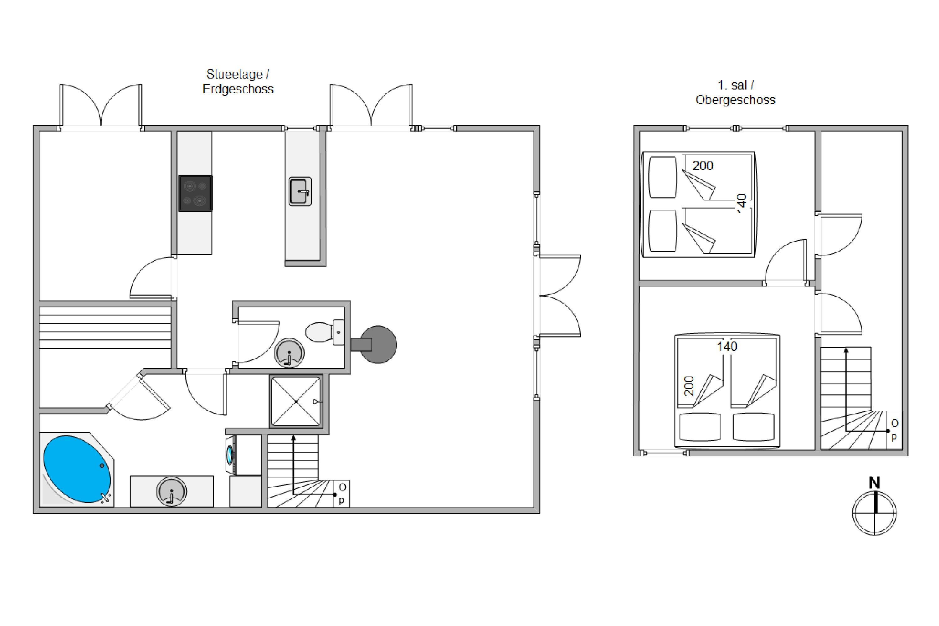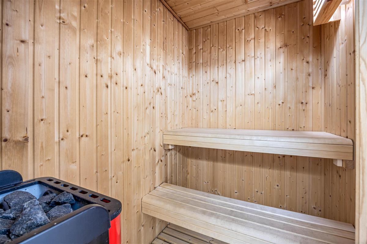 The adjoining kitchen comes equipped with a dishwasher. The ground-floor bathroom features both a whirlpool and a sauna for ultimate relaxation. The two bright bedrooms, each furnished with a double bed, are located on the first floor, accessible via stairs from the living area.