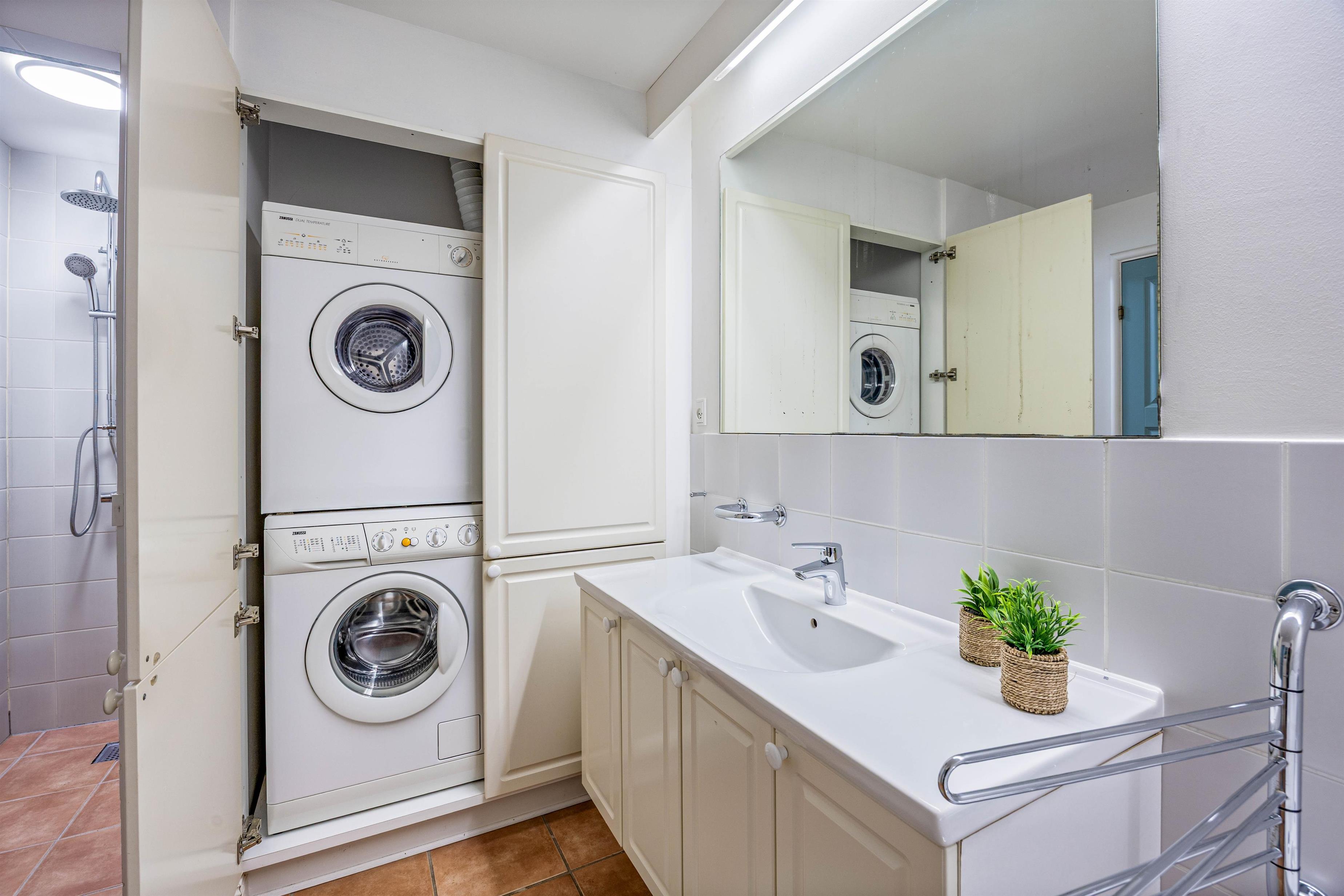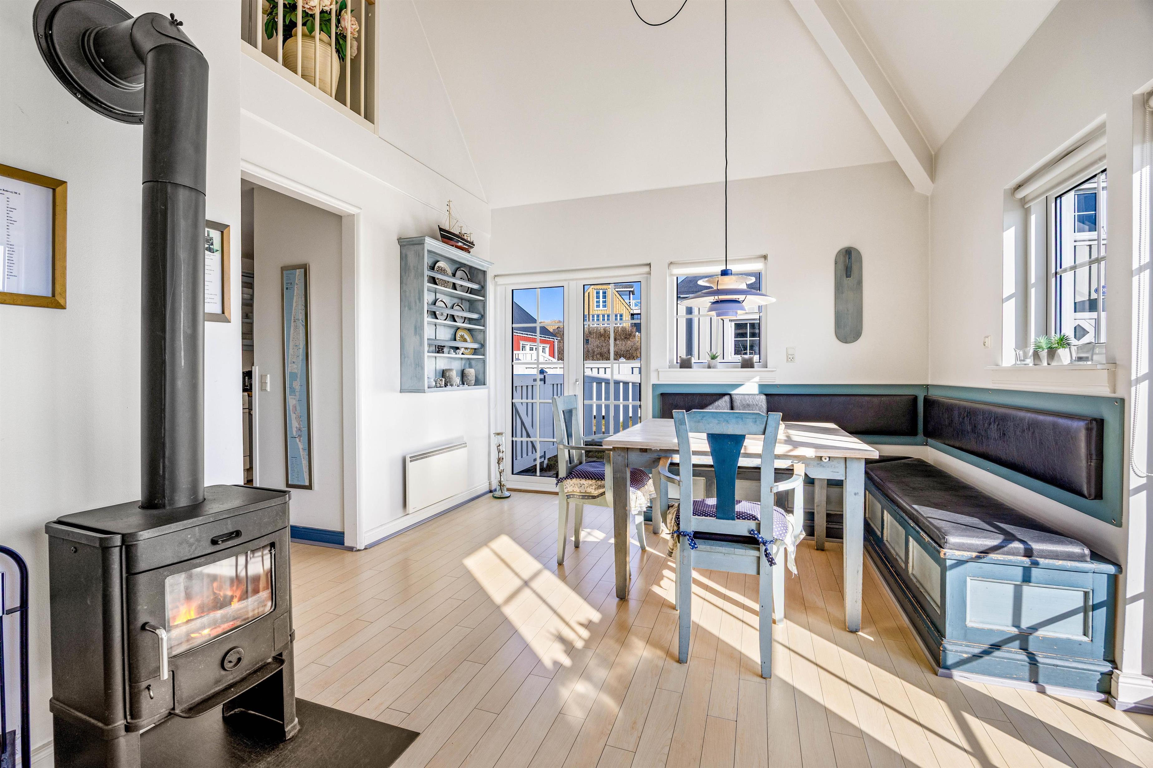 The apartment is part of a building comprising four units, each with its own entrance and enclosed terrace. On the ground floor, you'll find an open-plan living and dining area, furnished with a dining corner and a comfortable seating area. Here, you can enjoy time together while the flames flicker in the wood-burning stove.