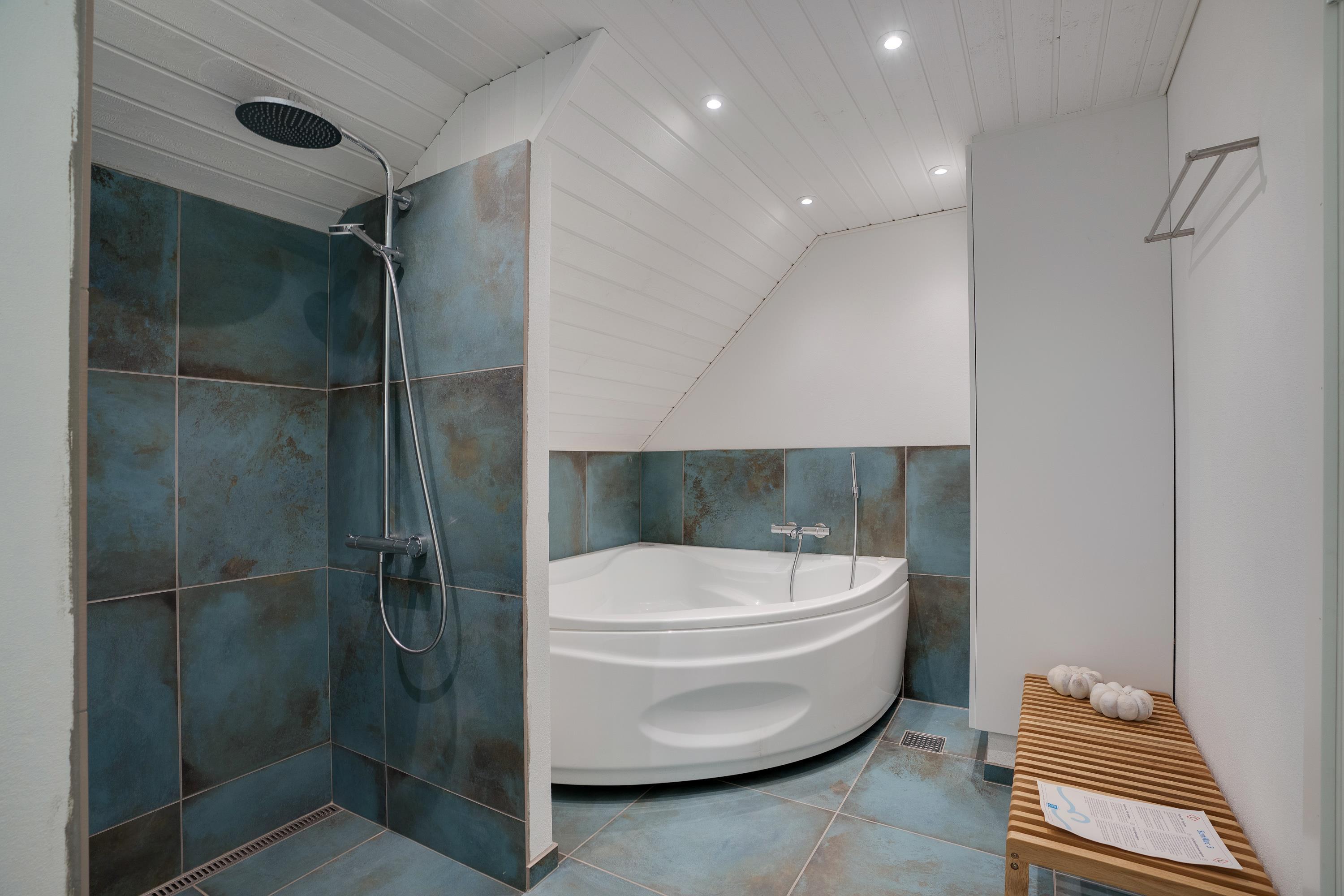 The bathrooms in the house have also been newly renovated and fitted with underfloor heating. In the larger bathroom, you'll find a tumble dryer and washing machine, so you only need to pack your favourite clothes. As an extra treat, the thatched cottage offers a sauna and a whirlpool, perfect for warming up after a long day in the fresh sea air.