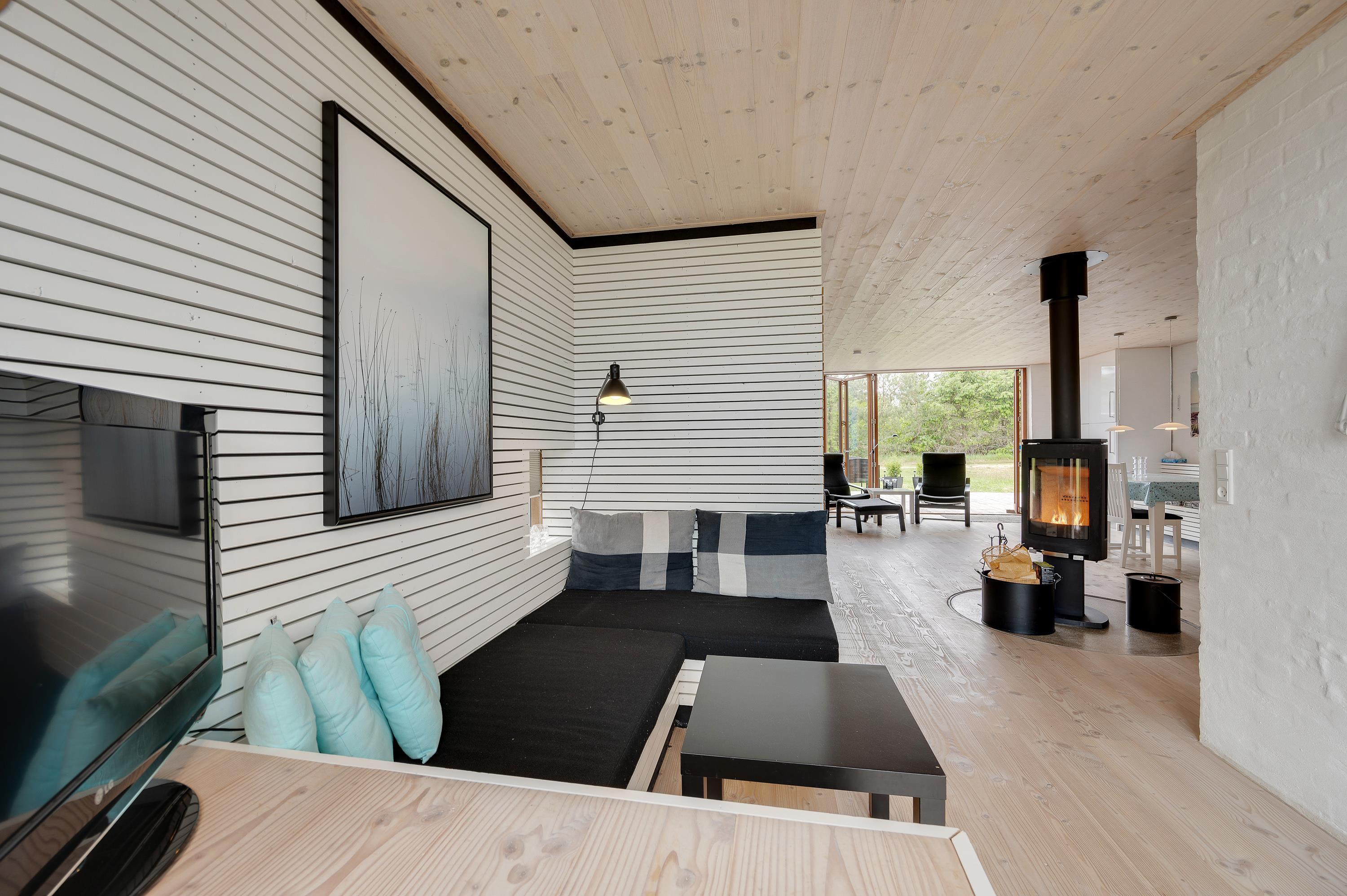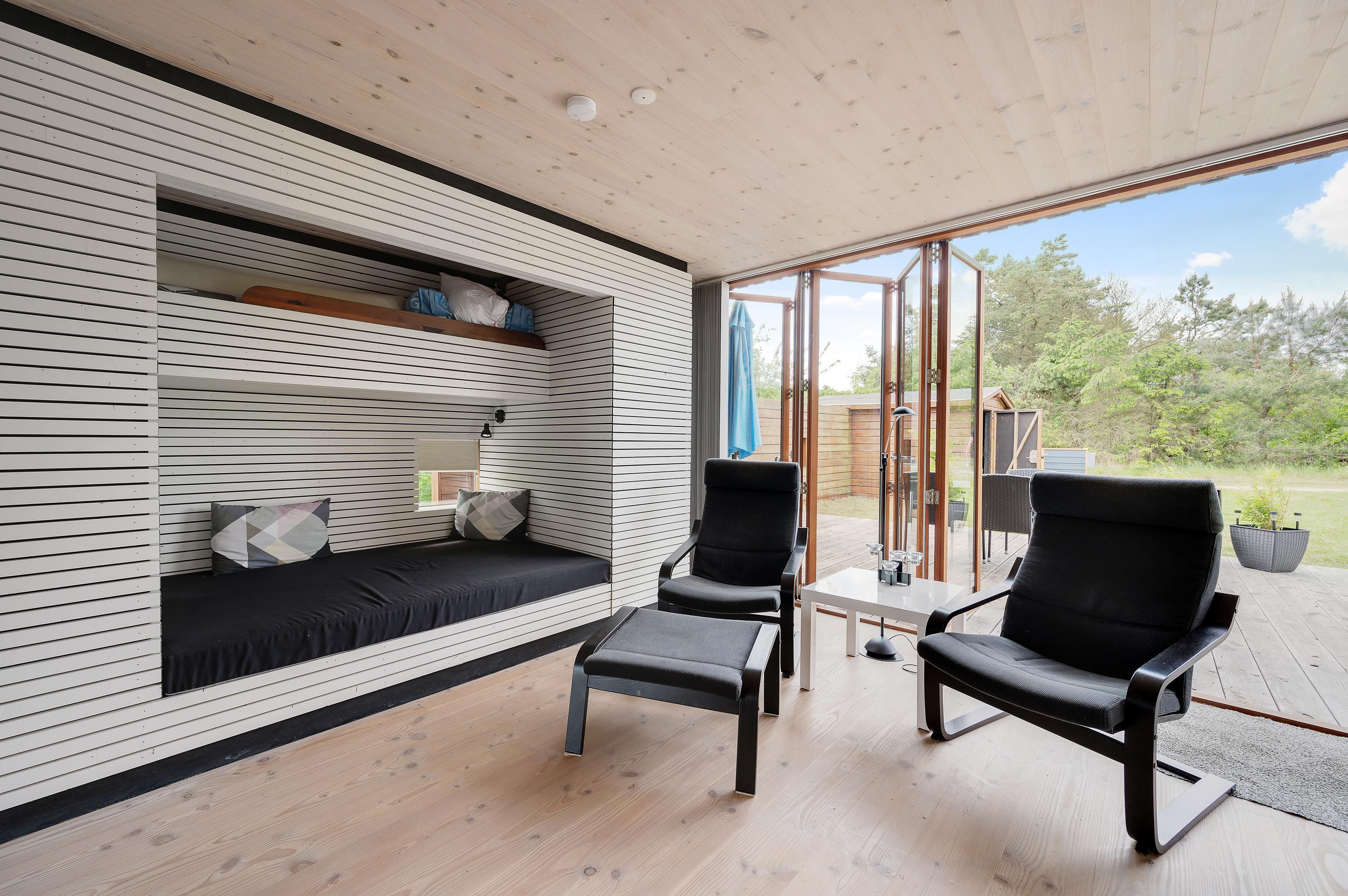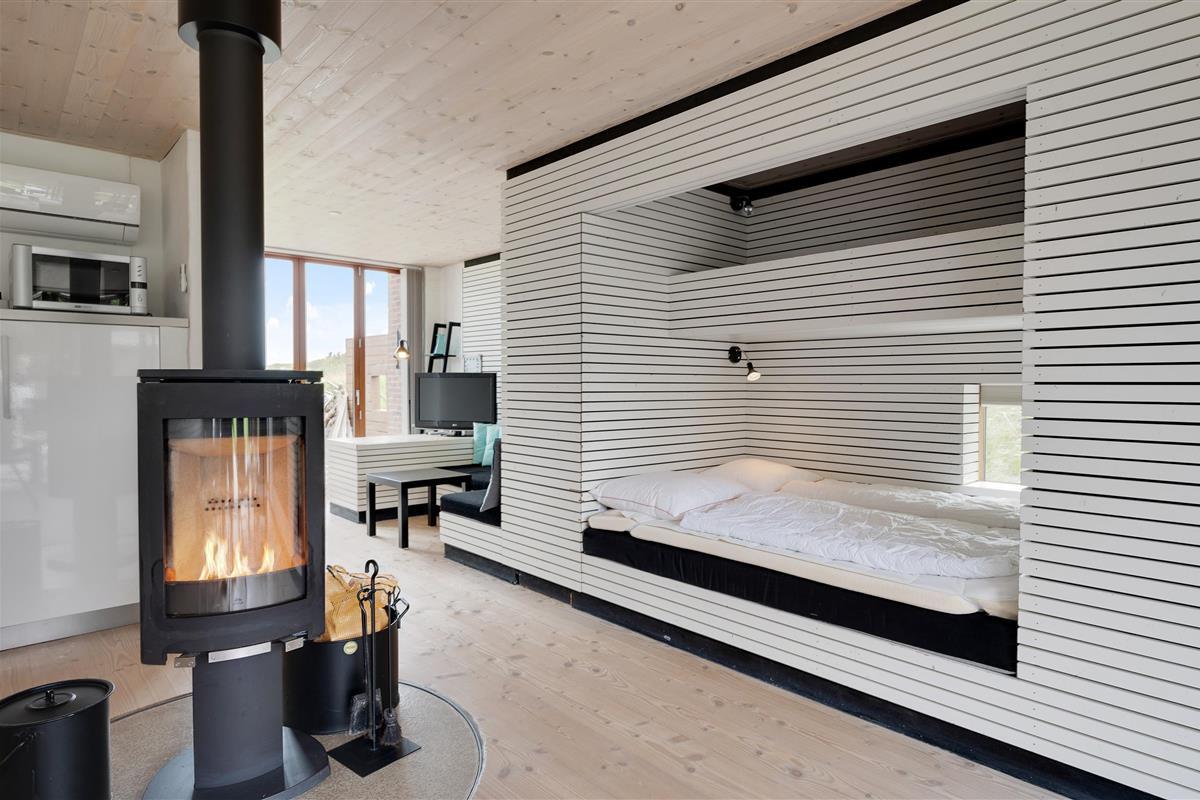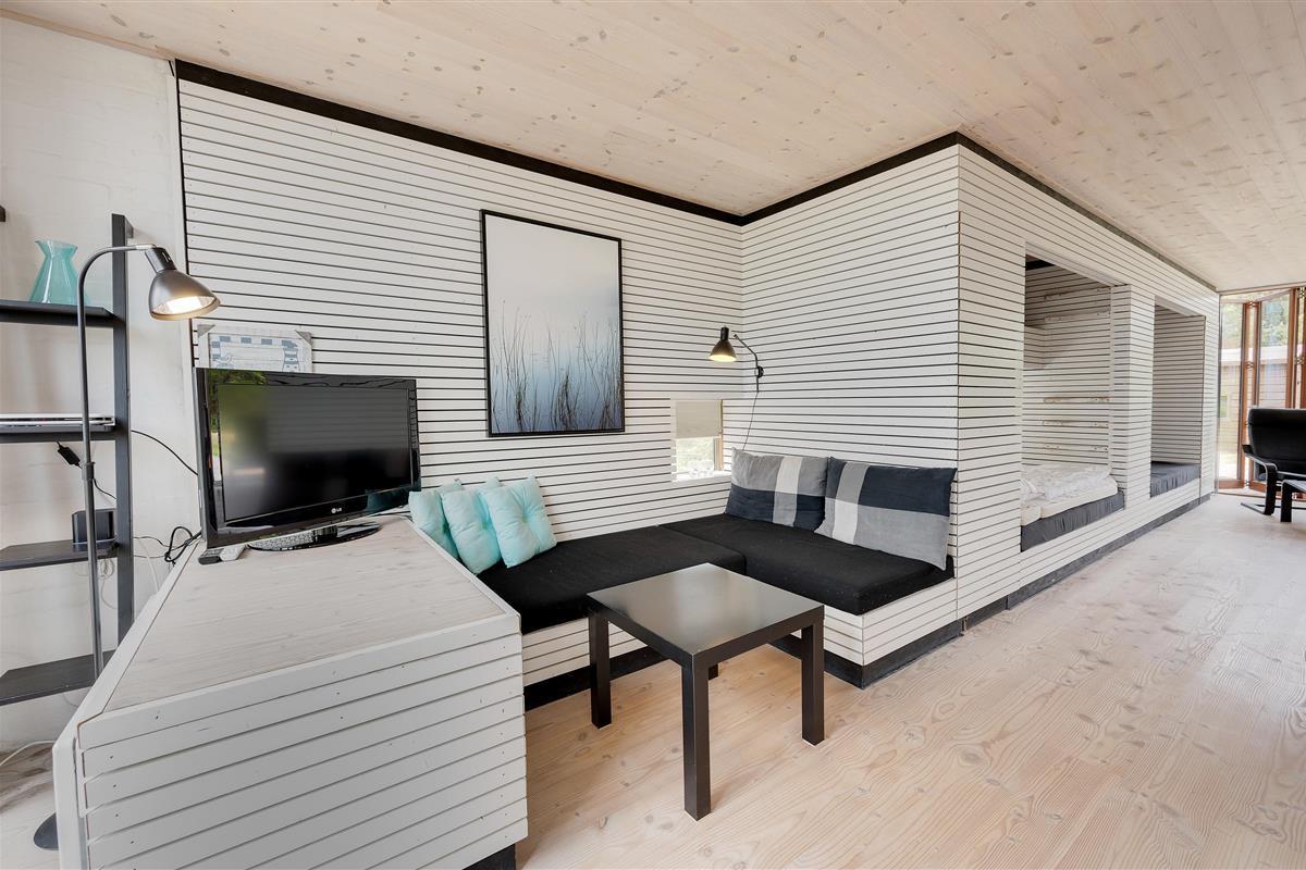 The holiday home features a large living space that combines the kitchen, living room, dining area and sleeping alcove. On one side of the holiday home, there's a comfortable seating area with a flat-screen TV. From here, you have direct access to the east-facing morning terrace and the undulating natural grounds. On the other side, the kitchen, dining area and sleeping alcove come together. Here you can open the full-length window to access the terrace and enjoy the sunset.
