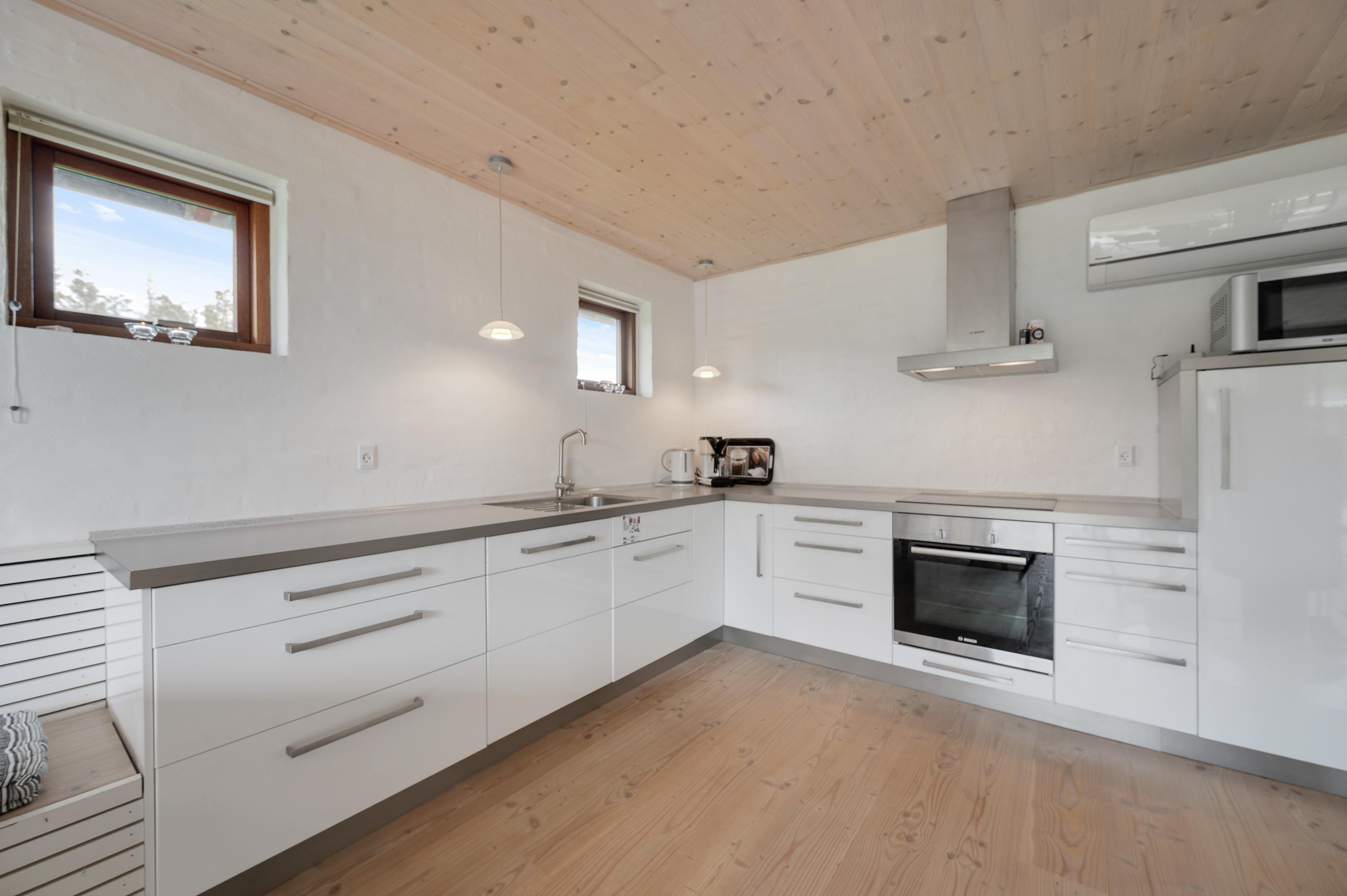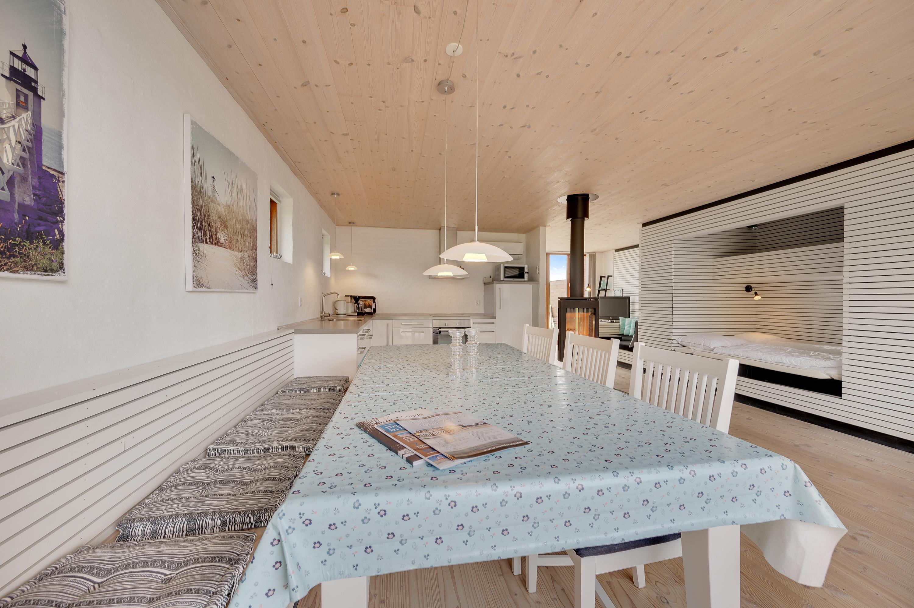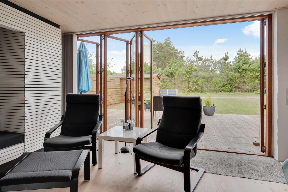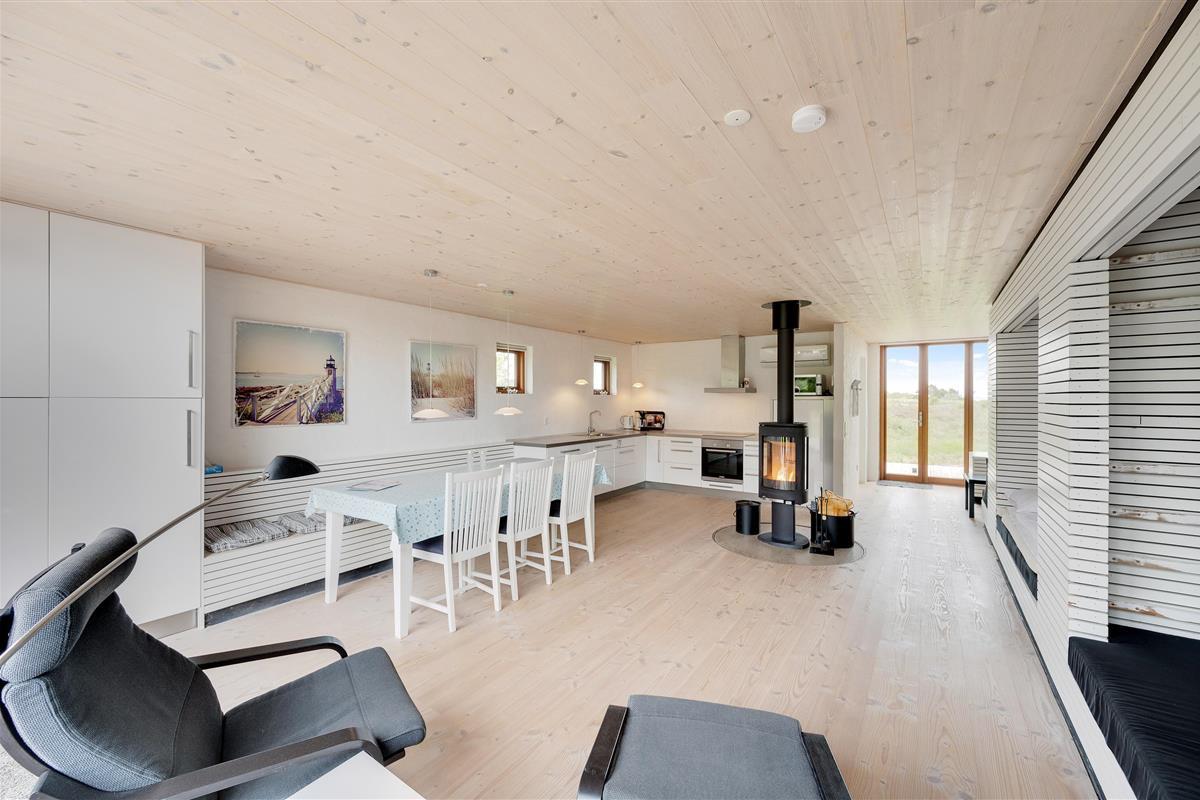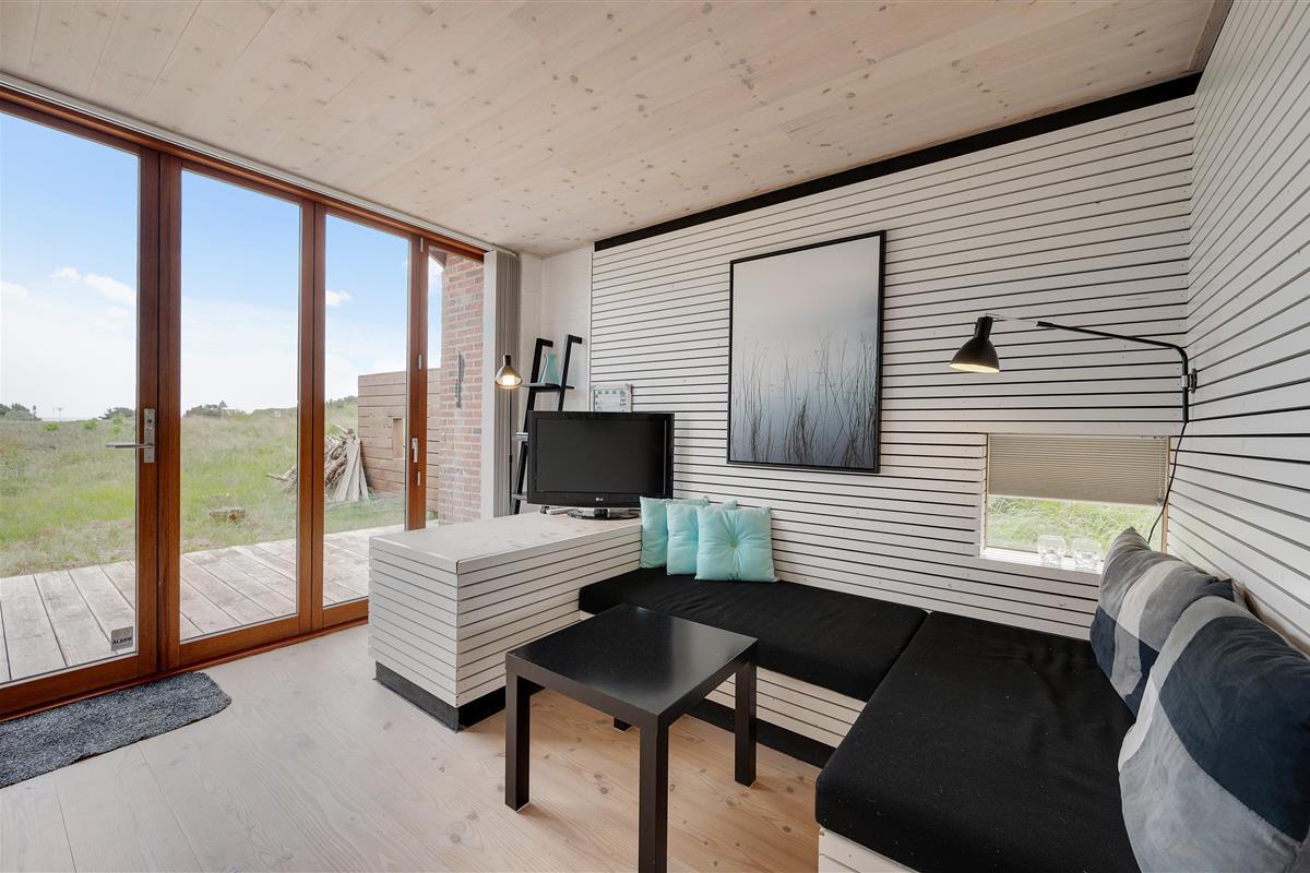 The holiday home features a large living space that combines the kitchen, living room, dining area and sleeping alcove. On one side of the holiday home, there's a comfortable seating area with a flat-screen TV. From here, you have direct access to the east-facing morning terrace and the undulating natural grounds. On the other side, the kitchen, dining area and sleeping alcove come together. Here you can open the full-length window to access the terrace and enjoy the sunset.