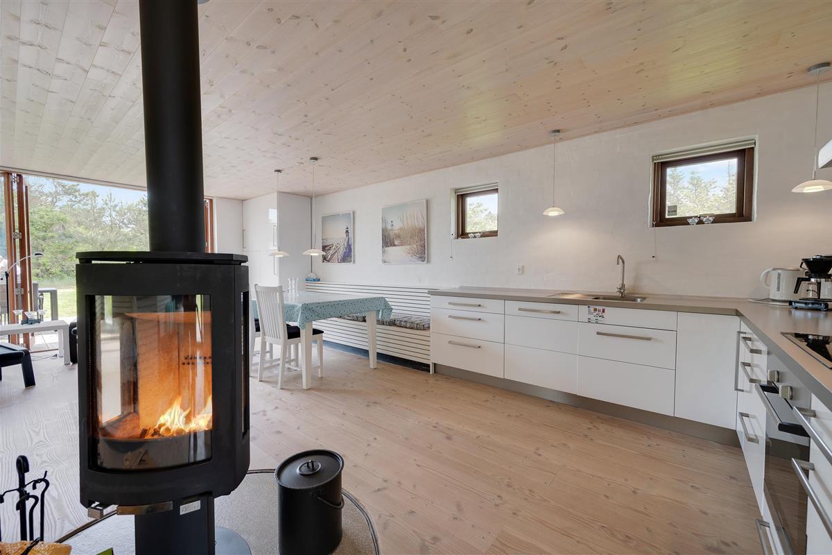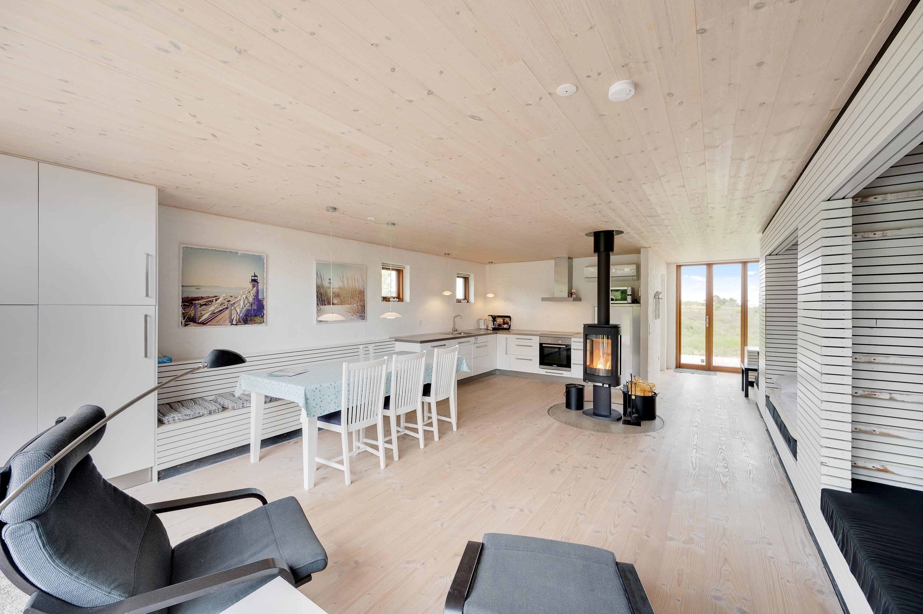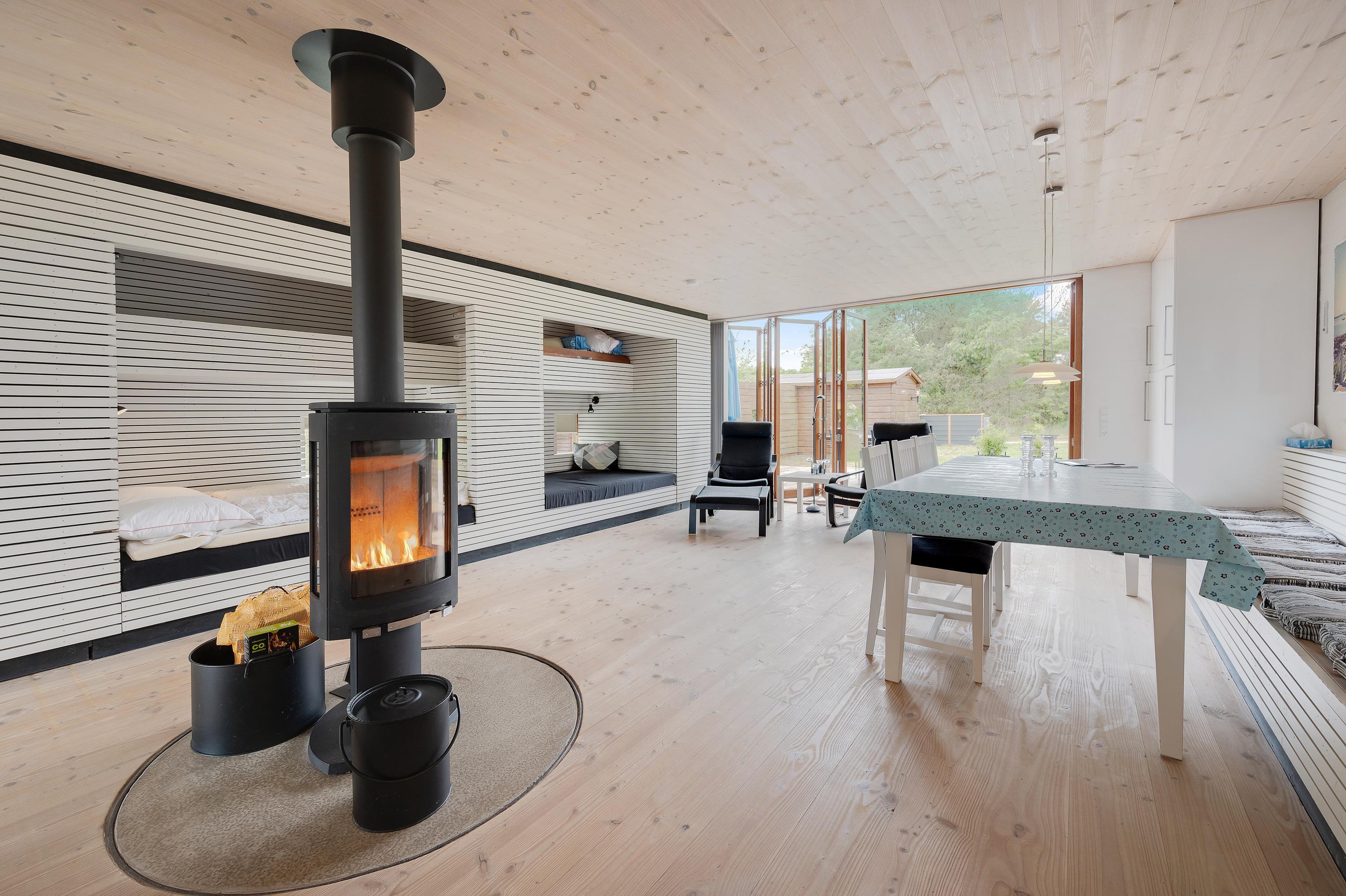 The spacious living area features a particularly special centrepiece: a wood-burning stove that can be rotated 360 degrees, allowing you to direct the crackling fire towards any part of the room.