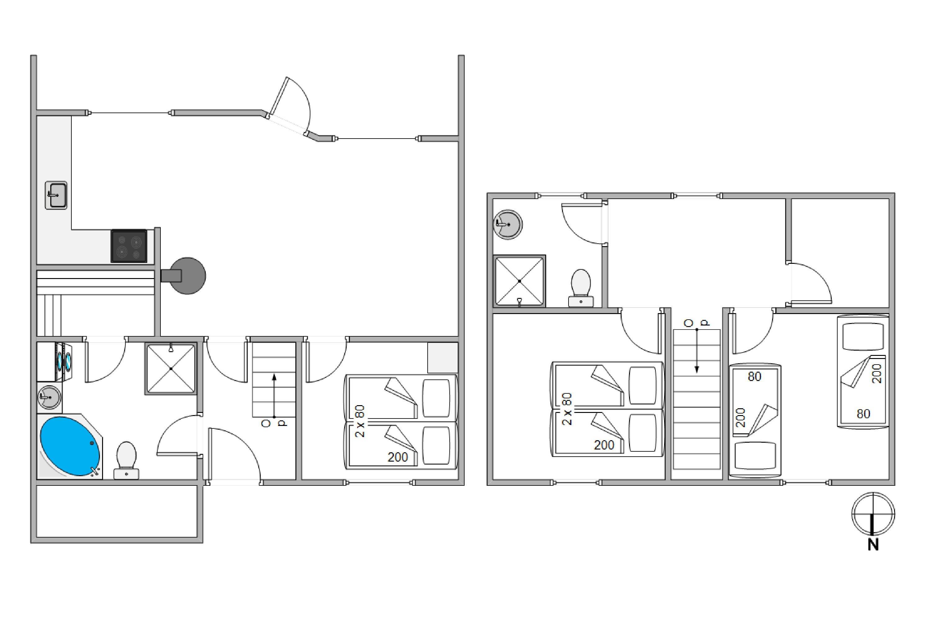 The holiday home offers comfortable accommodation arranged over two floors. The first floor comprises two bedrooms, each with a double bed, and a bathroom. On the ground floor, you'll find the third bedroom with a double bed and the bathroom featuring the whirlpool and sauna.