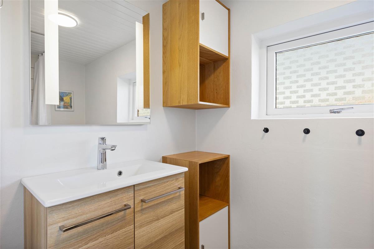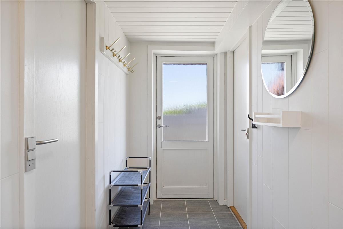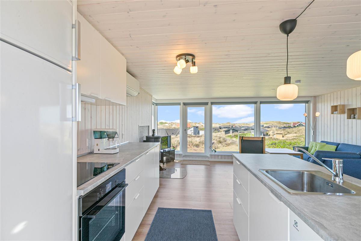 This delightful holiday home in Søndervig is ideal for a small family or a couple with a dog. The 67 square metres are cosily and thoughtfully furnished. Light-coloured walls and ceilings, combined with exposed beams, make the kitchen and living area feal spacious, bright and welcoming. The kitchen has an open-plan layout, integrated with the living and dining areas.