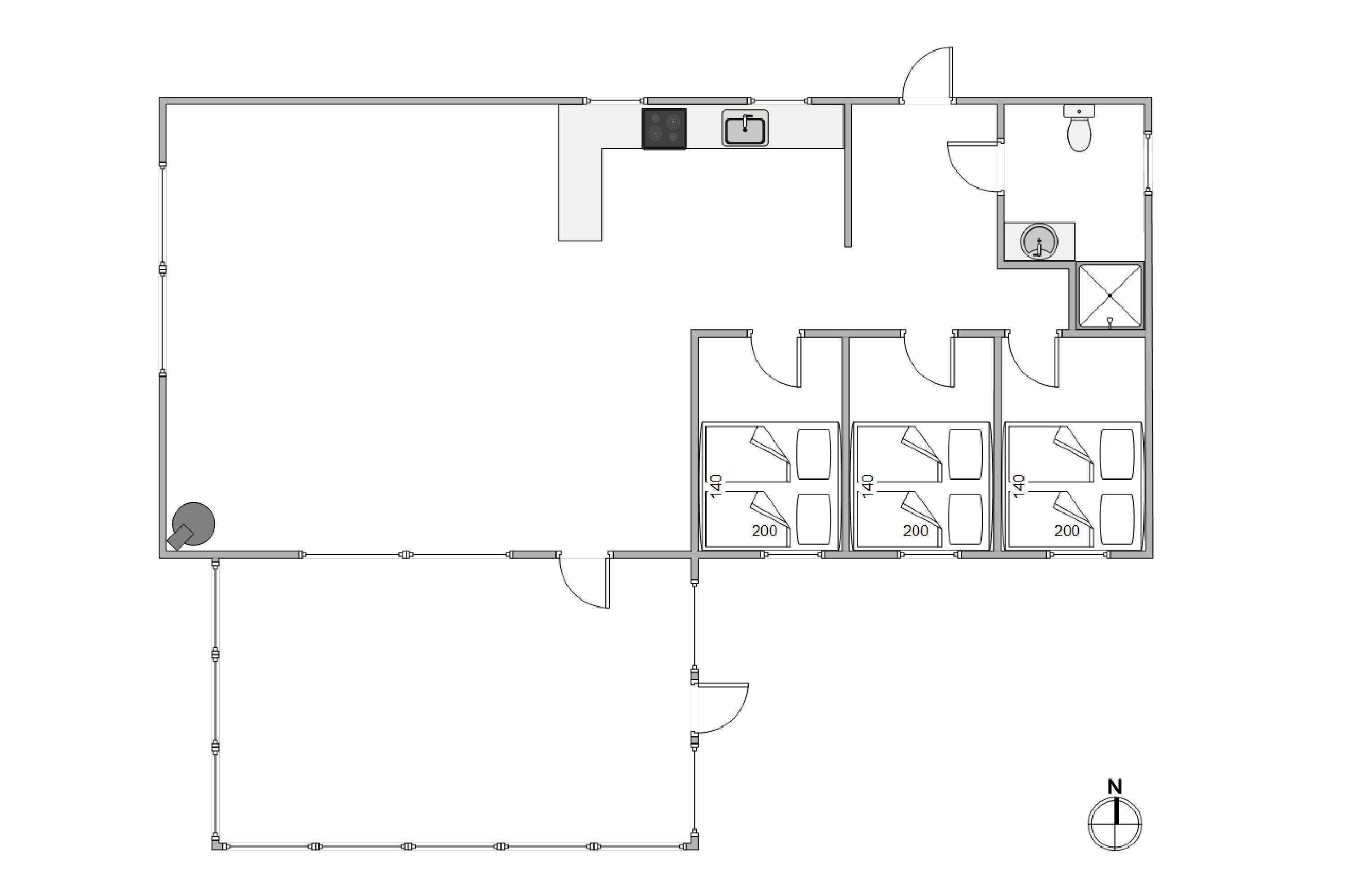 The holiday home features three bedrooms and a bathroom. An energy-efficient heat pump provides a pleasant indoor climate, while the dishwasher conveniently takes care of the washing up.