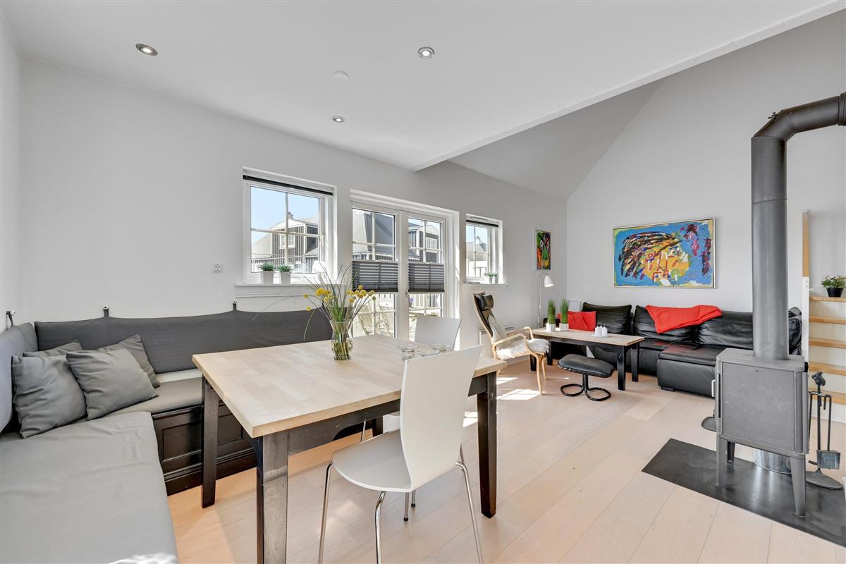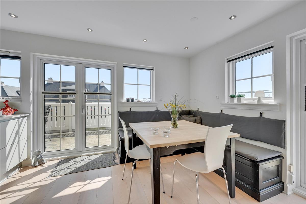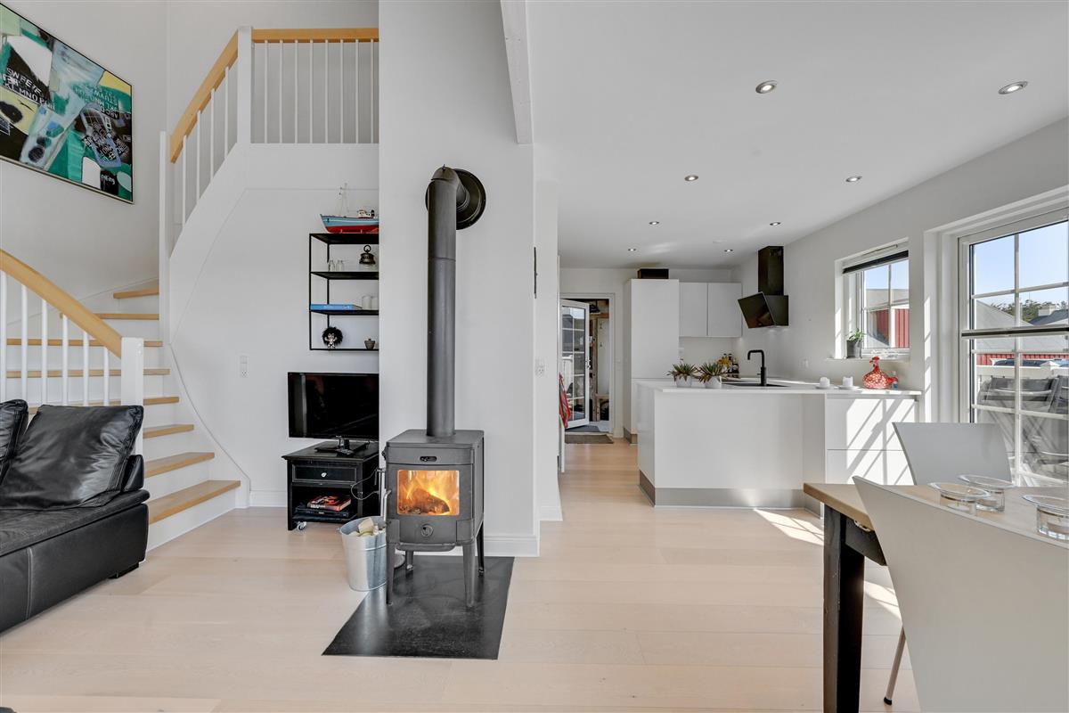 The open-plan living area is bright and welcoming, combining the dining area and kitchen into one spacious room – perfect for cooking together, playing games, or simply relaxing on the sofa. The wood-burning stove provides cosy warmth in the background, which is especially welcome during the changeable Danish summer weather, where sunshine can quickly give way to playful coastal breezes. As an alternative to the wood-burning stove, an energy-efficient air-to-air heat pump has also been installed, ensuring a comfortable and stable temperature all year round.
