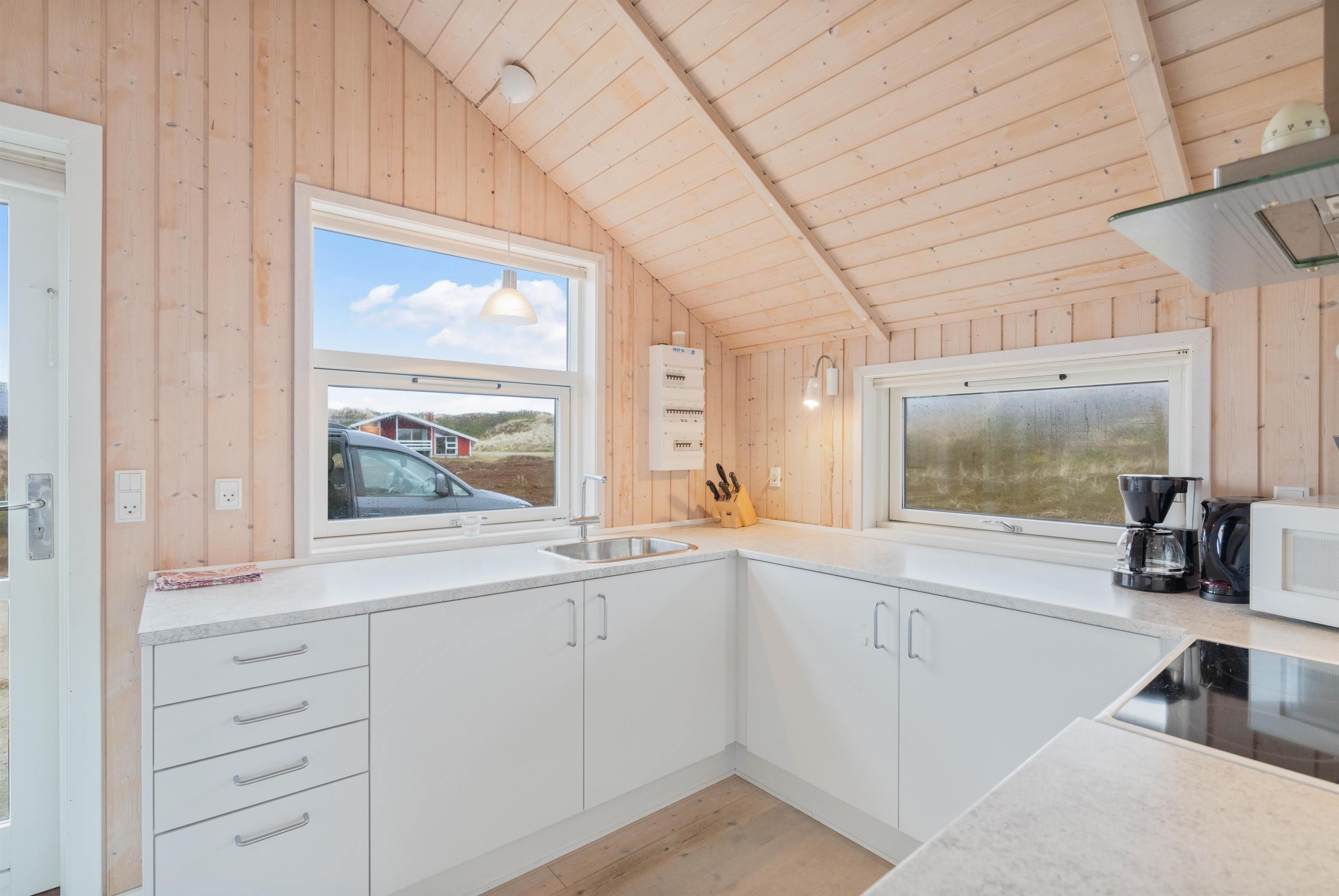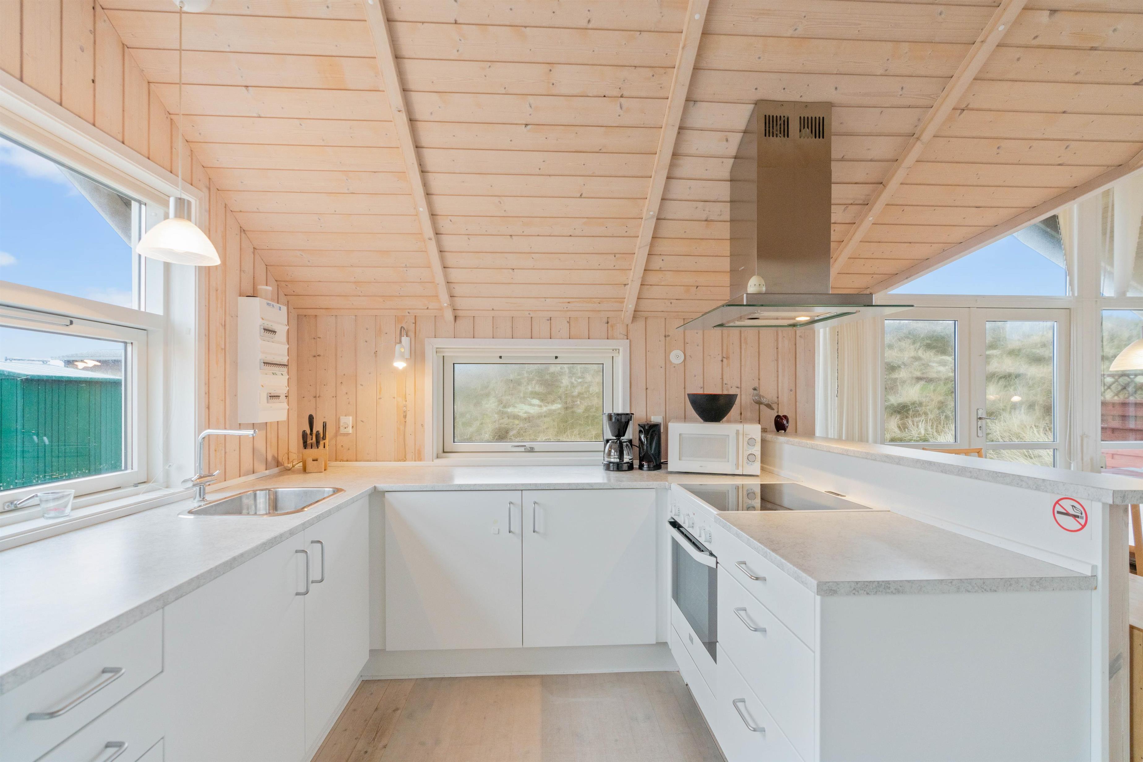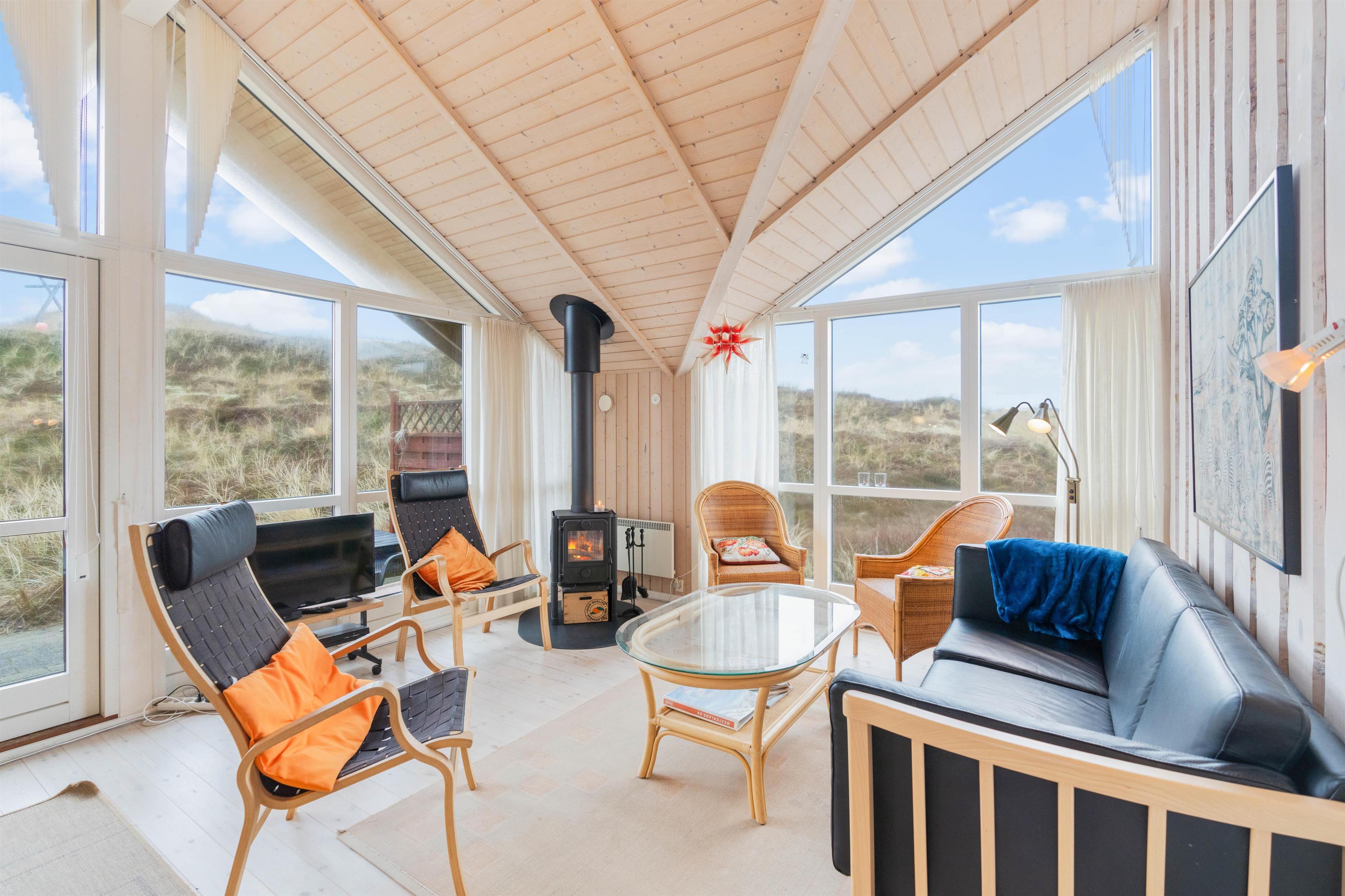 The holiday home features a fully equipped kitchen, perfect for preparing culinary delights. The spacious living area invites relaxation, while the wood-burning stove provides comfortable warmth on cooler days. Thanks to numerous windows and light-coloured panelling, your holiday home is flooded with natural light. Practical amenities such as a washing machine make your stay easier, while the bathroom with underfloor heating ensures you start each day with warm feet.