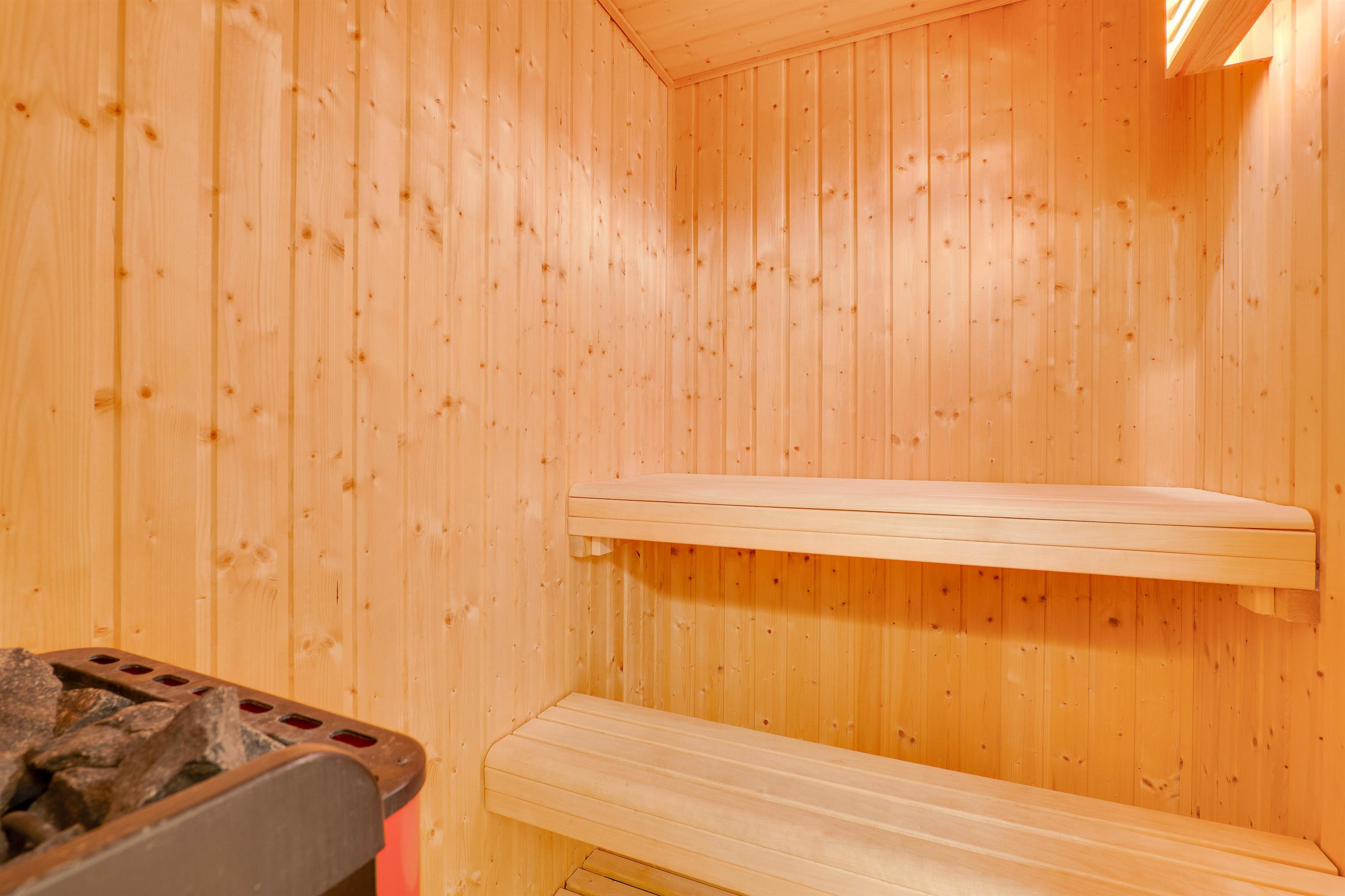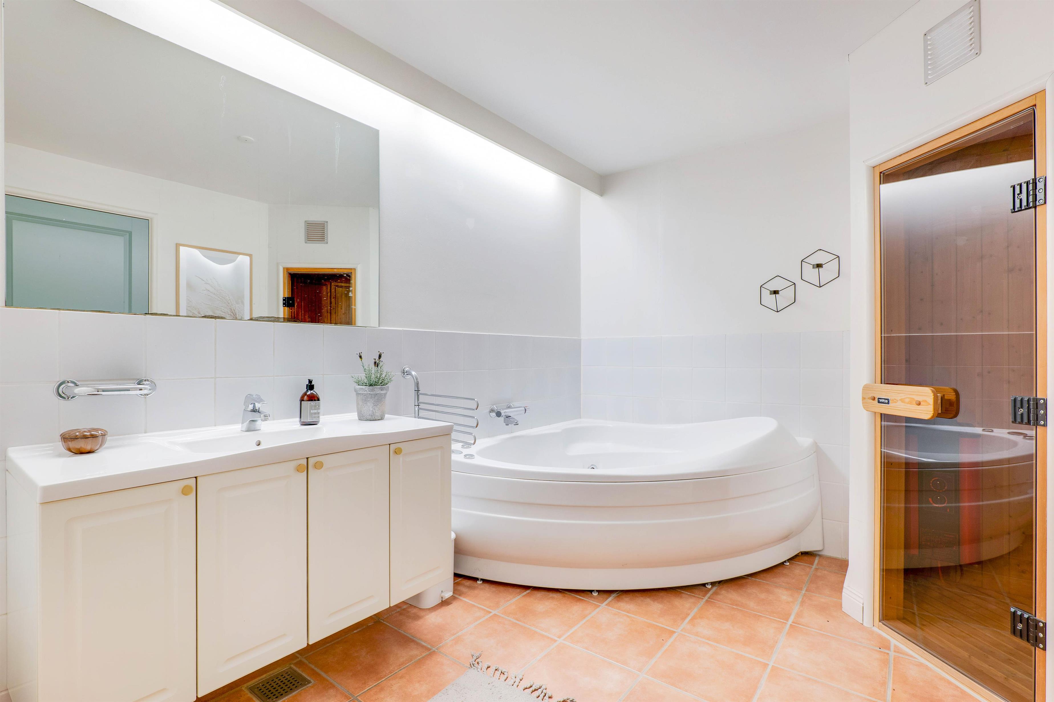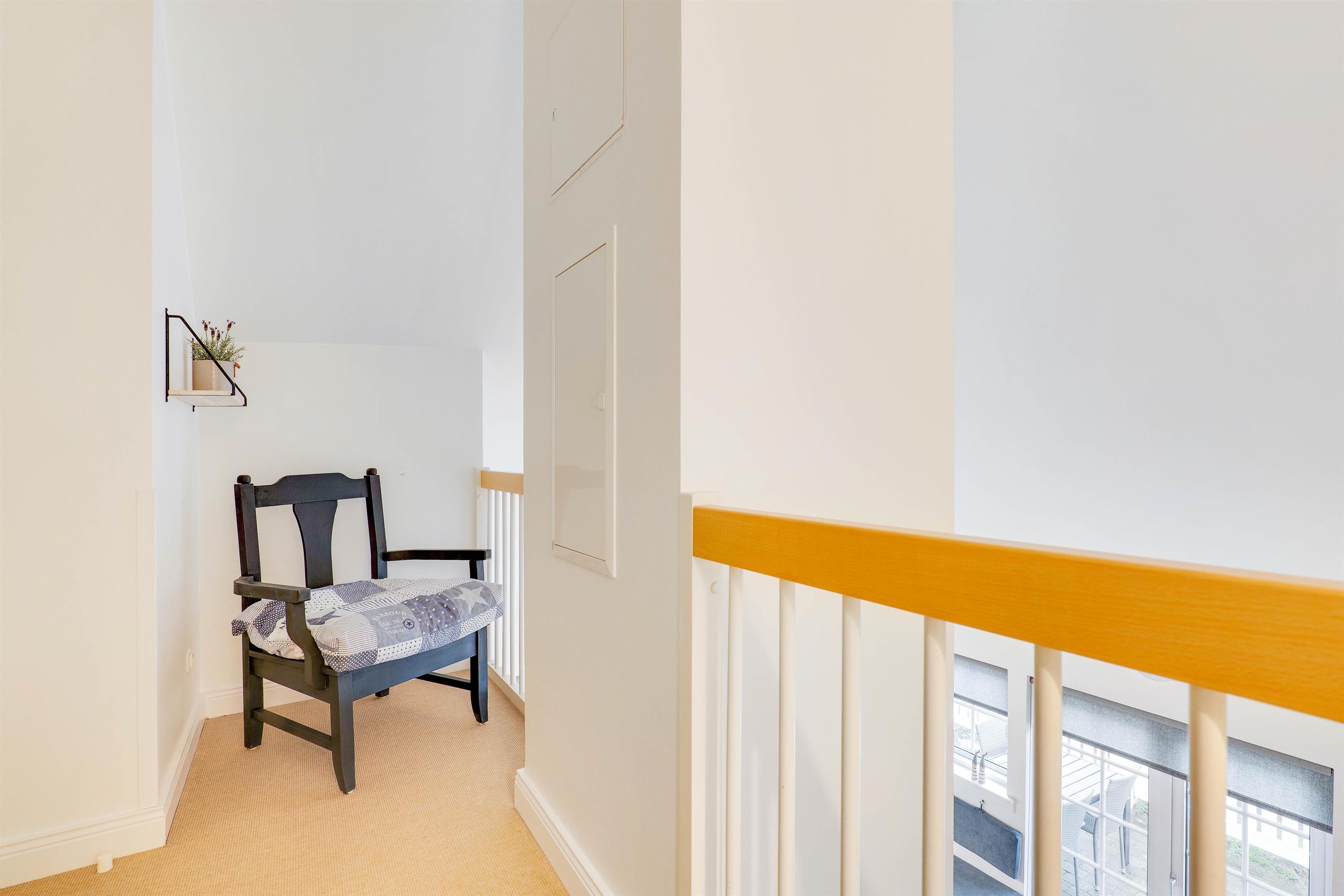 The spacious bathroom with whirlpool, sauna and underfloor heating is perfect for wellness enthusiasts. There's also a separate guest toilet. Should you have any little spills on your favourite shirt, no worries - the washing machine and tumble dryer are ready for use. The first floor features two bedrooms, both with double beds, and a small landing overlooking the living room.