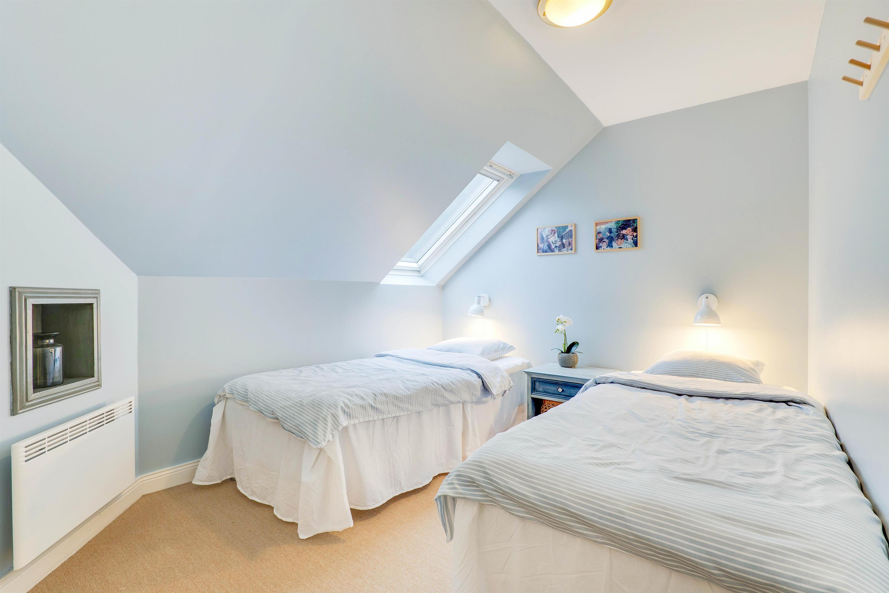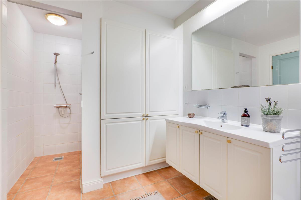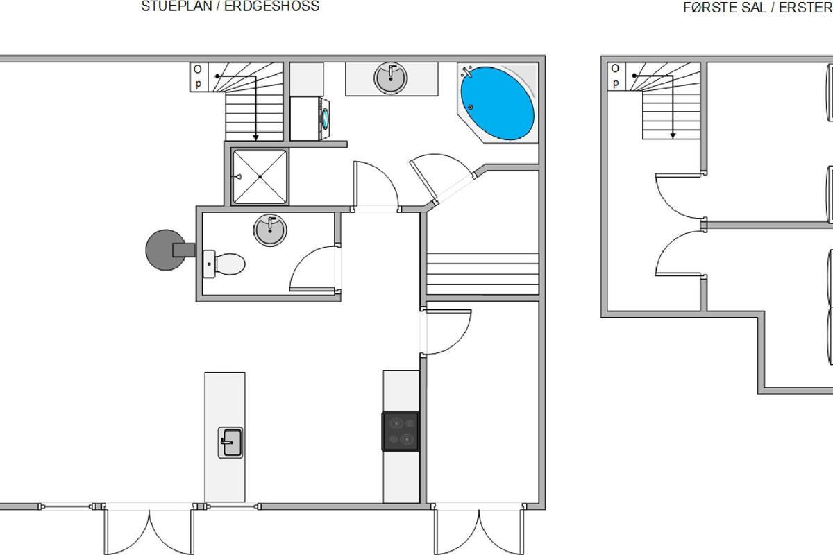 The spacious bathroom with whirlpool, sauna and underfloor heating is perfect for wellness enthusiasts. There's also a separate guest toilet. Should you have any little spills on your favourite shirt, no worries - the washing machine and tumble dryer are ready for use. The first floor features two bedrooms, both with double beds, and a small landing overlooking the living room.
