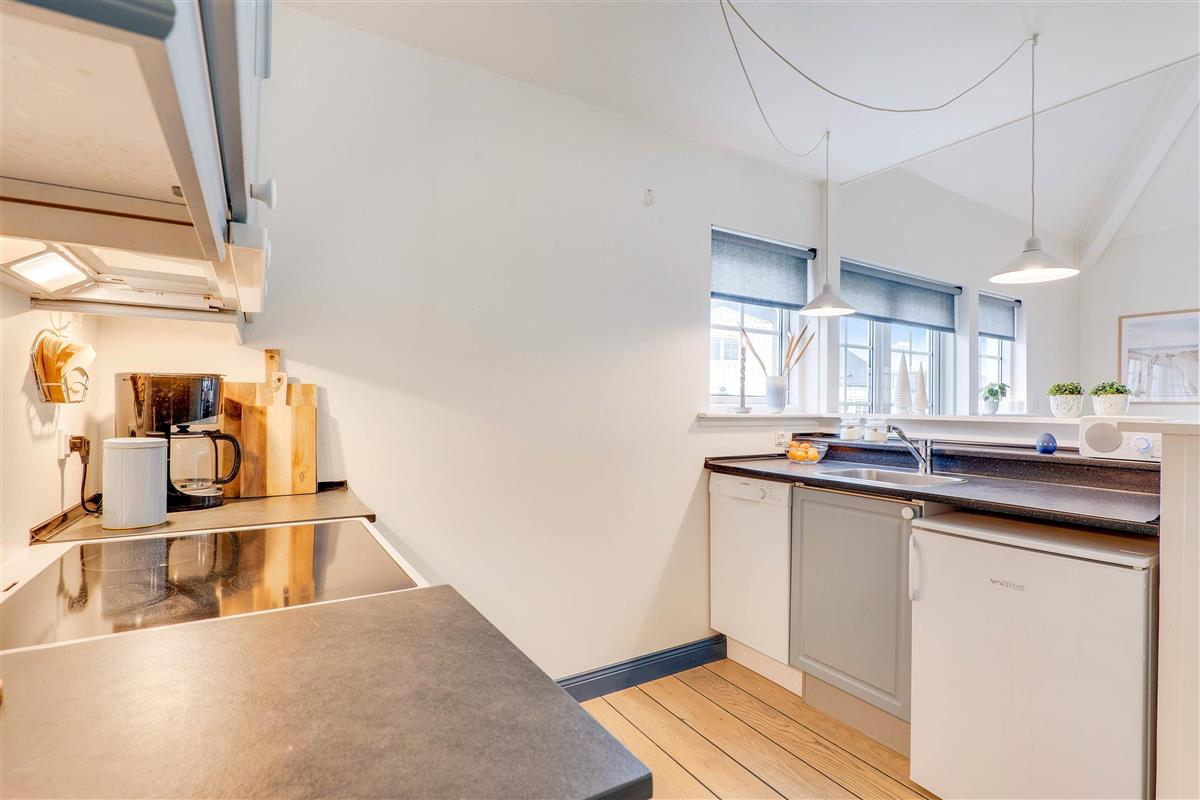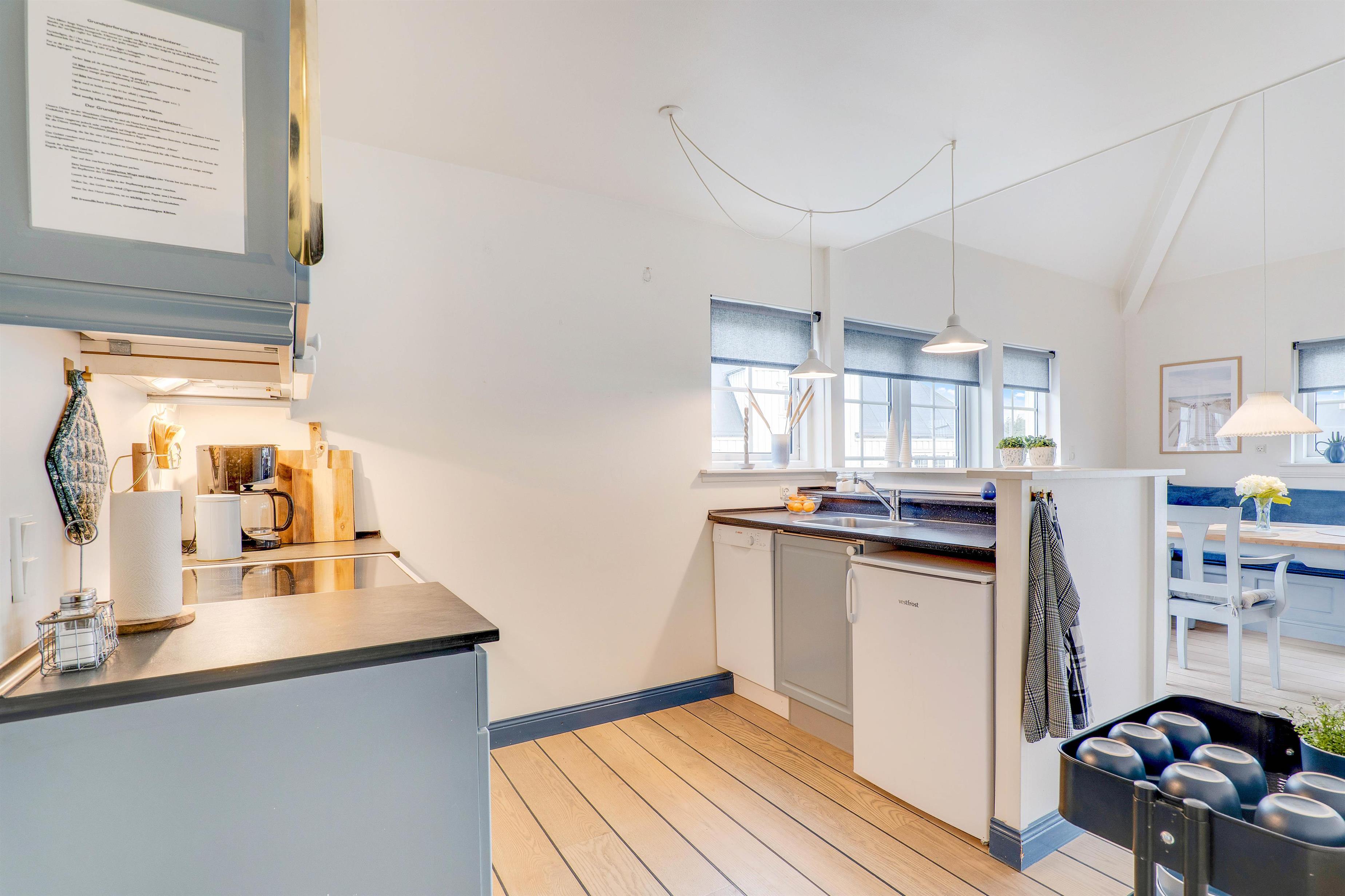 This holiday apartment is situated in the heart of Søndervig. The welcoming holiday apartment features bright interiors, and its traditional furnishings immediately put you in a holiday mood. The ground floor includes a charming compact kitchen with dishwasher.