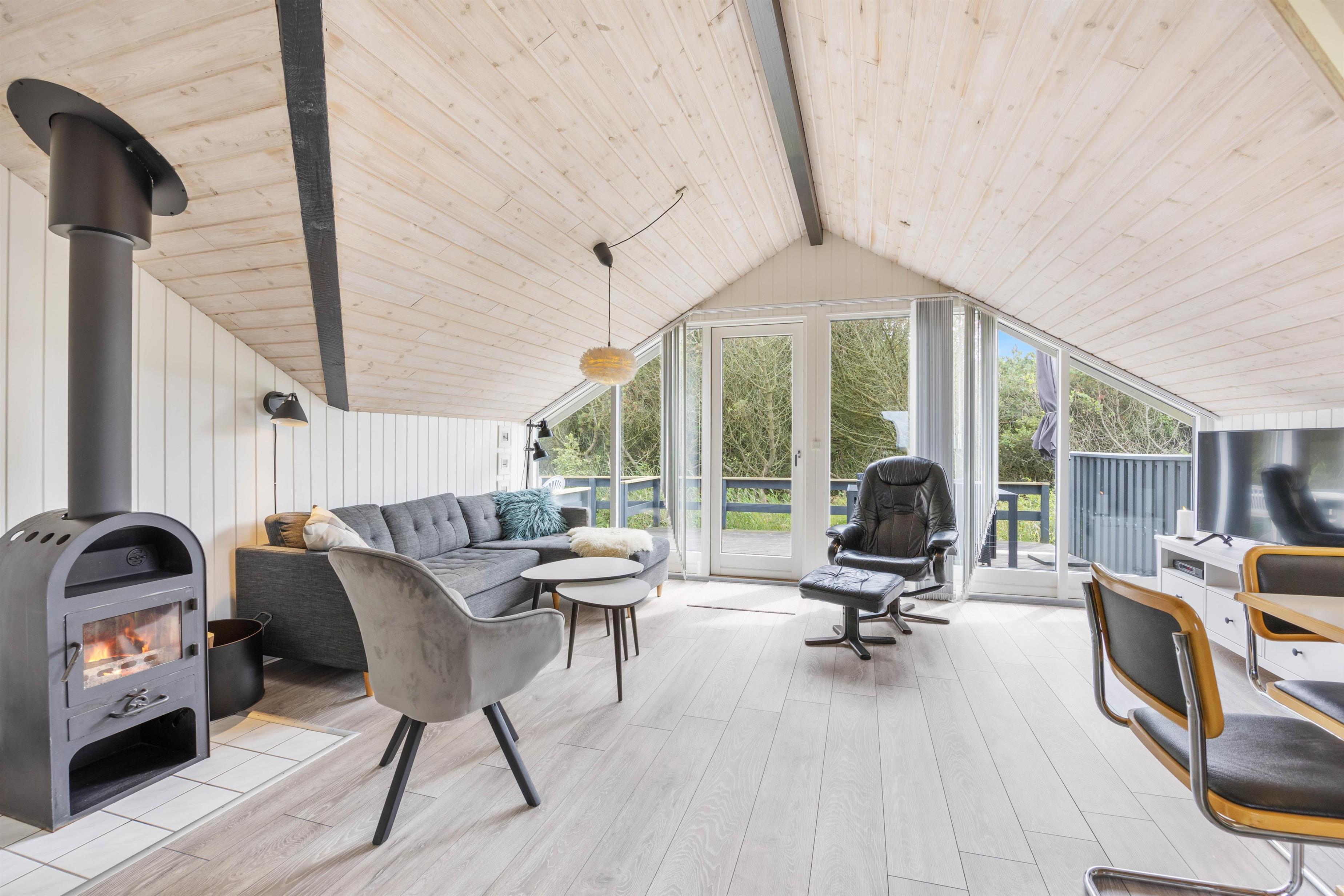 The holiday home radiates classic holiday charm, featuring high ceilings, bright wood panelling on walls and ceilings, and a warming wood-burning stove that provides heat throughout the living area. Large windows flood the space with natural light, enhancing the sense of spaciousness.