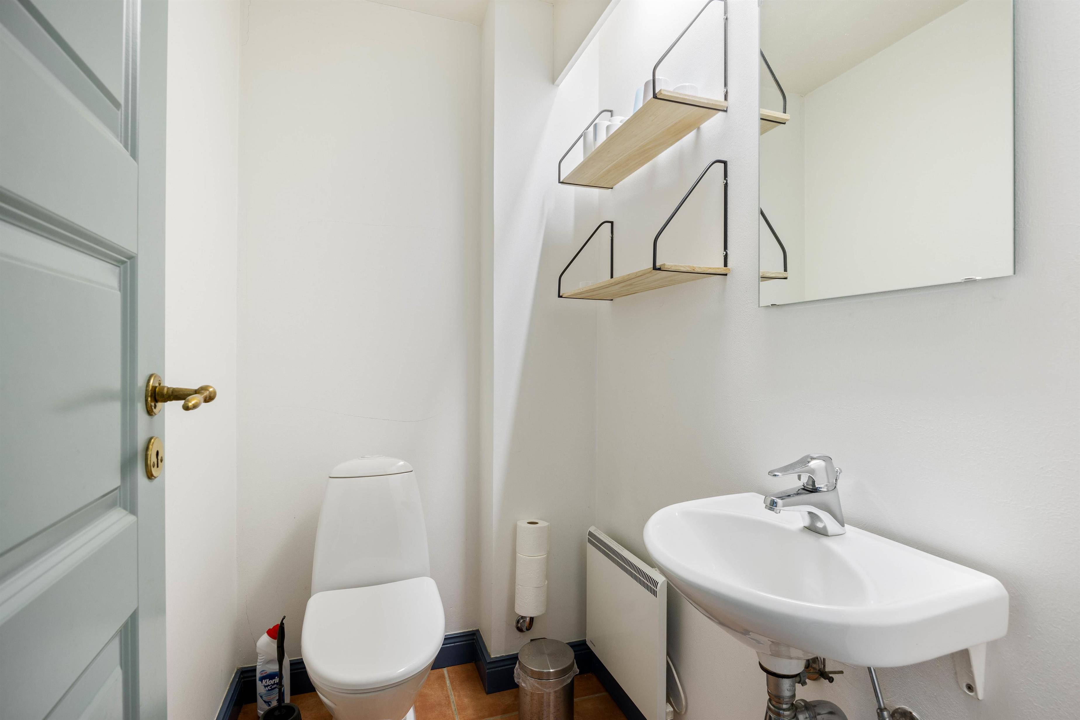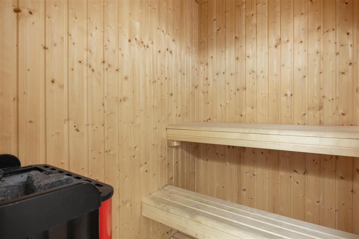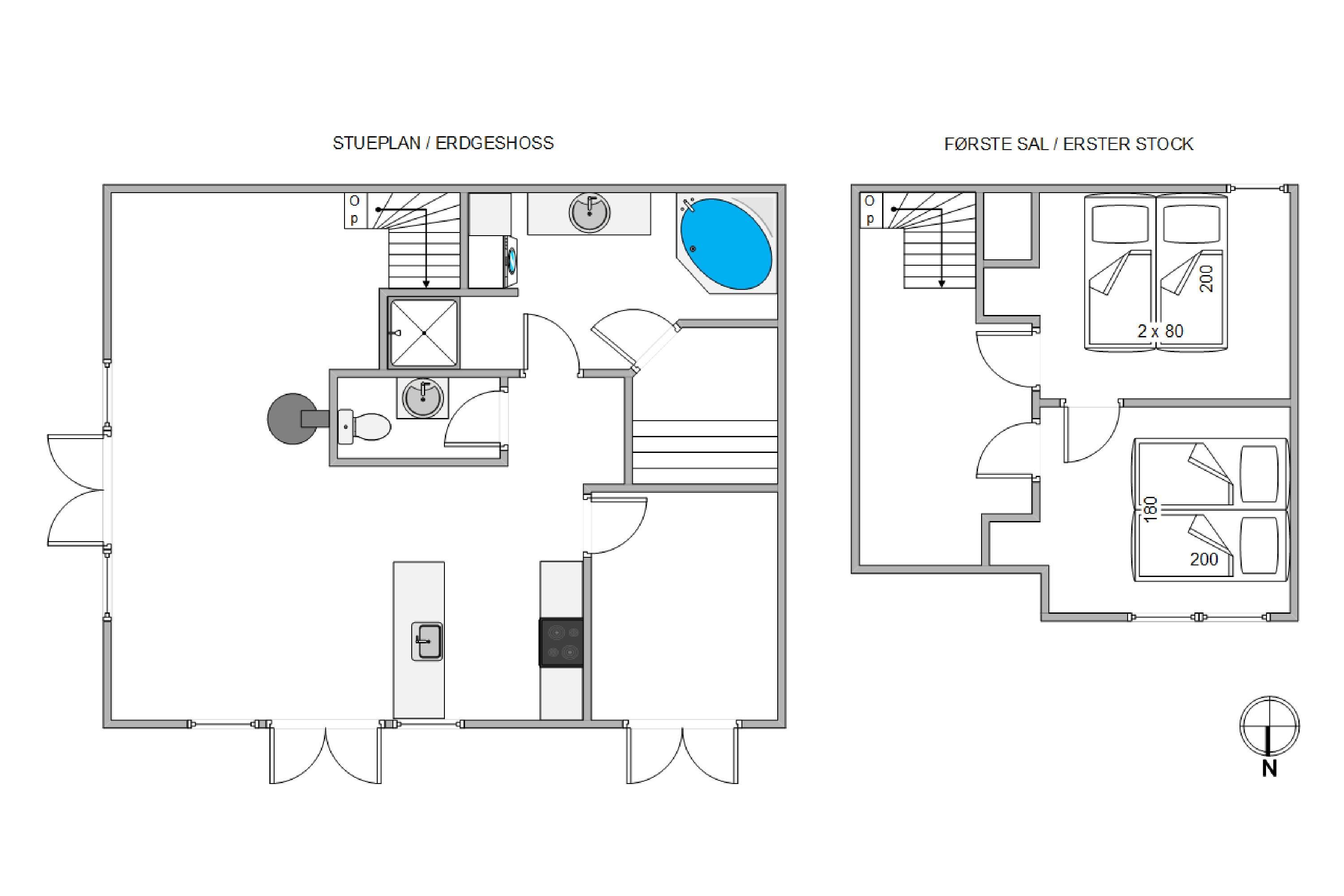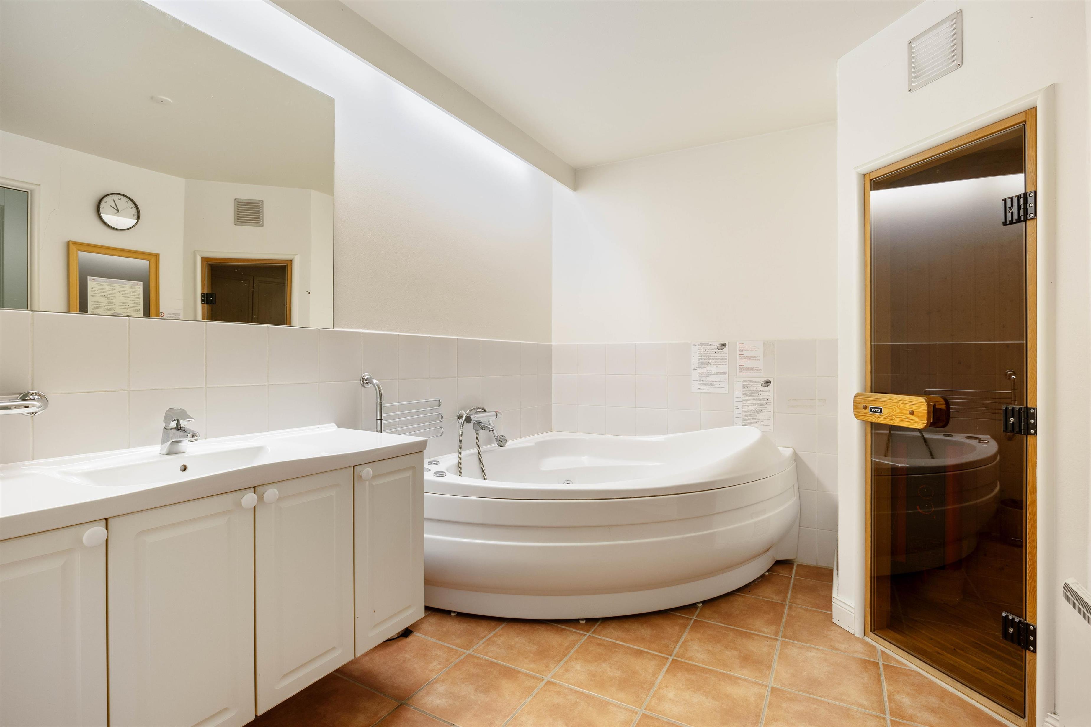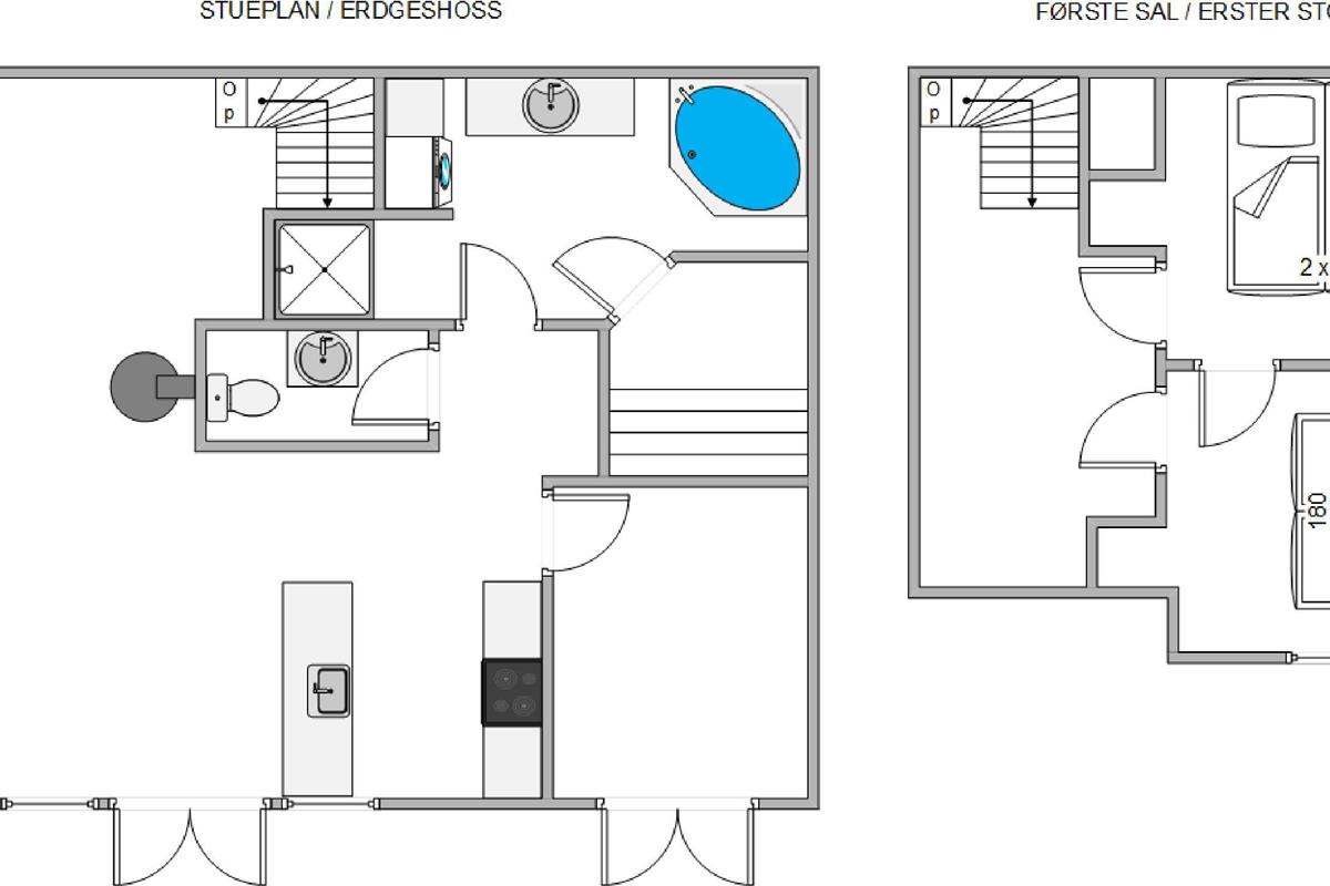 The ground floor also features a guest toilet and bathroom. The bathroom includes a whirlpool where you can unwind in the bubbling water. From the bathroom, you have access to the hot sauna, ready for your use. Upstairs, you'll find two bedrooms with double beds, one of which includes a TV.