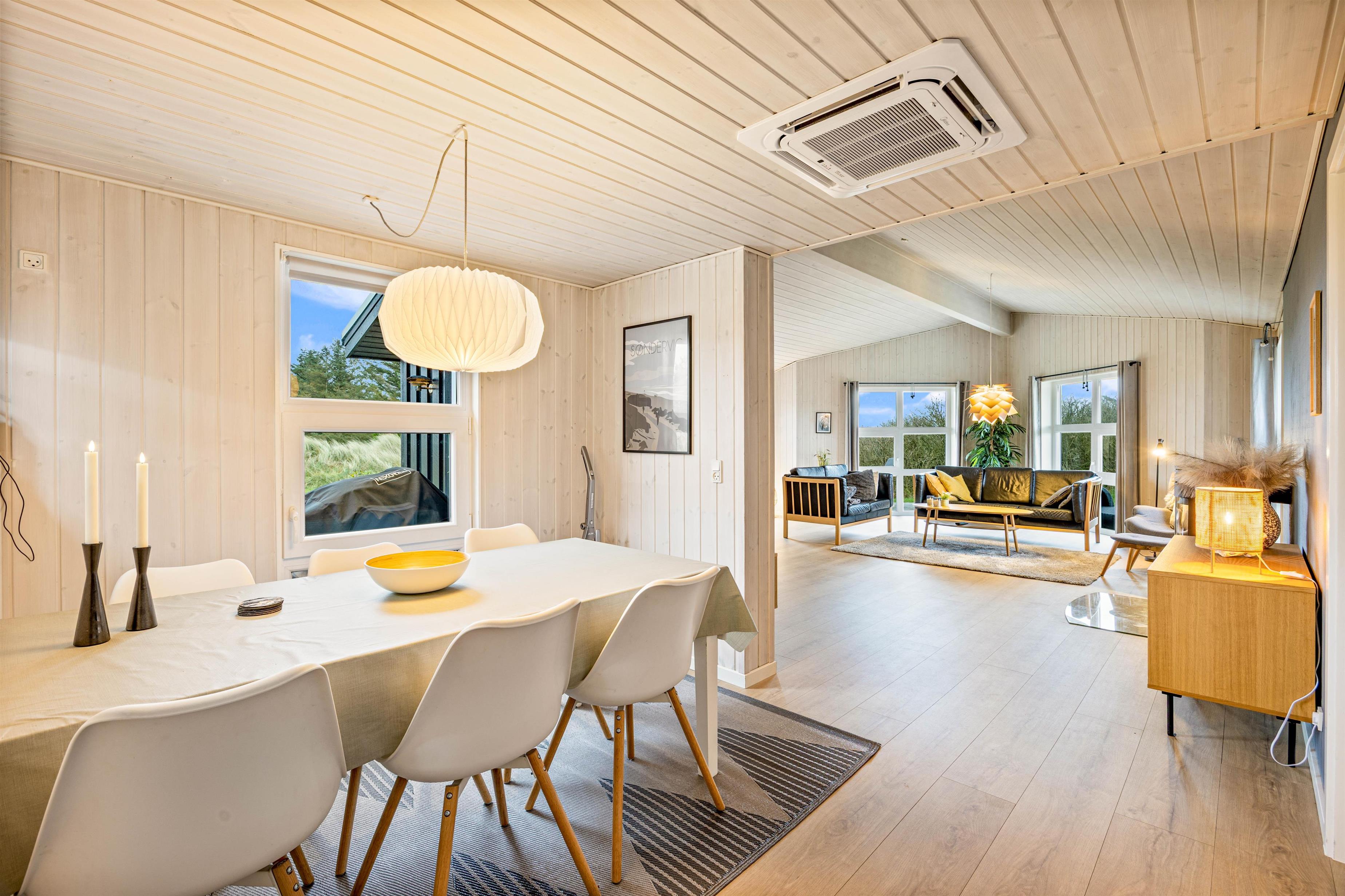 The living room offers direct access to the wooden deck that wraps almost entirely around the holiday home. Large panoramic windows flood the living room with natural light and provide beautiful views of the surrounding characteristic Jutland dune landscape.