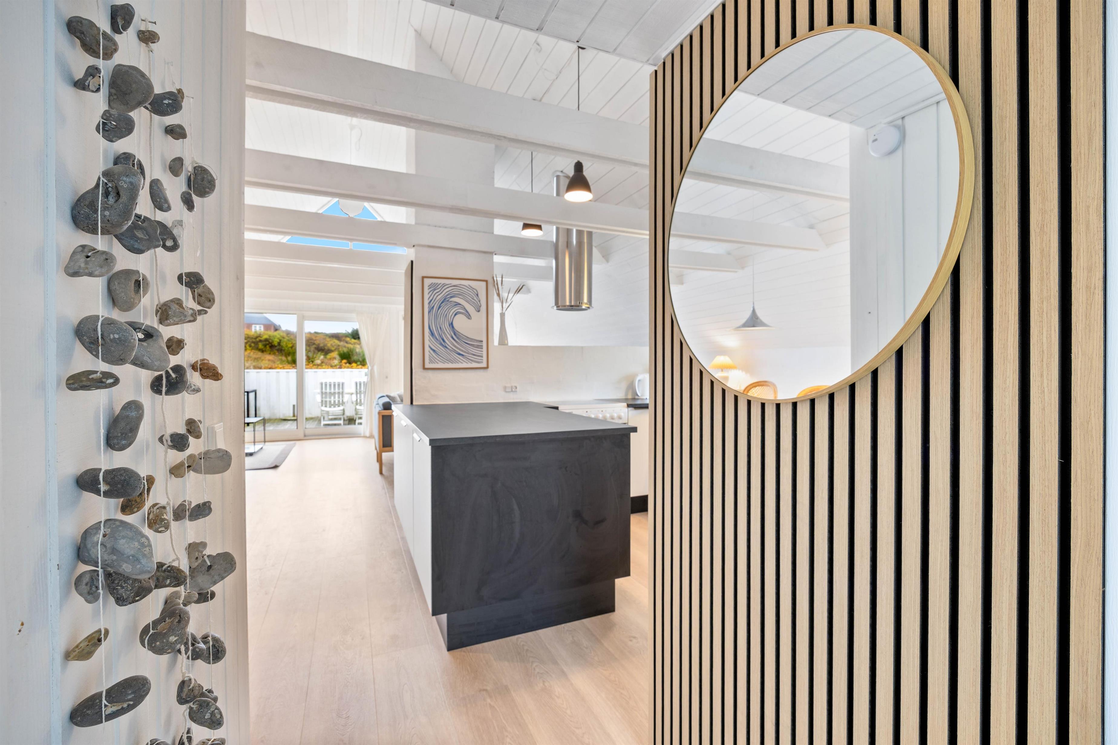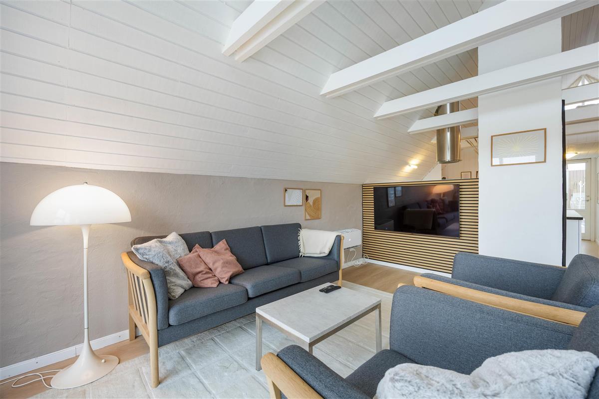 The entire holiday home features bright, welcoming décor with a particularly stylish touch. The living room has large windows that provide fantastic natural light. The heart of the holiday home is the spacious living room, where the mezzanine and wood-burning stove create a cosy atmosphere. Here the whole family can gather to enjoy time together playing board games.