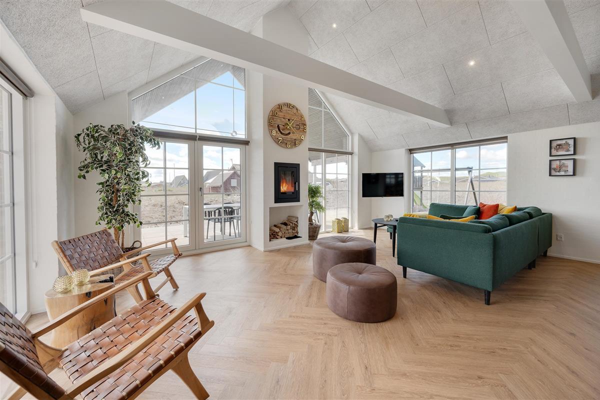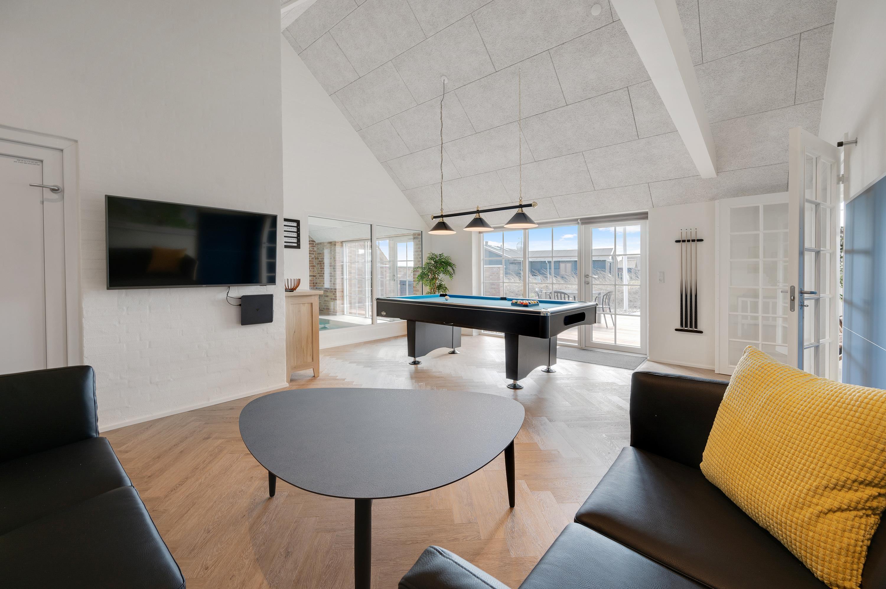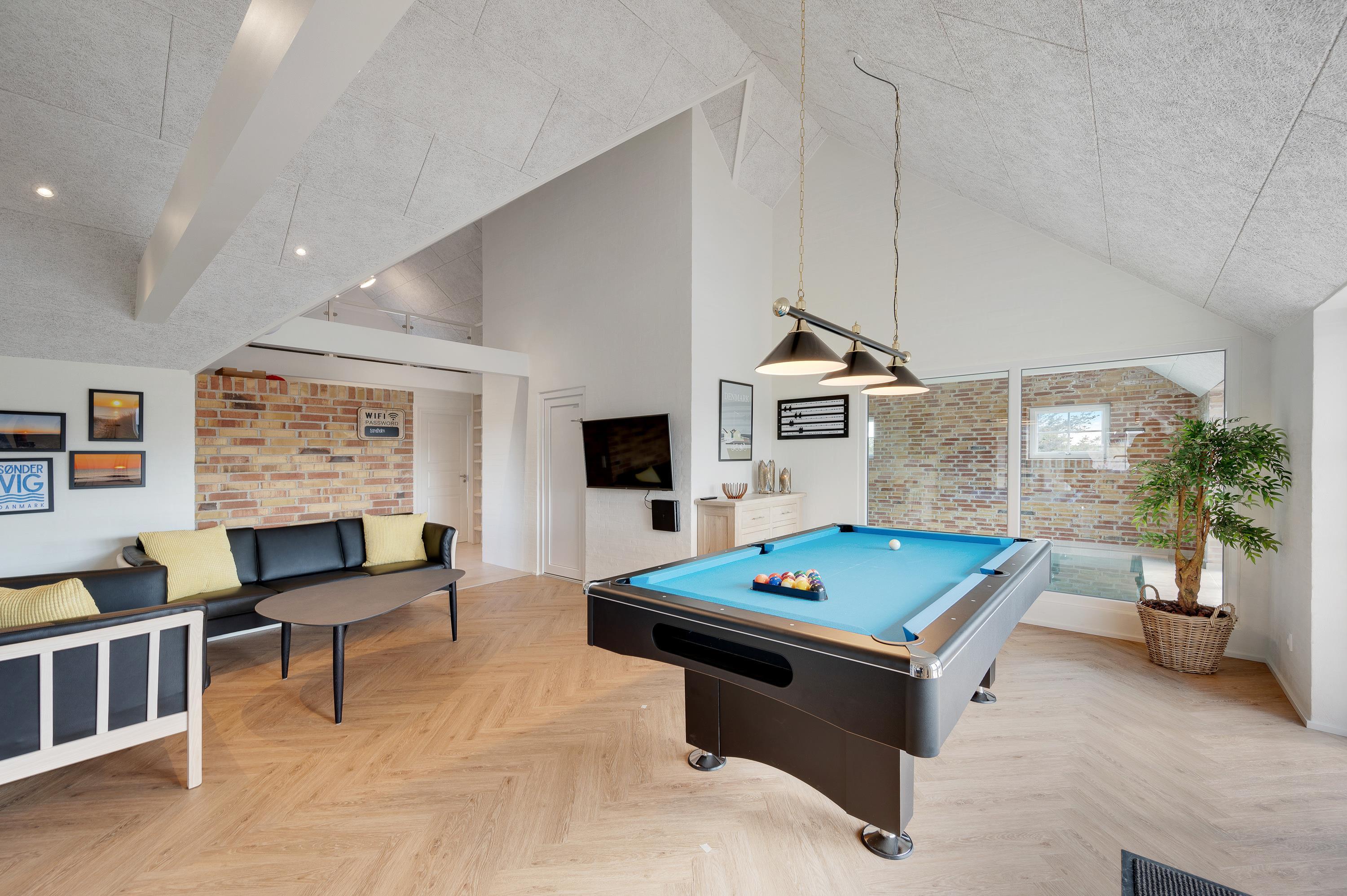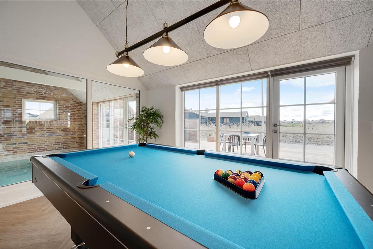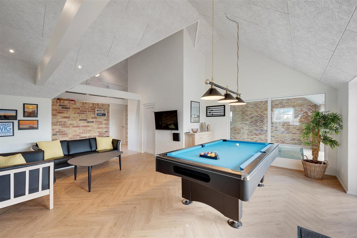 Located at Sand Holms Vej 9 in Søndervig, just 350 metres from the beach, this spacious and modern activity holiday home offers plenty of room for up to 10 people and leaves nothing to be desired. Best of all, your two dogs are also welcome here. Whether it's the swimming pool with counter-current system, outdoor hot tub, or pool table - everything is provided. The wood-burning stove in the living area ensures cosy evenings.