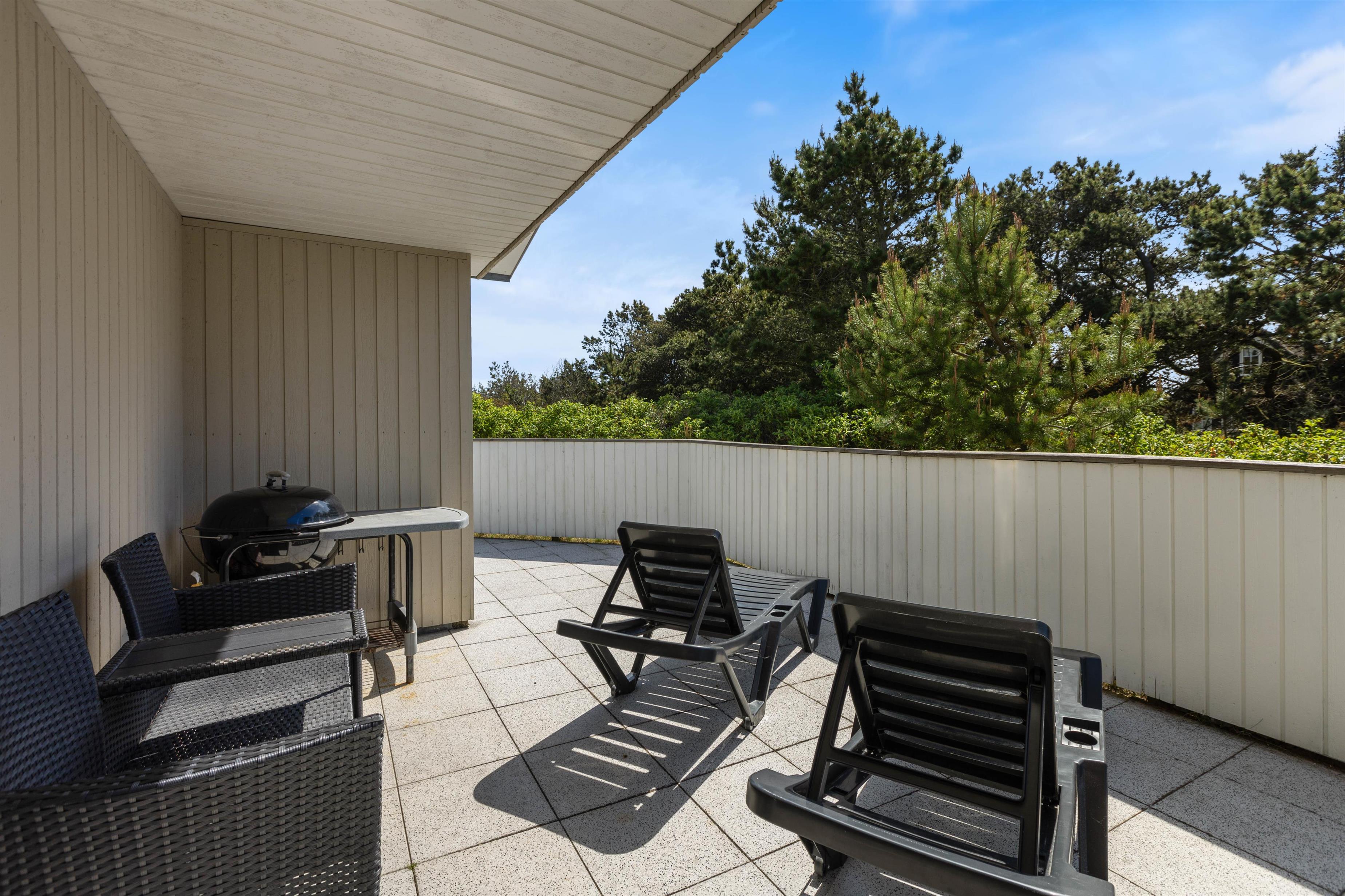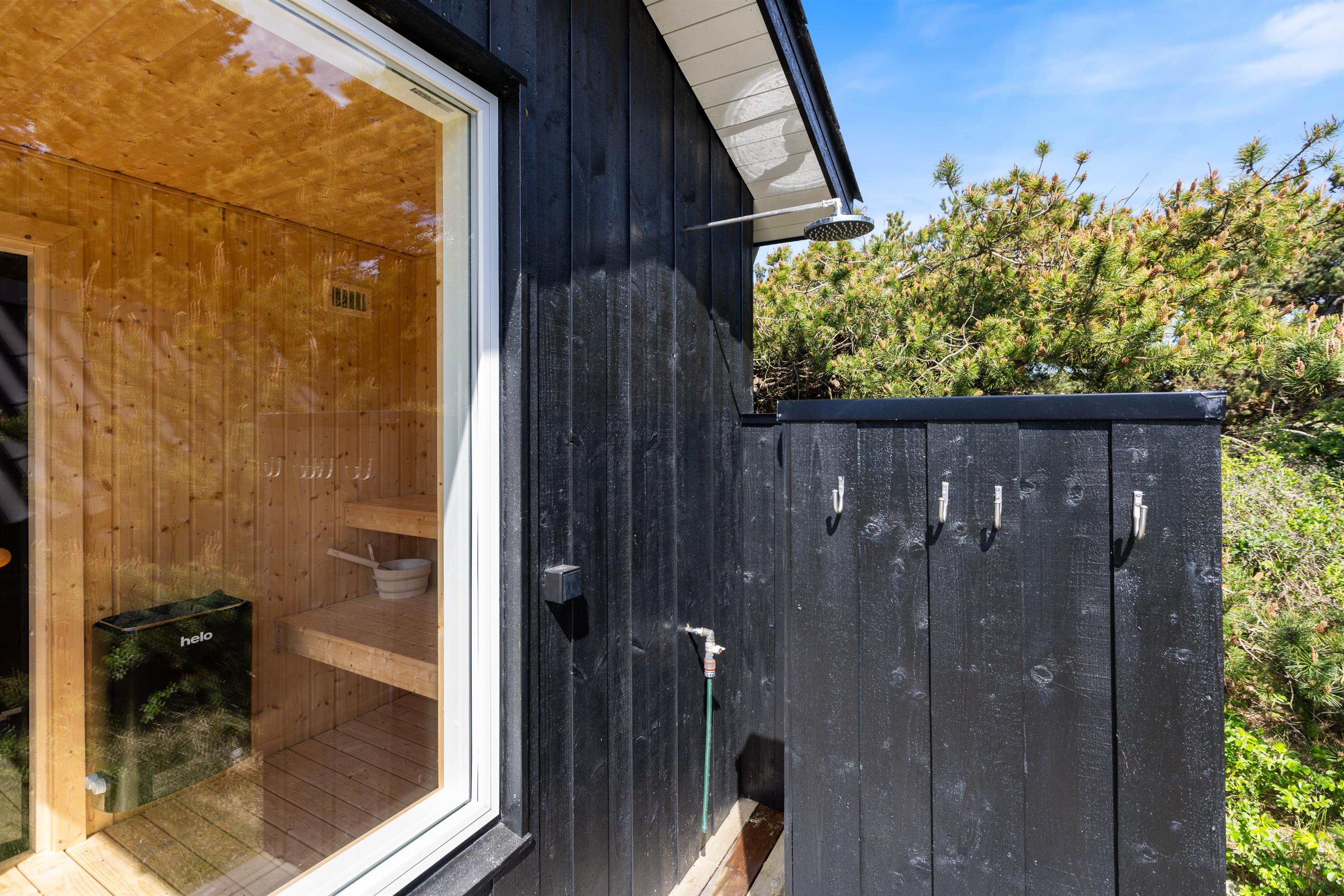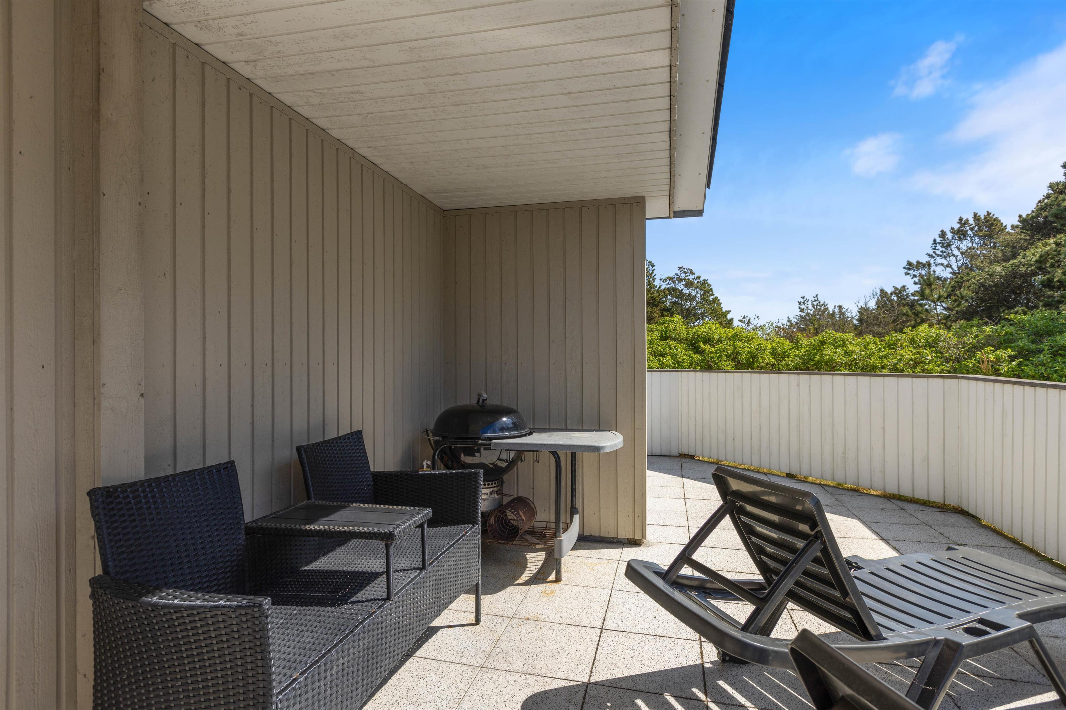 The holiday home sits on an attractive corner plot, screened from other properties. The living room opens directly onto a large, partially covered terrace facing south/east. Garden furniture and a barbecue are provided. After a long beach walk, you can unwind in the outdoor sauna. The outdoor shower is available from April to November (closed during winter months to prevent frost damage).