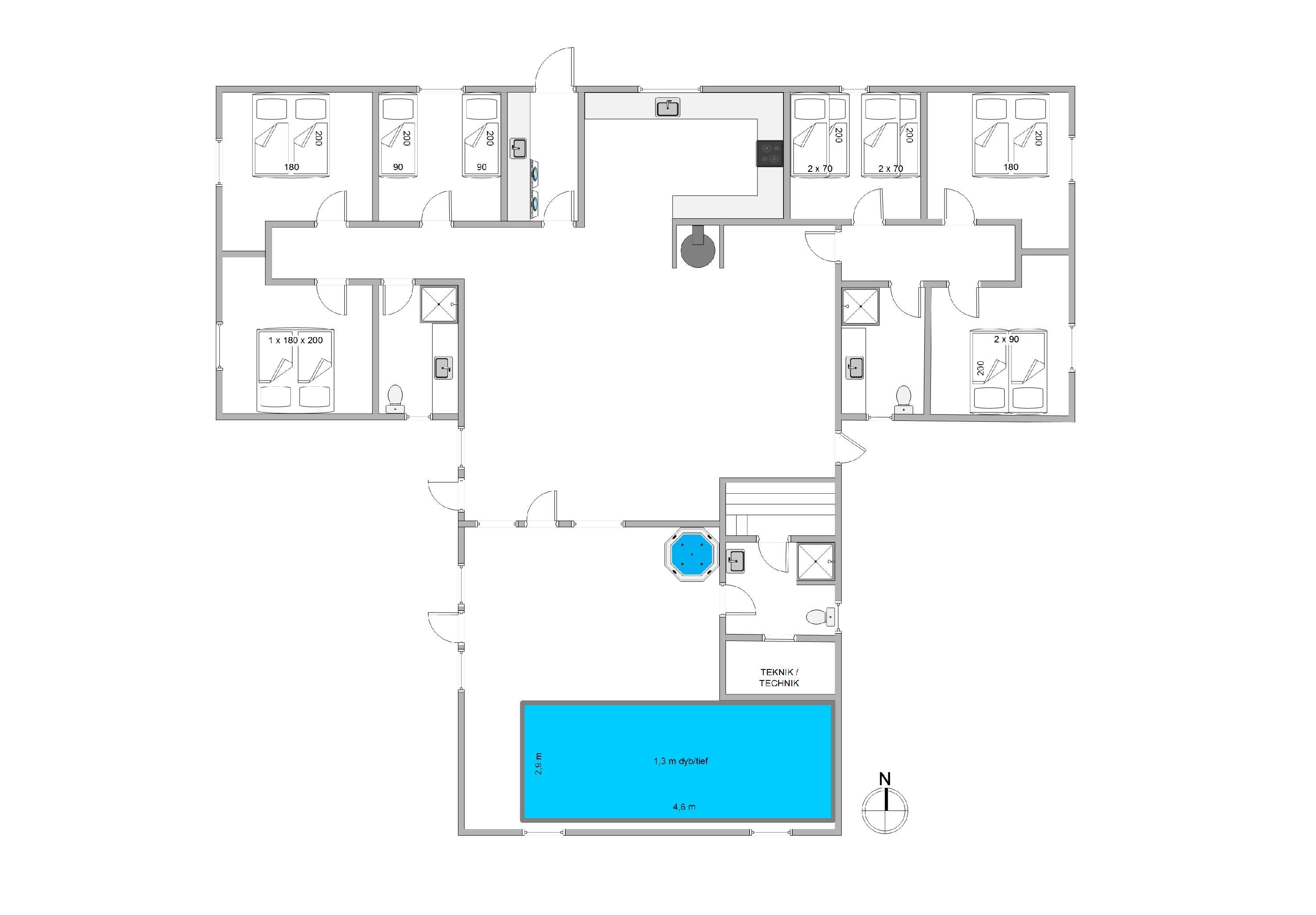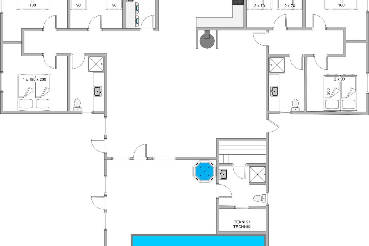 Beautiful and bright pool house with space for a family holiday or group of friends. Two pets are also welcome. Located at Wolle Friks Vej 12A, the holiday home features a large and spacious pool area with swimming pool and energy-efficient heat pump, hot tub and sauna. Here you can enjoy a special holiday experience combining relaxation and activity. This spacious holiday home offers everything you could wish for and more.