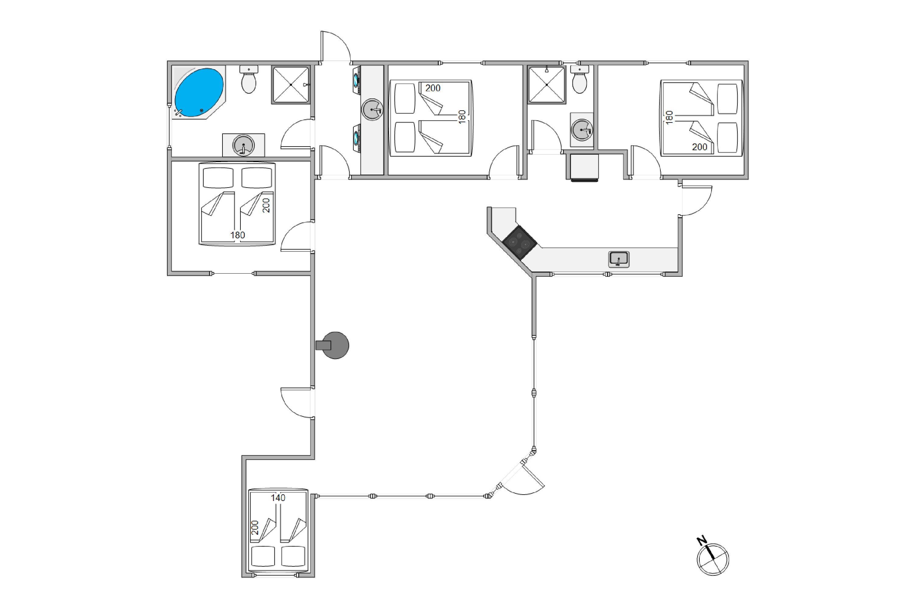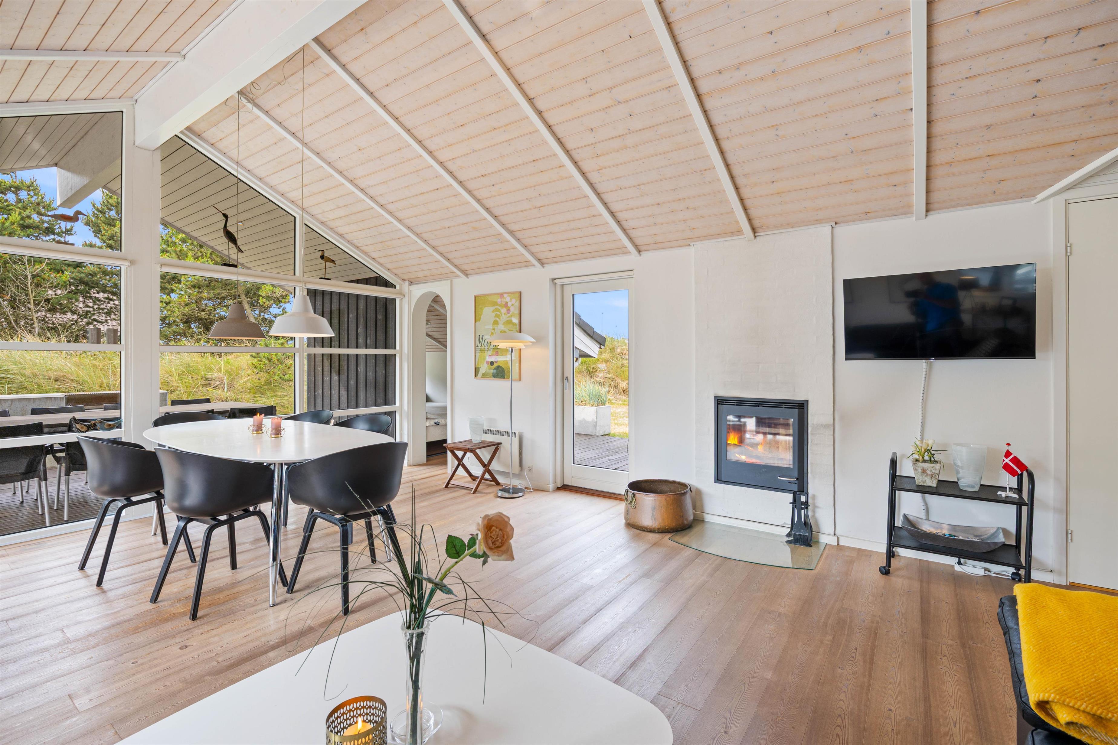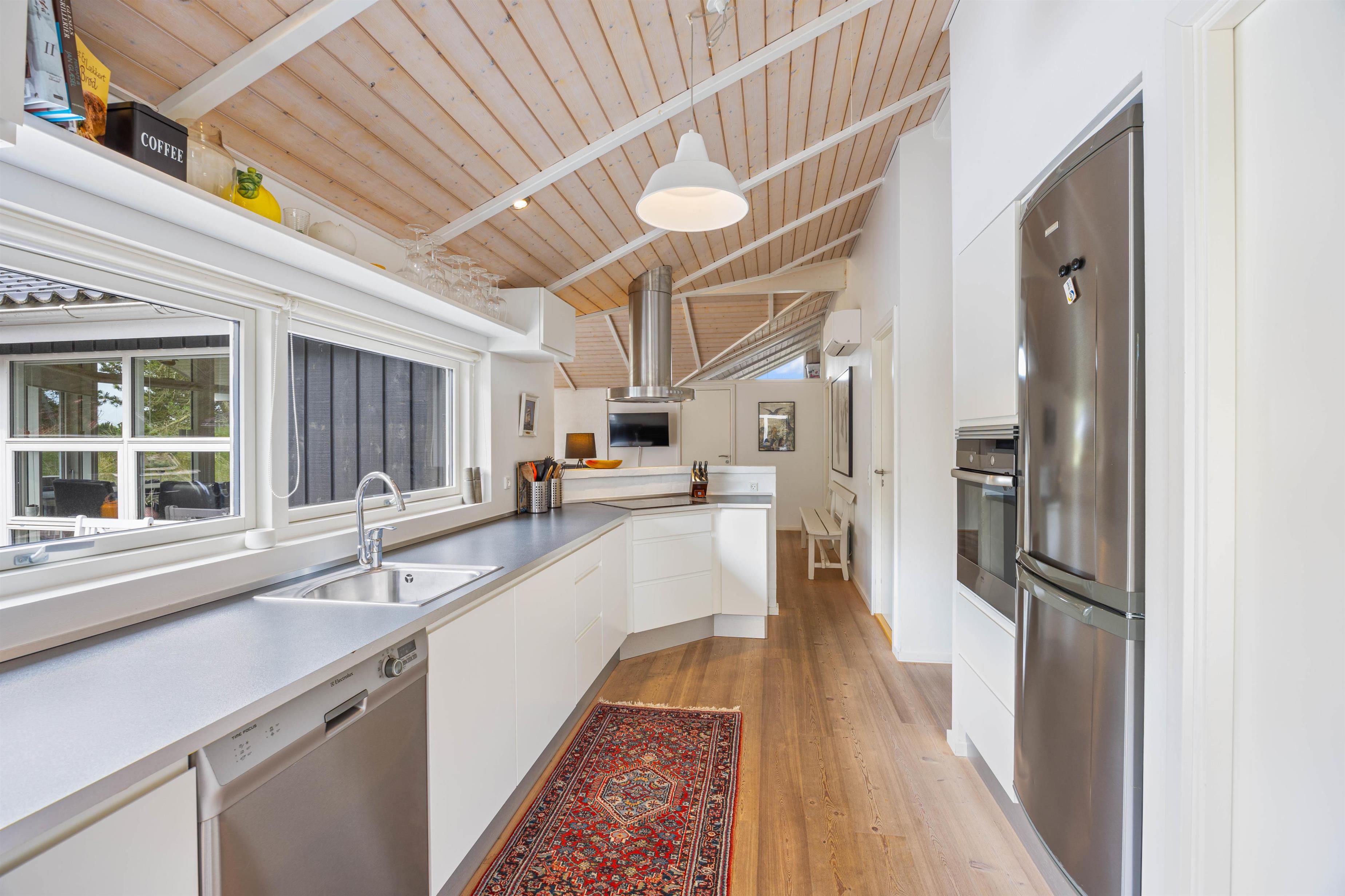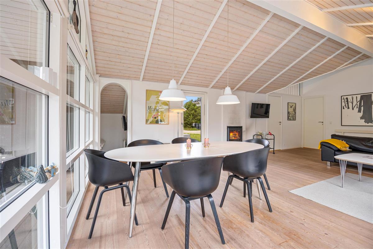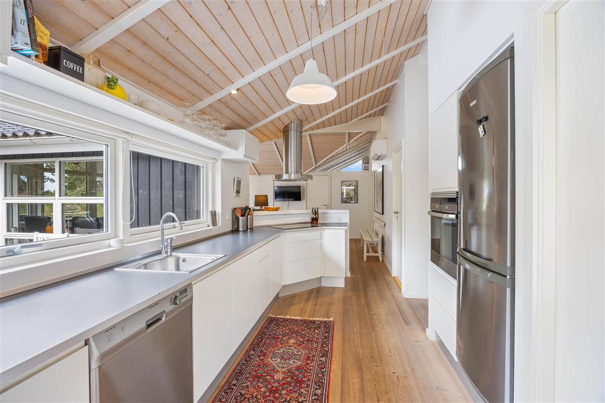This spacious vacation home with 105 square meters welcomes you with open arms. At Hvidbjergvej 21 in Søndervig, you will find a classic vacation home with a high wood-paneled ceiling and light-colored walls and floors in the living area, which gives you a nice impression of space. Here you can enjoy a wonderful vacation as a family all year round. The three bedrooms are spacious and equipped with wardrobes, and there are also 2 beautiful bathrooms, the larger of which is equipped with a whirlpool. On cooler evenings, you can cozy up by the cozy wood-burning stove in the living room with a hot cocoa. The vacation home's energy-saving air-to-air heat pump ensures a pleasant temperature in the vacation home all year round.