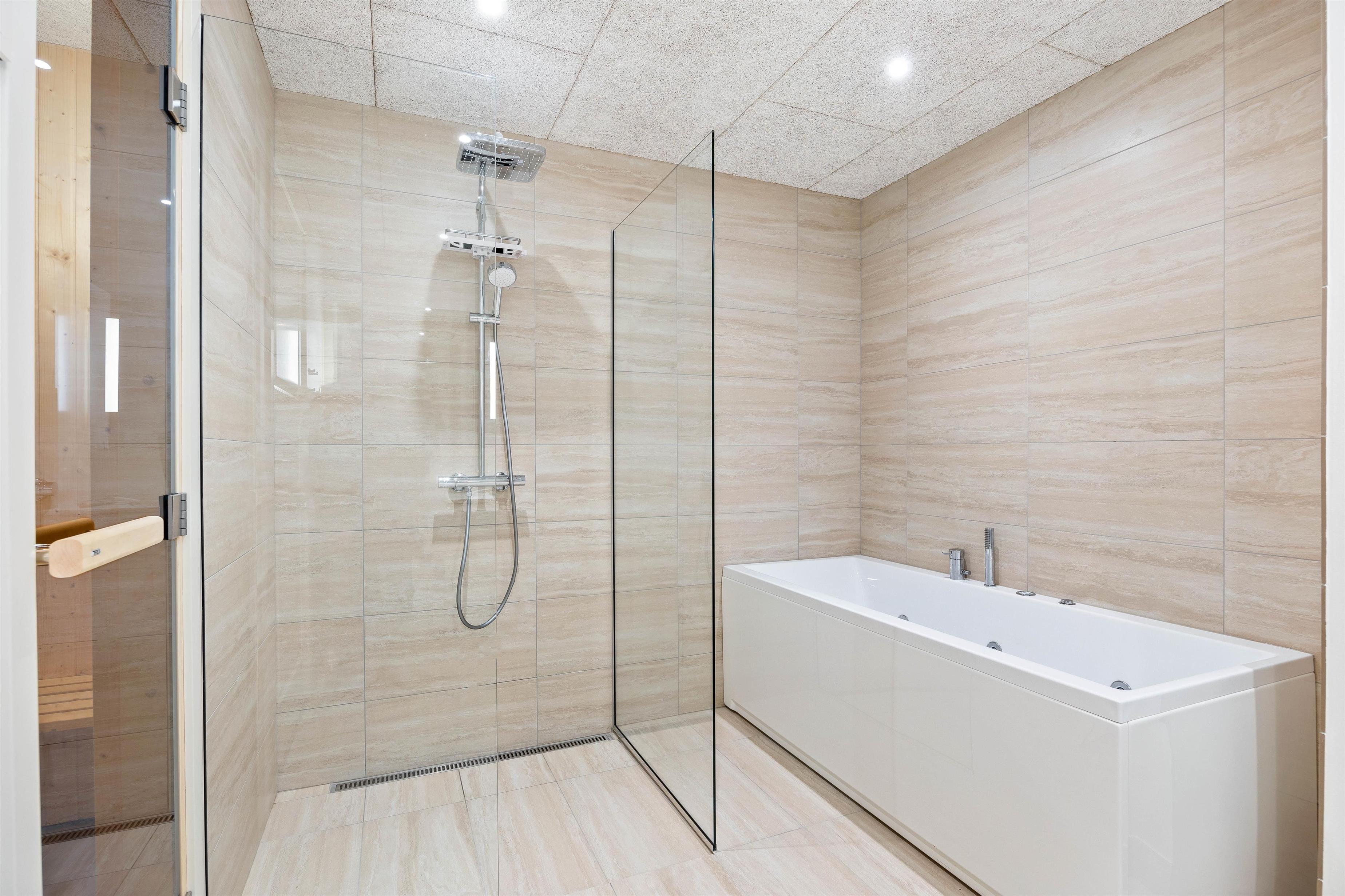 The living area, upper bathroom, and guest toilet are equipped with underfloor heating, powered by an energy-efficient air-to-water heat pump. This ensures warm feet, particularly during the colder months. The upper floor features two bedrooms - one with a double bed and another with two single beds. To help reduce your luggage, the bathroom includes a washing machine and tumble dryer. After a long beach walk, pure relaxation awaits as you enjoy the sauna and whirlpool.