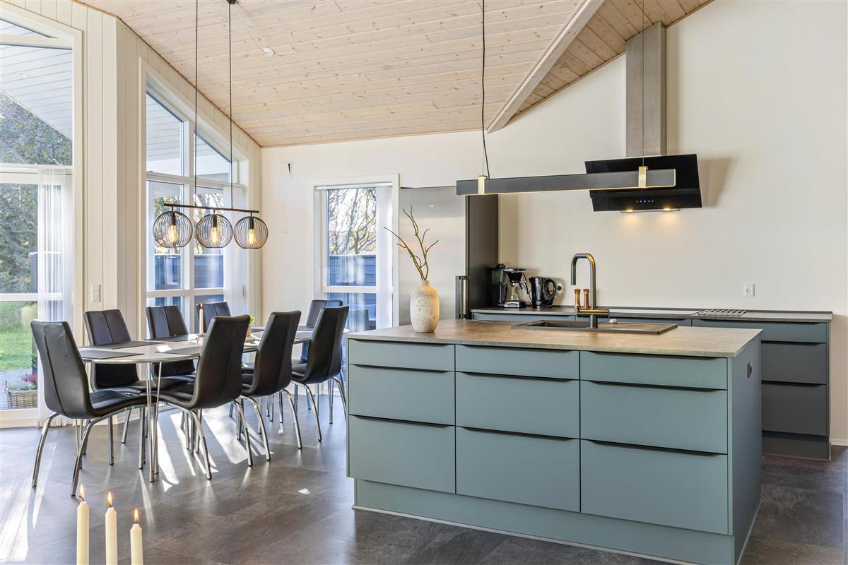Dieses moderne Ferienhaus bietet dank der großen Fensterfronten in der Wohnküche einen fantastischen Lichteinfall. Das Herzstück des Ferienhauses ist das einladende Wohnzimmer, das offen mit der modernen Wohnküche verbunden ist. Hier kann sich die ganze Familie versammeln – einige bereiten das Essen zu, andere spielen Brettspiele am Esstisch, während die Kinder sich auf der Empore mit Blick auf den Raum vergnügen. Gleichzeitig kann man die gemütliche Atmosphäre rund um den Holzofen genießen, der für echte Ferienhausstimmung sorgt. Der gesamte Wohnbereich ist mit Fußbodenheizung und einer energieeffizienten Luft-Luft-Wärmepumpe ausgestattet, die das ganze Jahr über für ein angenehmes Raumklima und zusätzlichen Komfort sorgt.