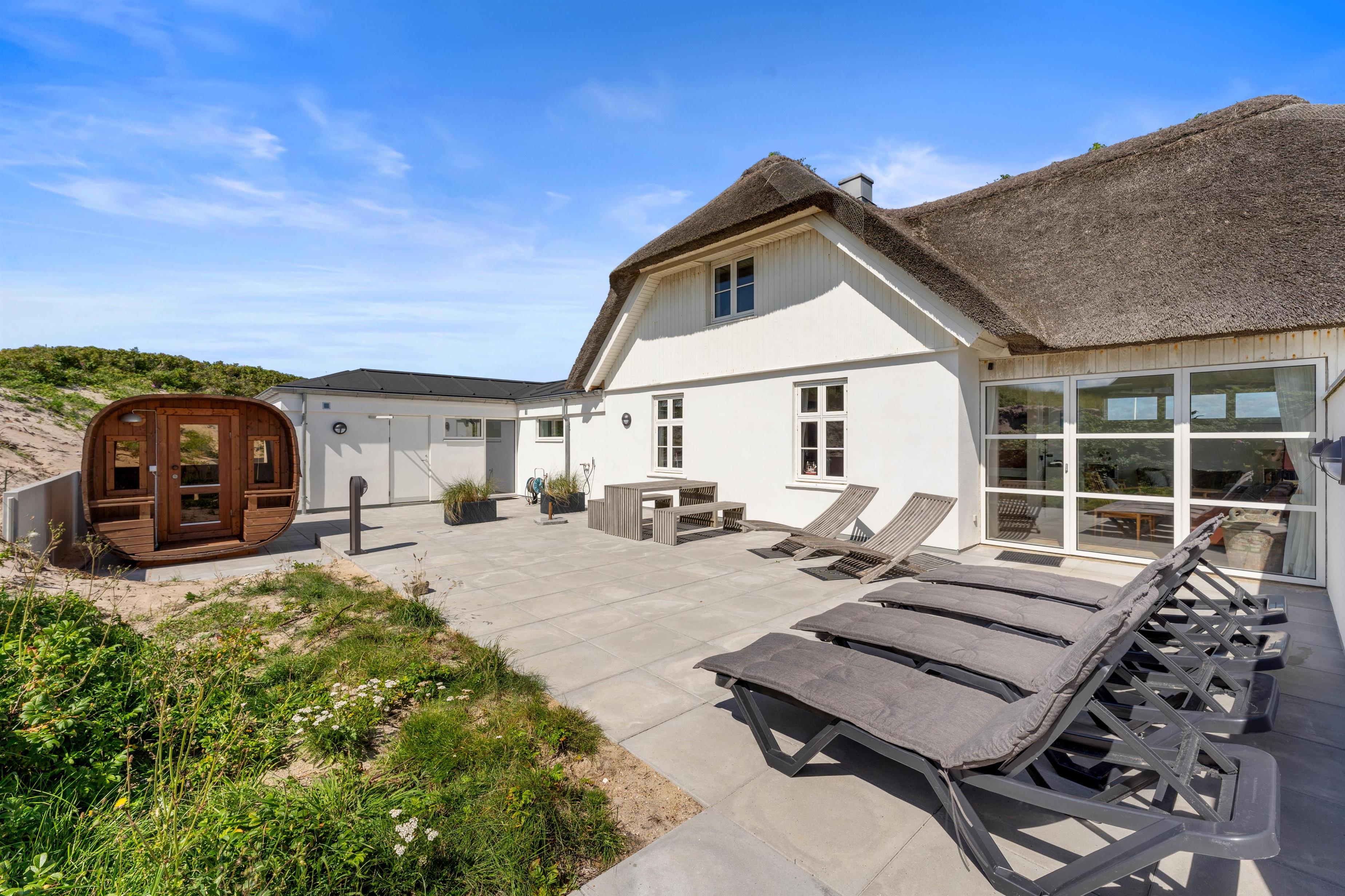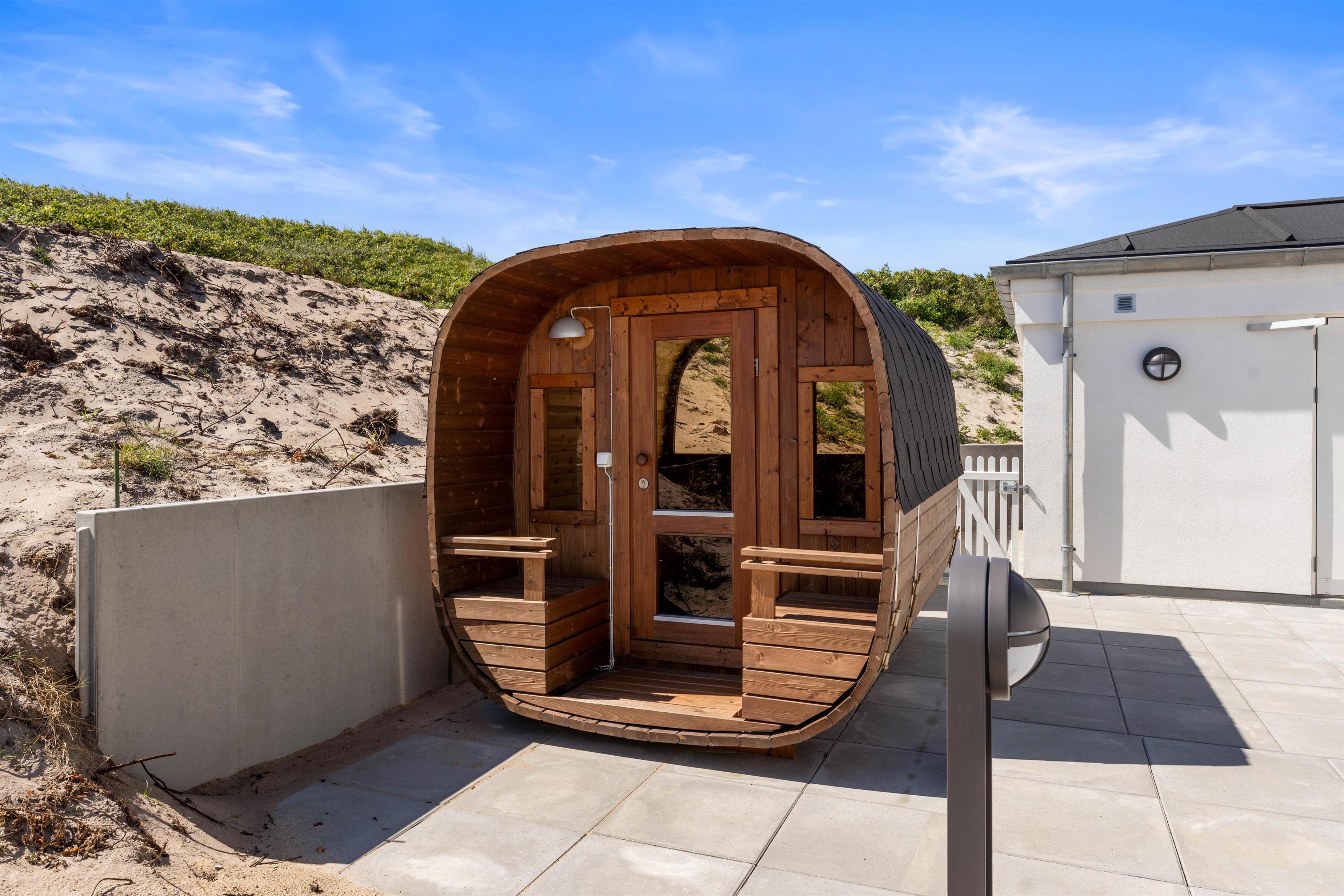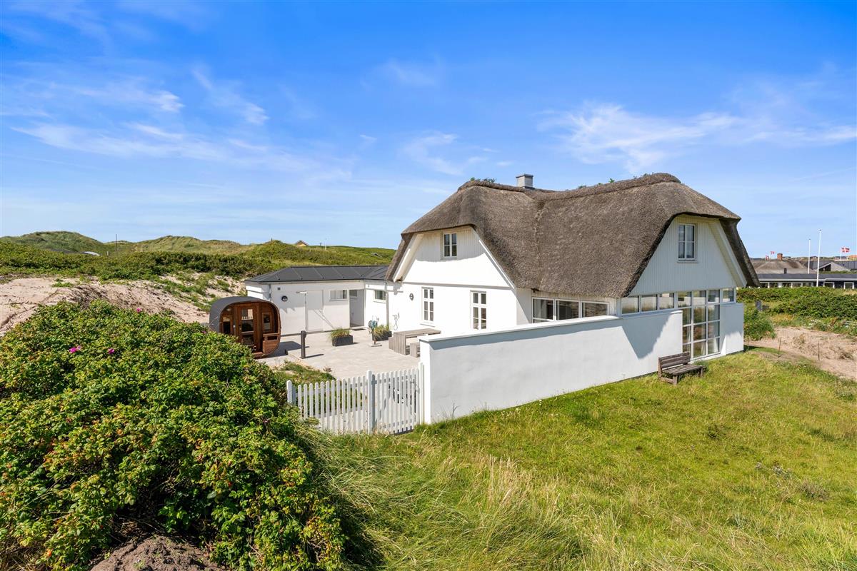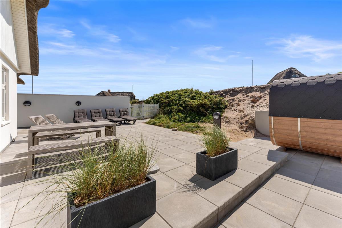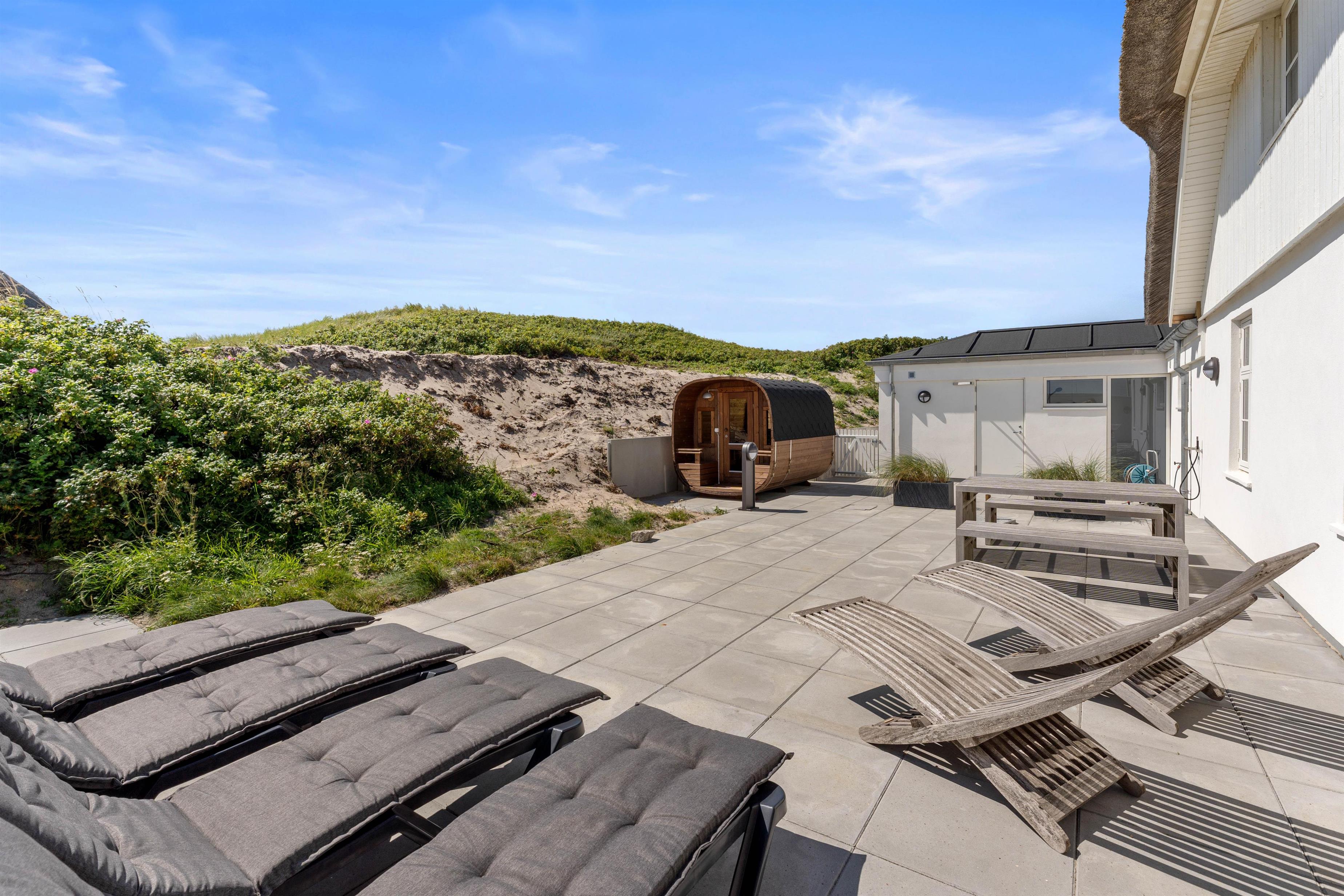 The holiday home at Hafavej 61 features several beautiful terraces where you can spend time together. On the terraces, which were extended in 2024, you can relax in the garden furniture and sun loungers, enjoying the fresh air and sound of the sea. The enclosed terrace ensures everyone stays safely within the grounds. In the evening, fire up the barbecue and enjoy a delicious dinner while the sun sets behind the dunes. For total relaxation, there's a splendid outdoor sauna at the holiday home. You can also walk to the top of the dunes to experience breathtaking sunsets.