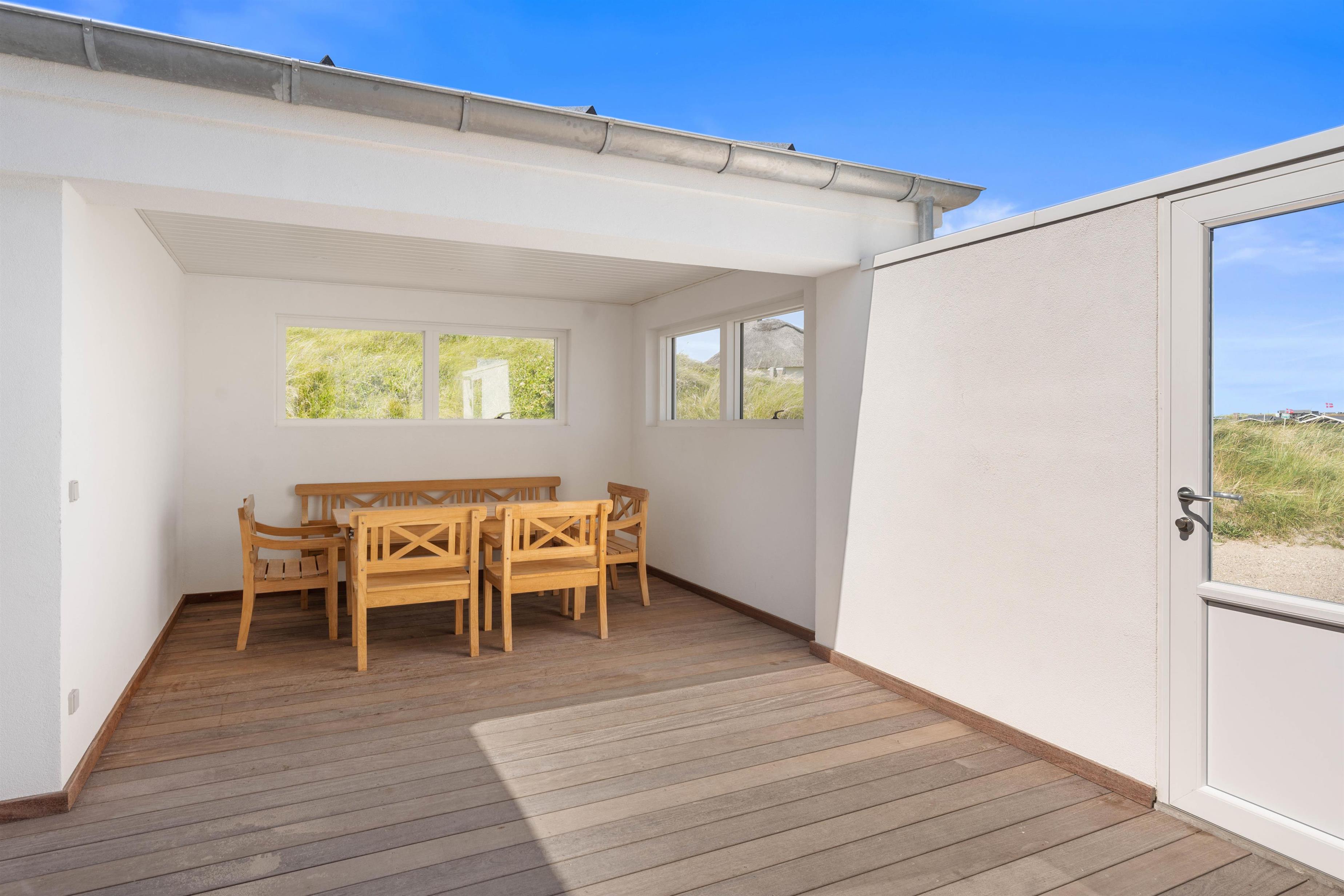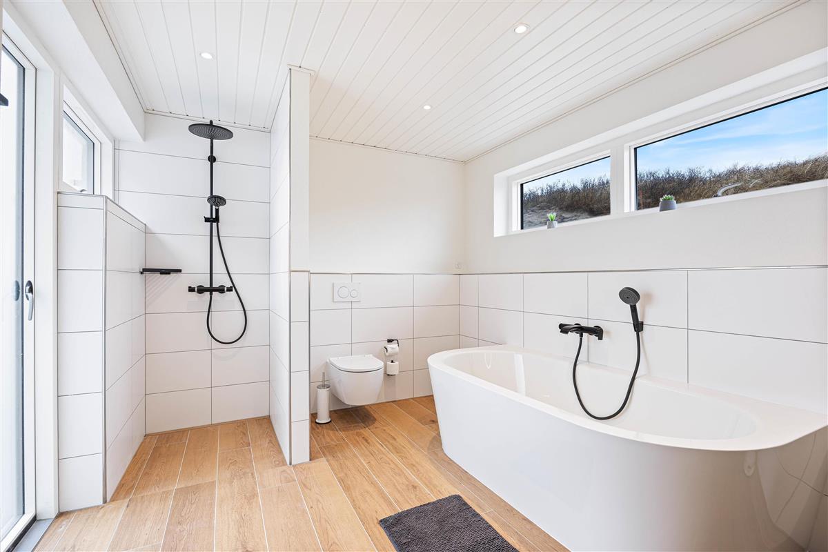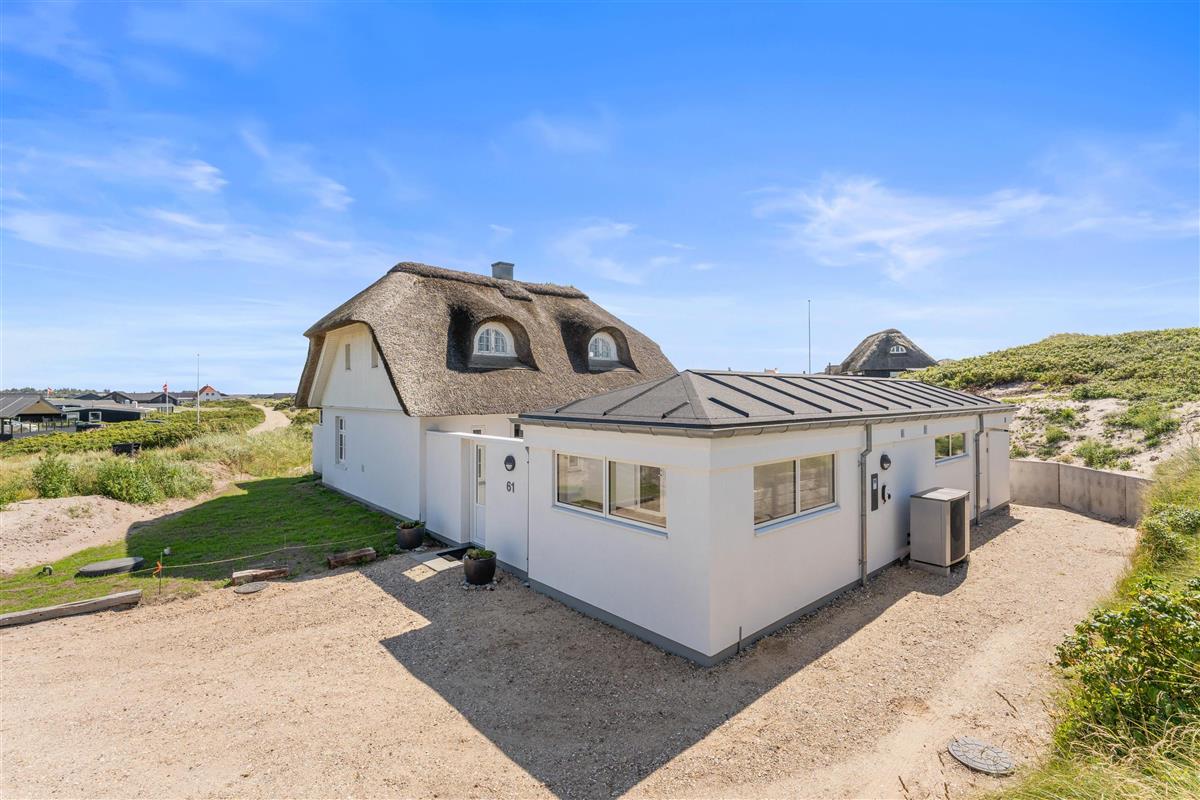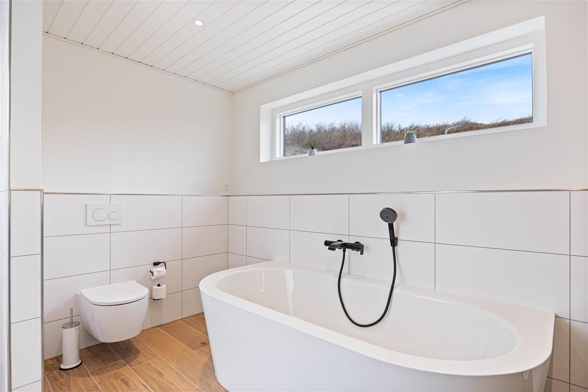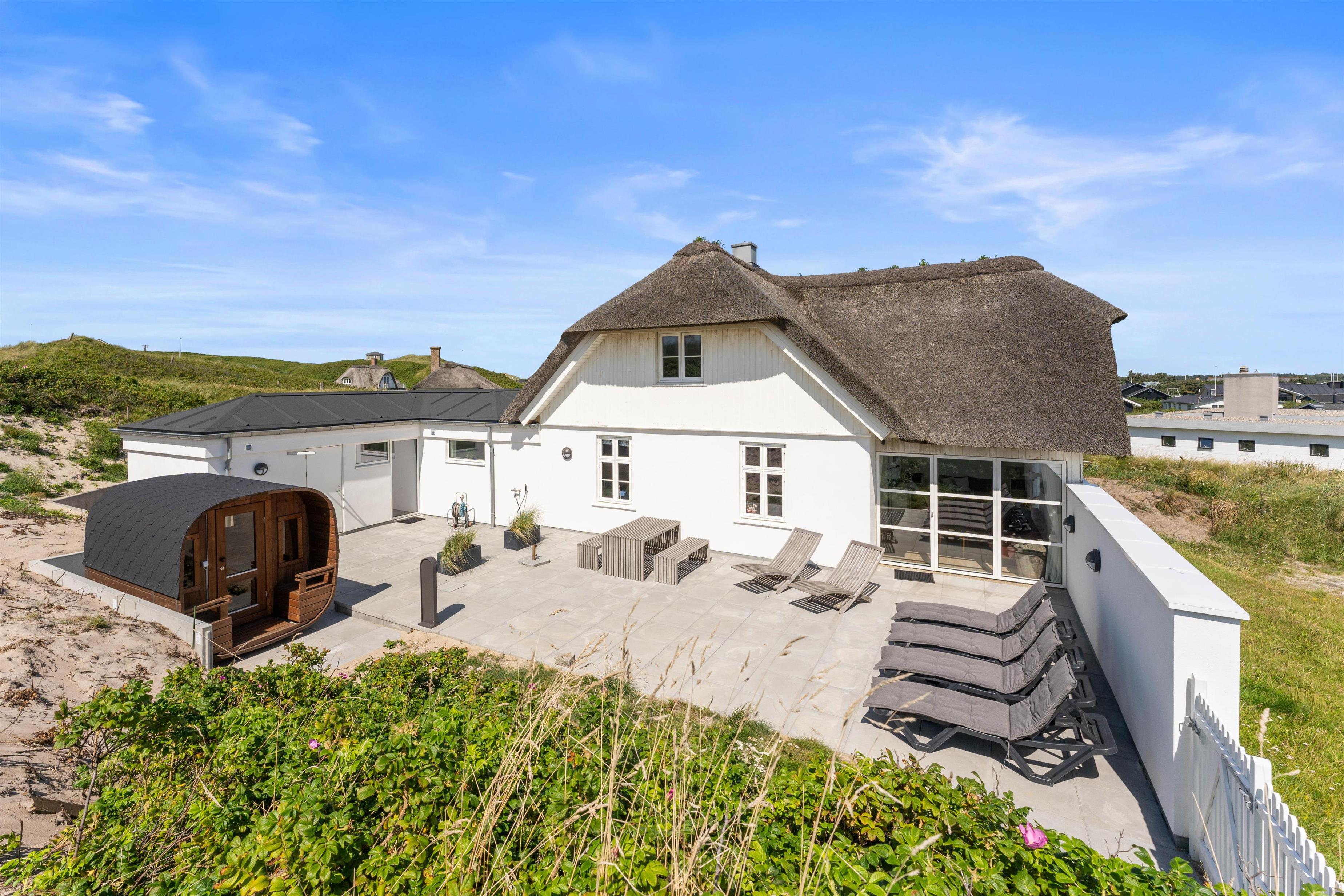 The holiday home at Hafavej 61 features several beautiful terraces where you can spend time together. On the terraces, which were extended in 2024, you can relax in the garden furniture and sun loungers, enjoying the fresh air and sound of the sea. The enclosed terrace ensures everyone stays safely within the grounds. In the evening, fire up the barbecue and enjoy a delicious dinner while the sun sets behind the dunes. For total relaxation, there's a splendid outdoor sauna at the holiday home. You can also walk to the top of the dunes to experience breathtaking sunsets.