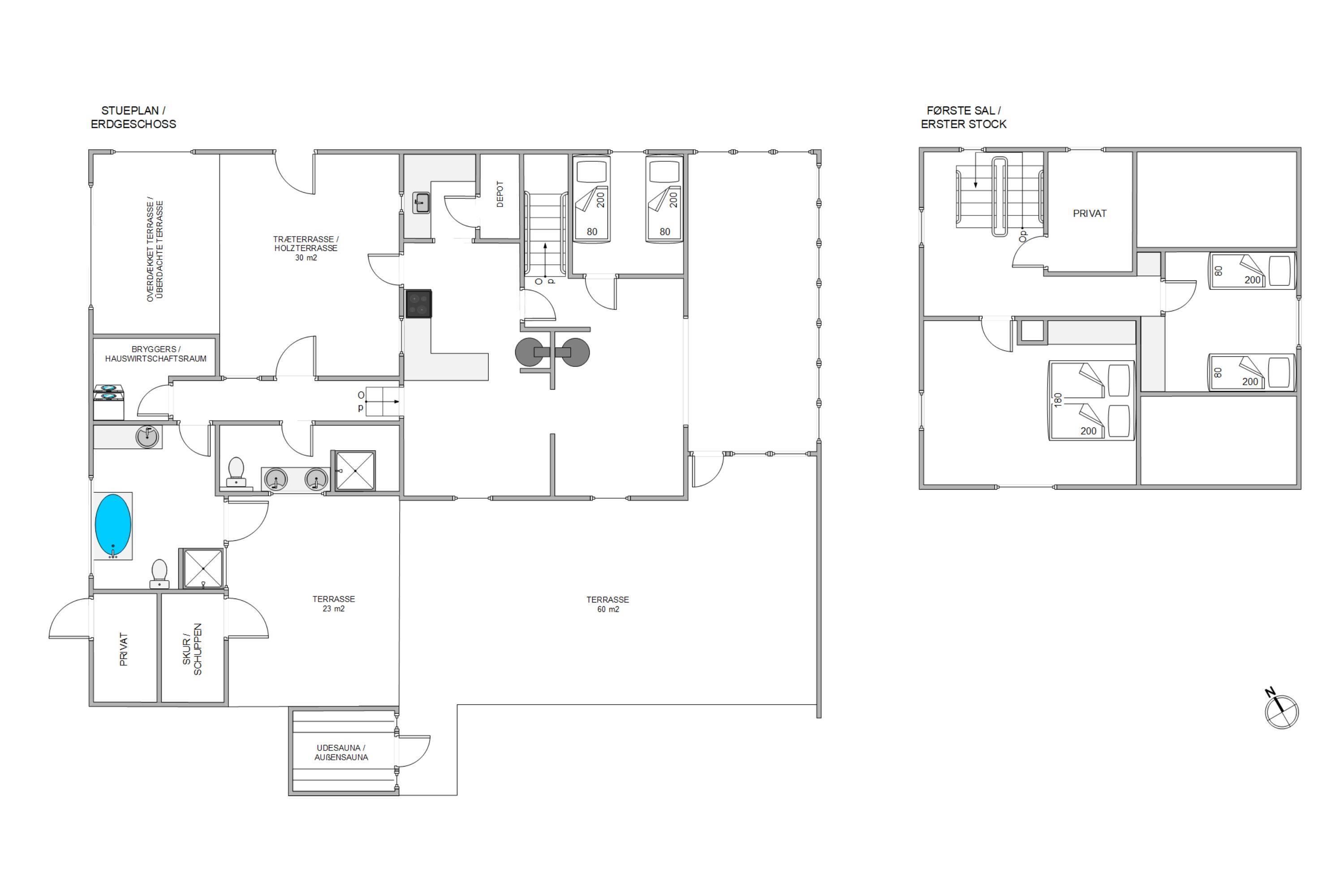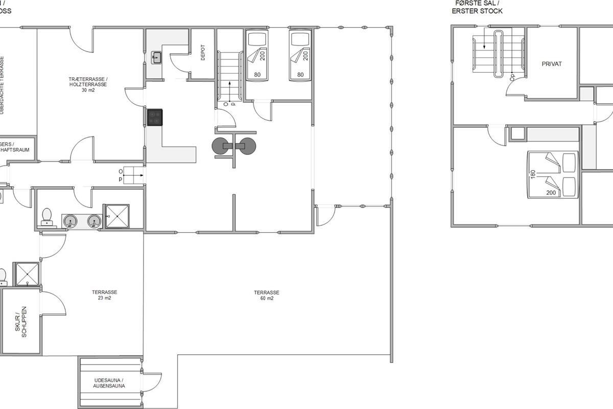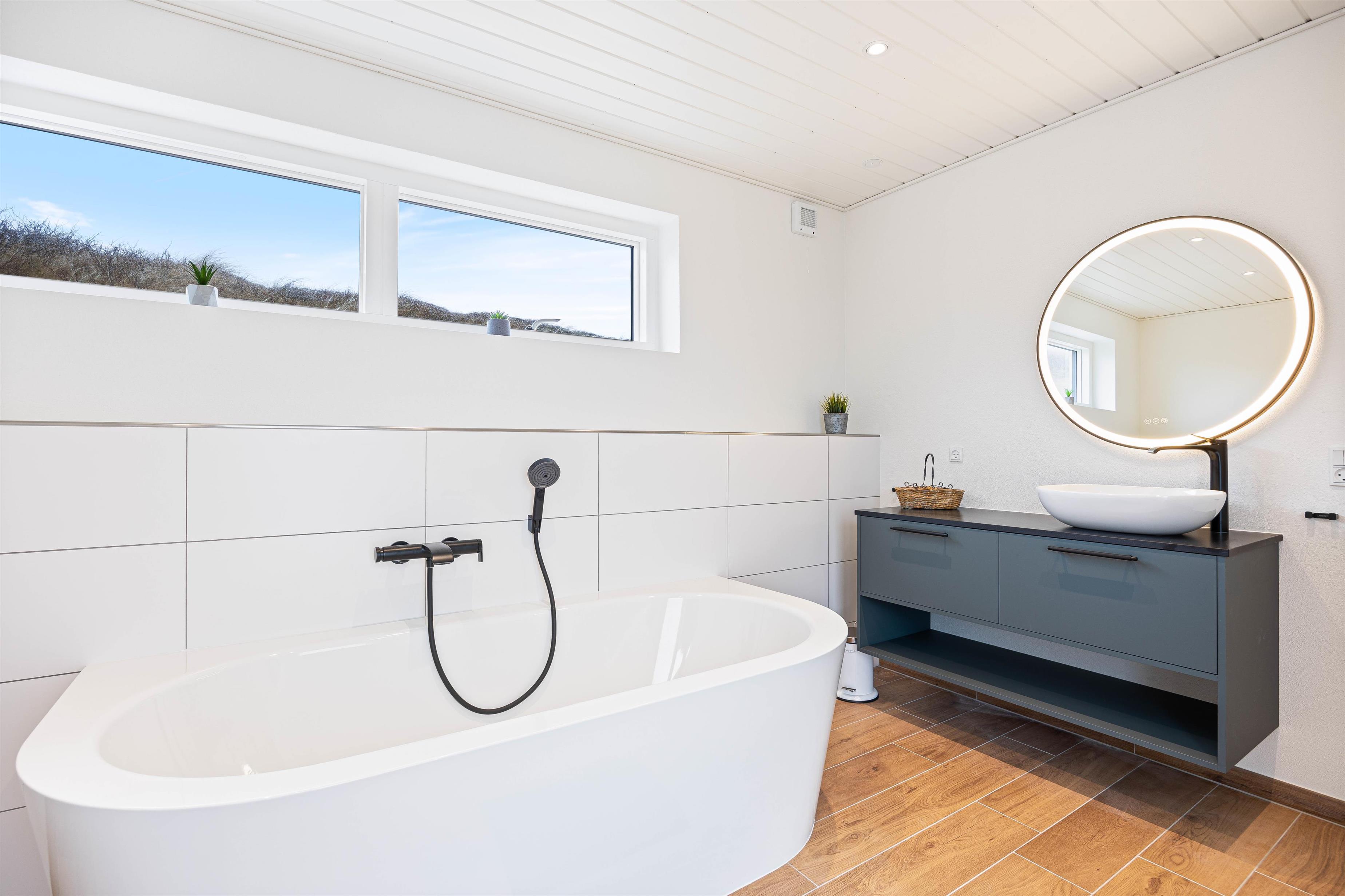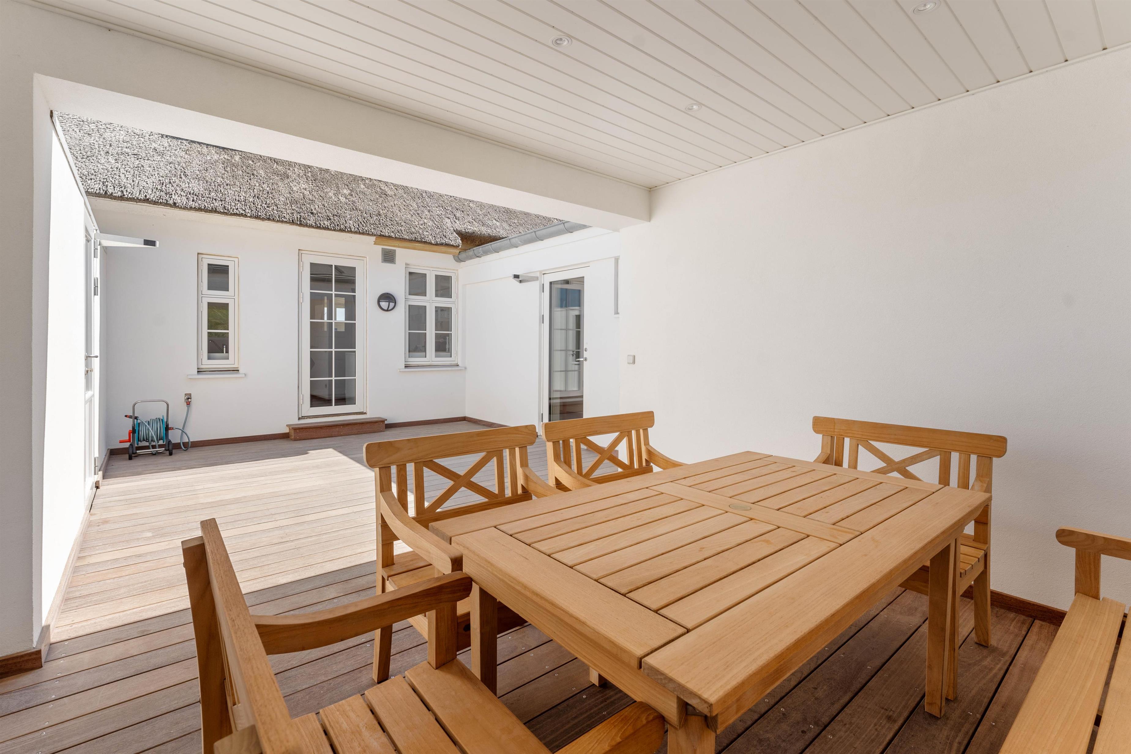 The holiday home at Hafavej 61 features several beautiful terraces where you can spend time together. On the terraces, which were extended in 2024, you can relax in the garden furniture and sun loungers, enjoying the fresh air and sound of the sea. The enclosed terrace ensures everyone stays safely within the grounds. In the evening, fire up the barbecue and enjoy a delicious dinner while the sun sets behind the dunes. For total relaxation, there's a splendid outdoor sauna at the holiday home. You can also walk to the top of the dunes to experience breathtaking sunsets.