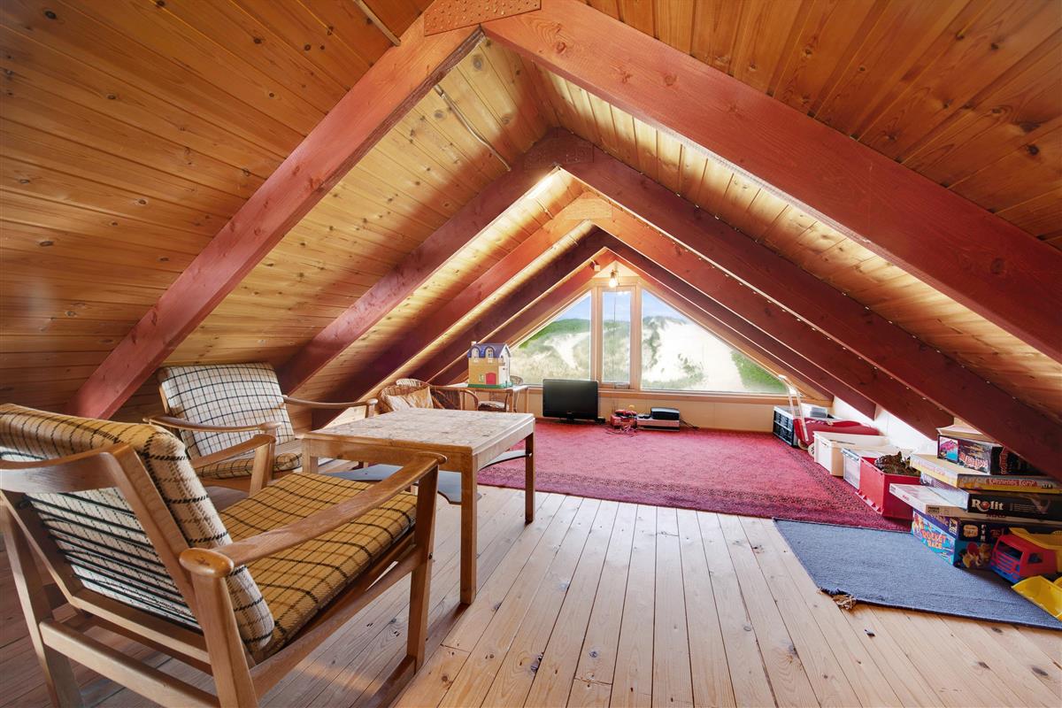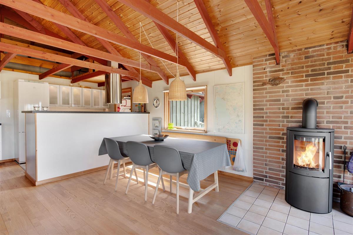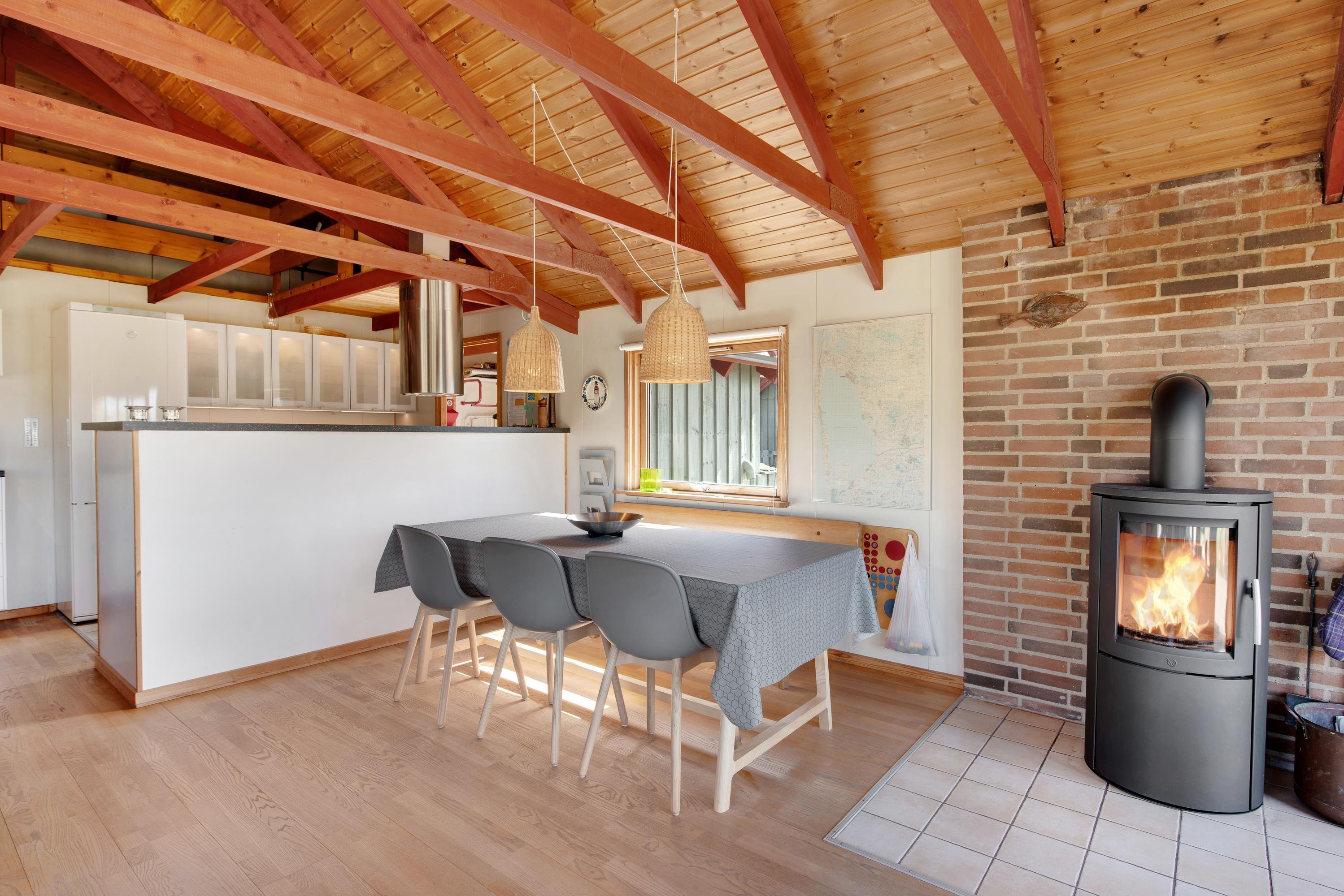 The living room opens onto the modern, well-equipped kitchen, and on calm evenings, you can light a fire in the fireplace. The crackling of the wood creates an especially cosy atmosphere - whether you choose to watch your favourite series or bring out a board game is entirely up to you.