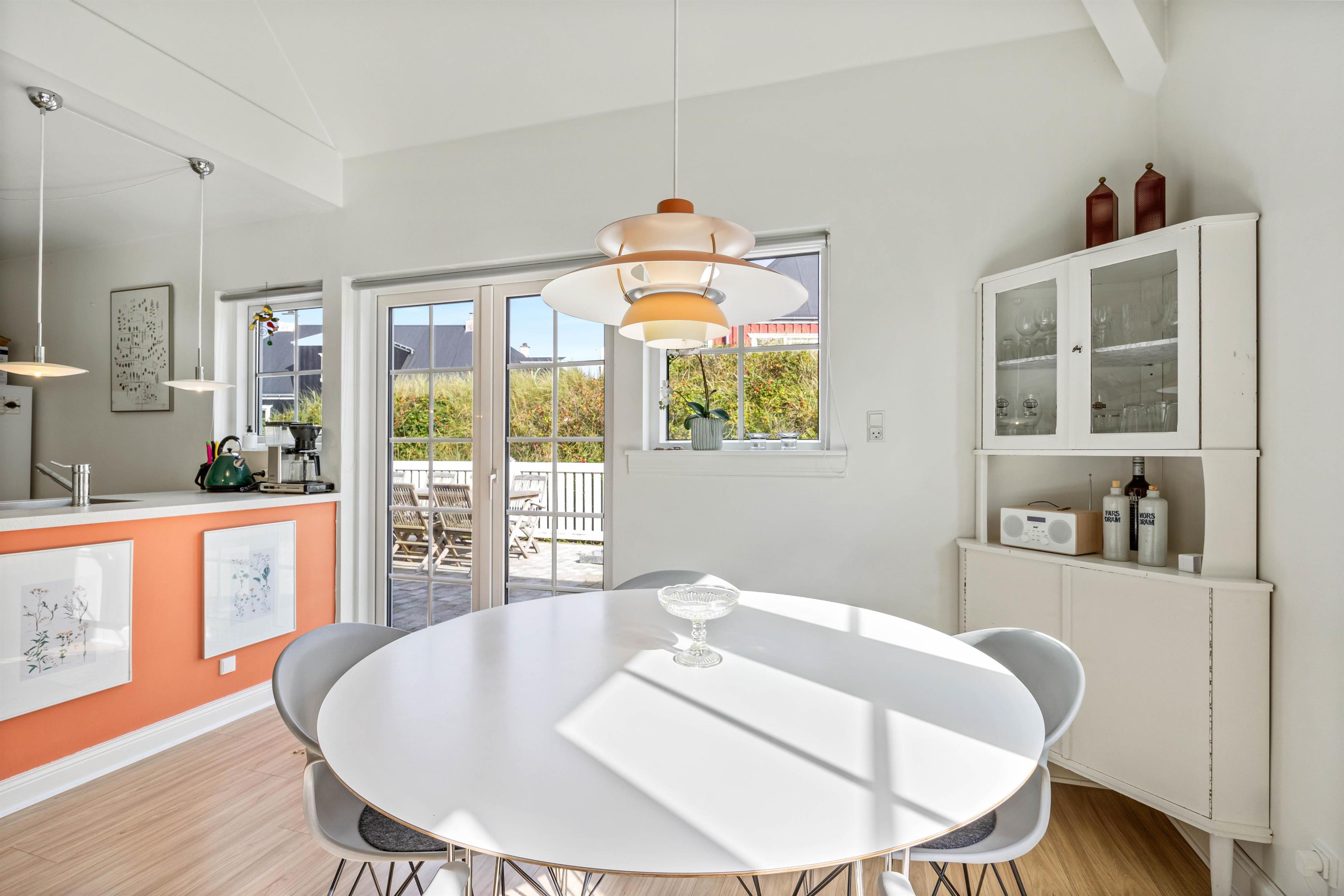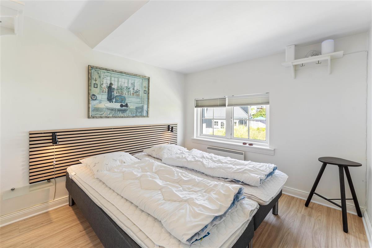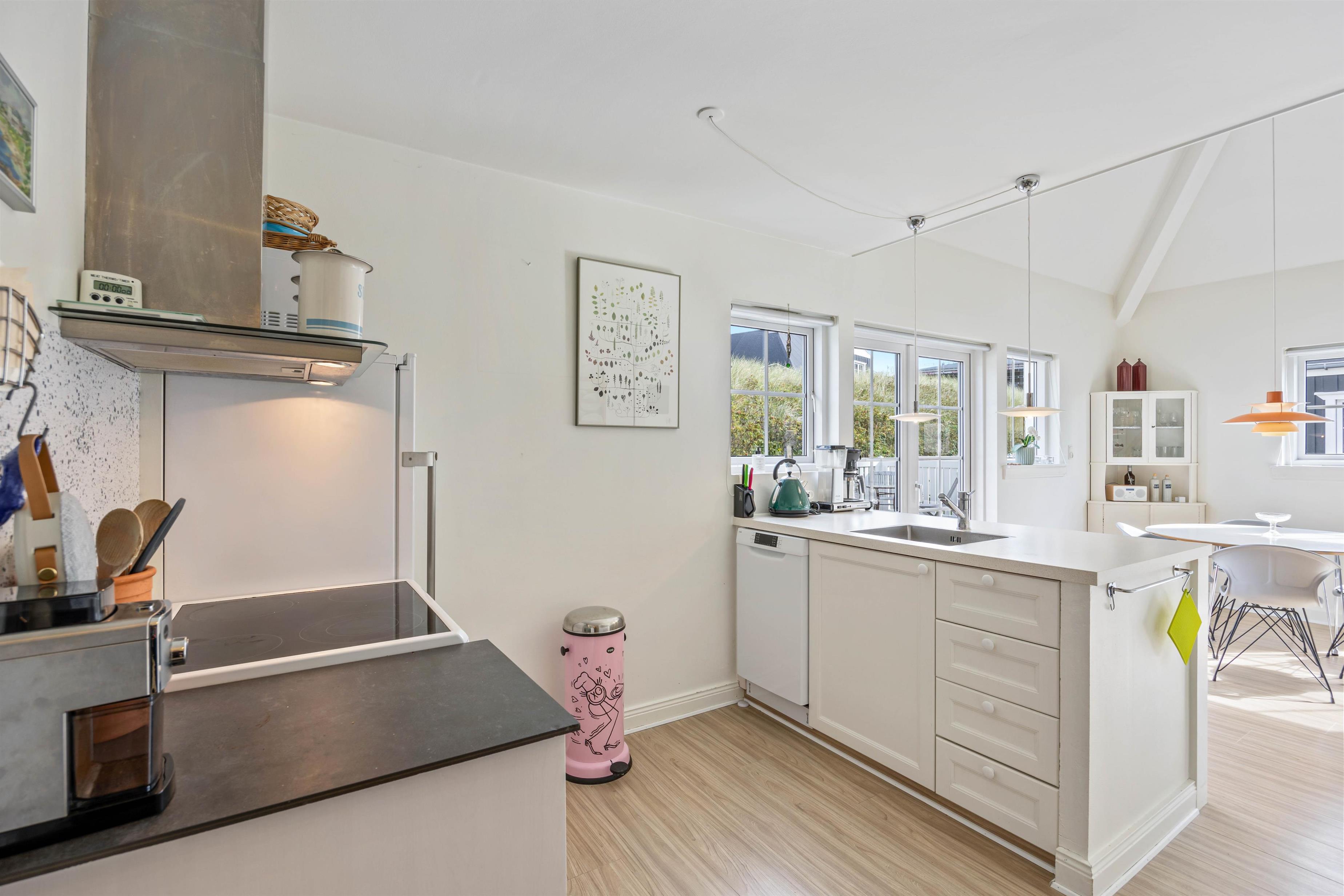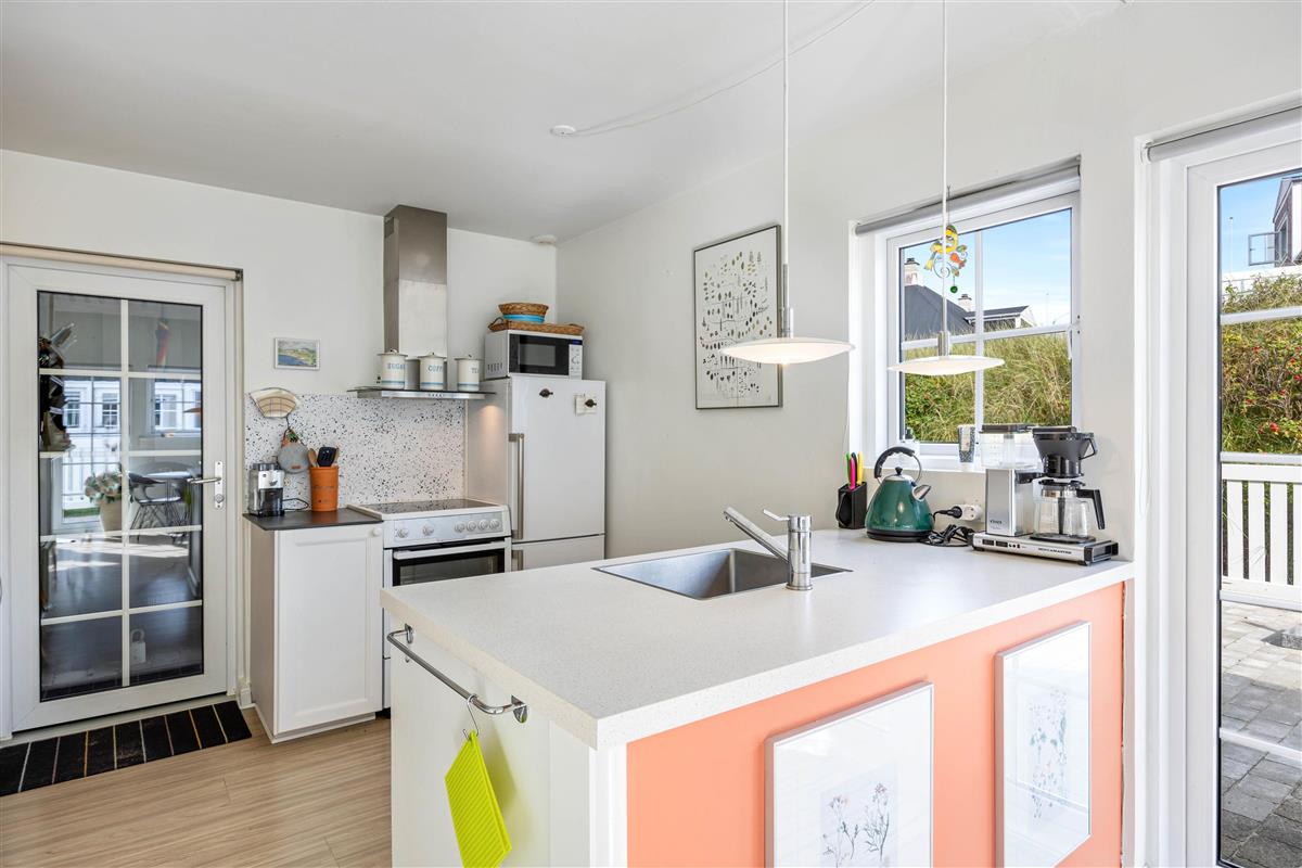 This holiday apartment welcomes you in central Søndervig with its bright, friendly atmosphere. You'll immediately feel at home and ready to start your holiday in complete comfort. The 90-square-metre living space is arranged with a well-equipped kitchen, living and dining area, large bathroom, and guest WC on the ground floor, while the first floor features two bedrooms.