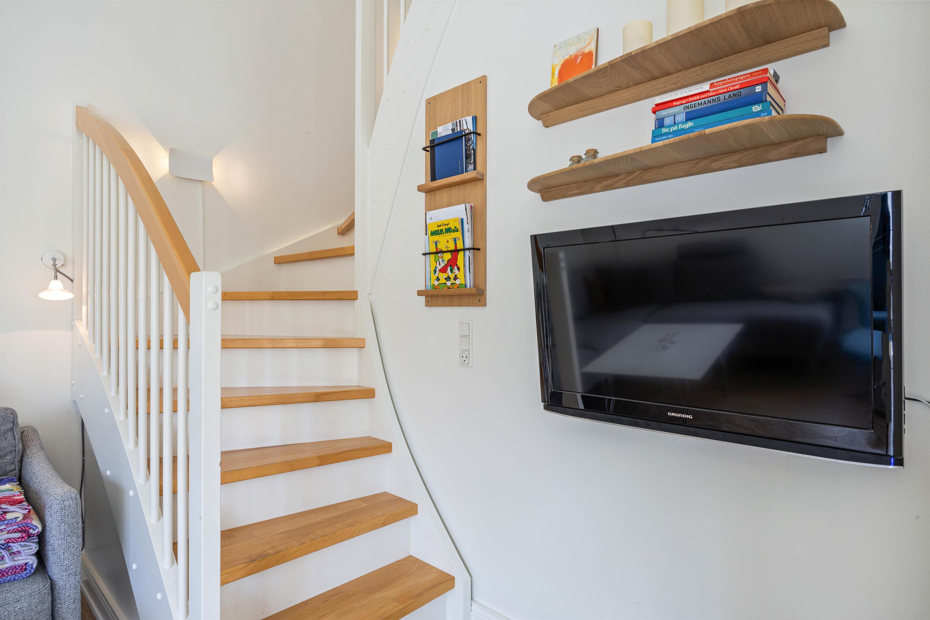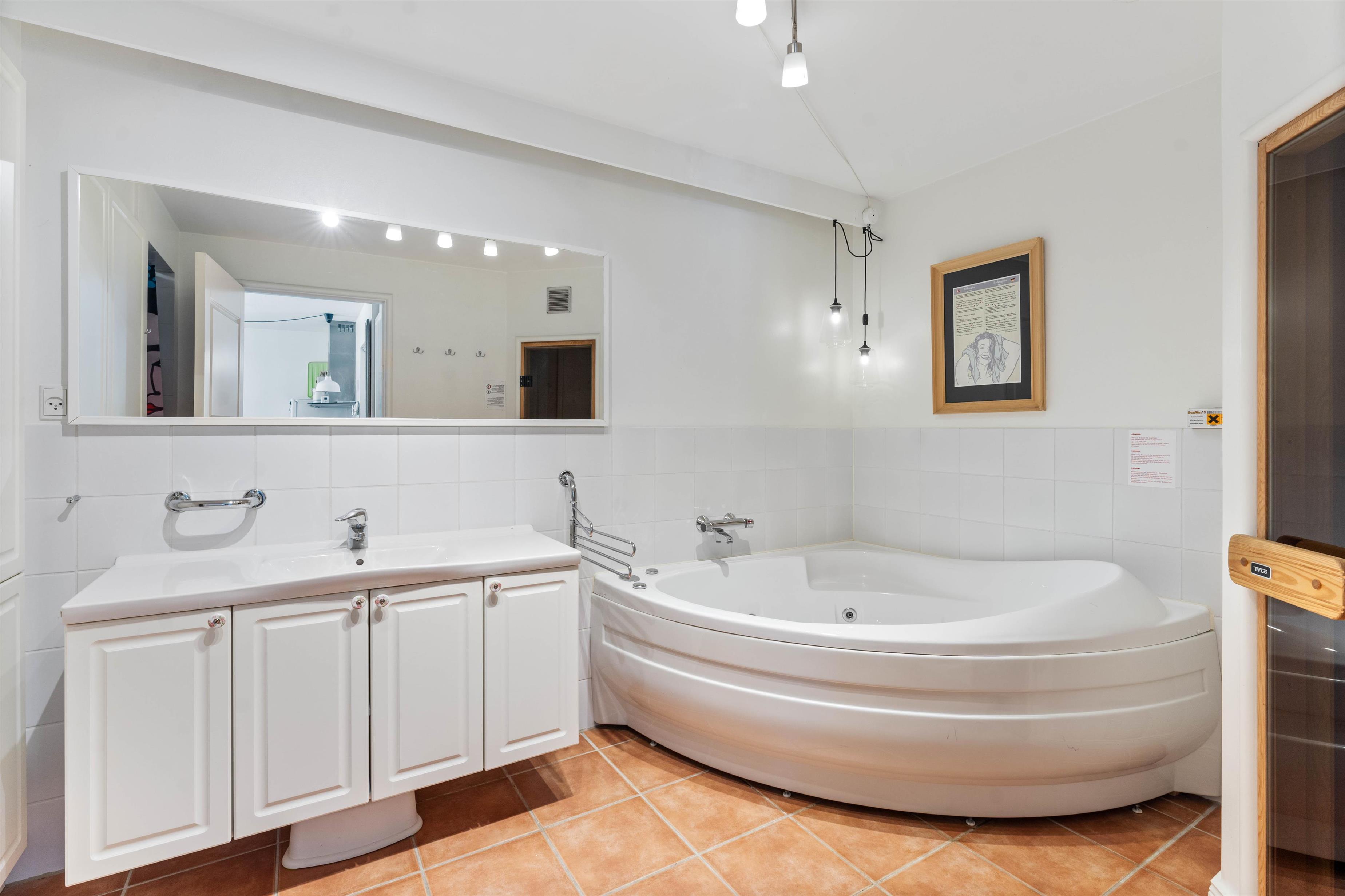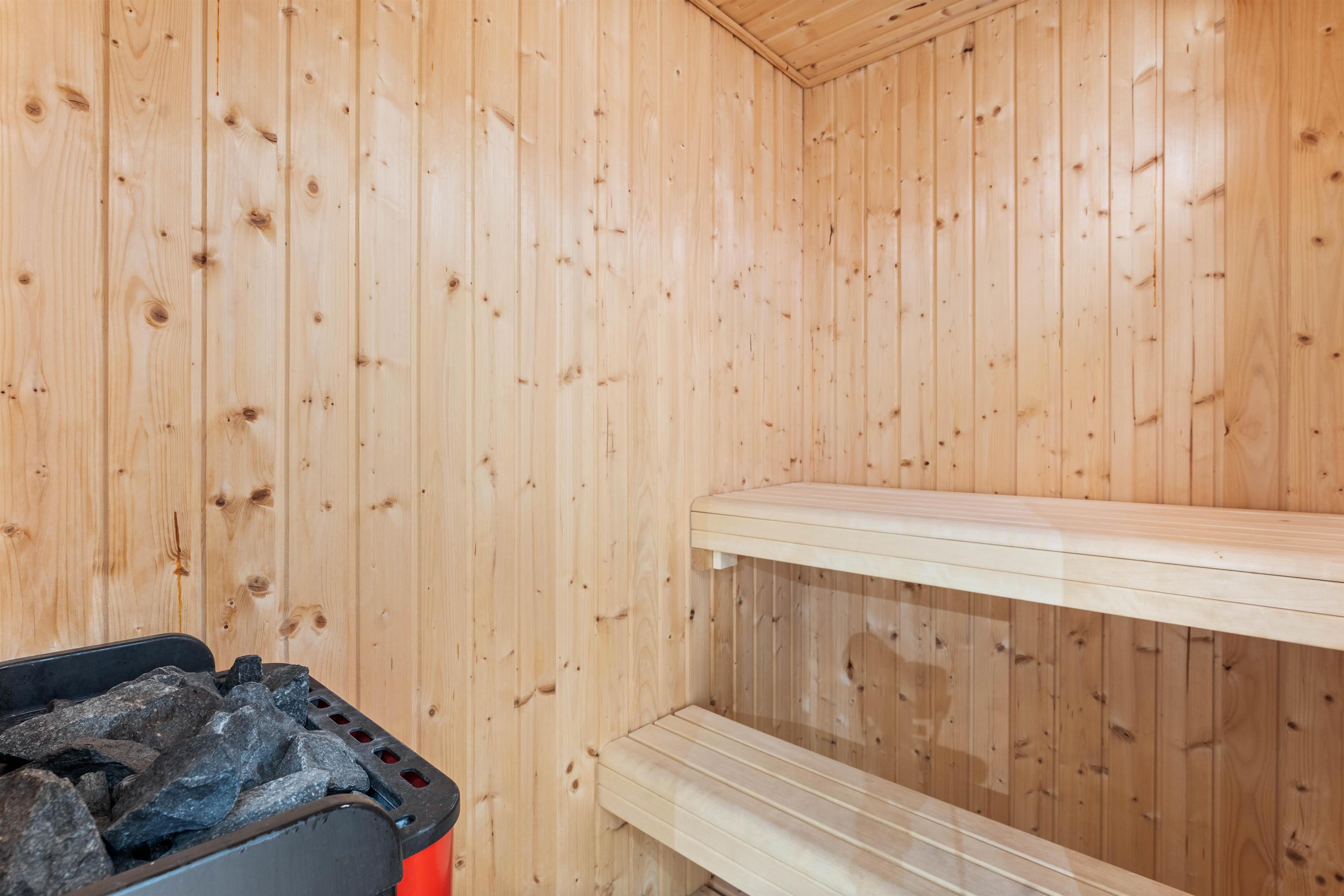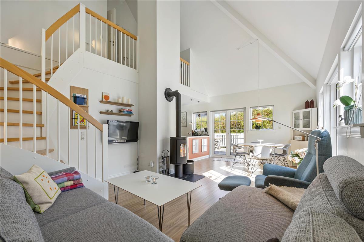 After spending the day sunbathing or taking lengthy walks on the beach, just a short stroll away, you can truly unwind in the apartment. Pamper your muscles in the sauna and whirlpool, then settle down by the fireplace with a nice glass of wine. The comfortable beds upstairs provide restful sleep, helping you recharge for another wonderful holiday ahead. Cooking becomes a pleasure in the well-equipped kitchen, while shared meals in the open-plan dining and living area become memorable experiences. Television is available via streaming services, with no satellite connection installed.