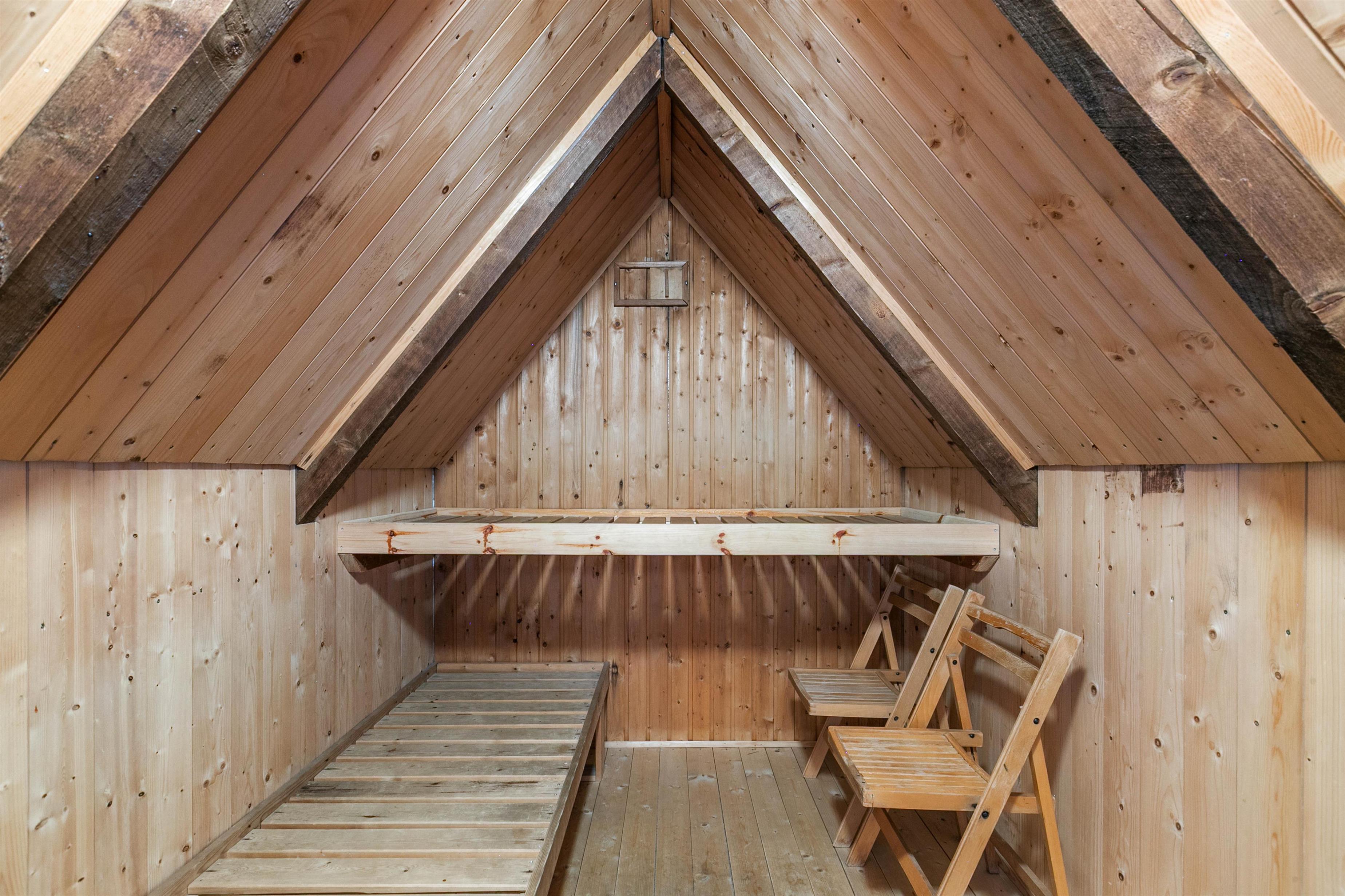 The welcoming living area, with its light walls and white wooden ceiling, opens onto the kitchen and feels beautifully bright and inviting thanks to its angled windows. This space is perfect for spending quality holiday time together.