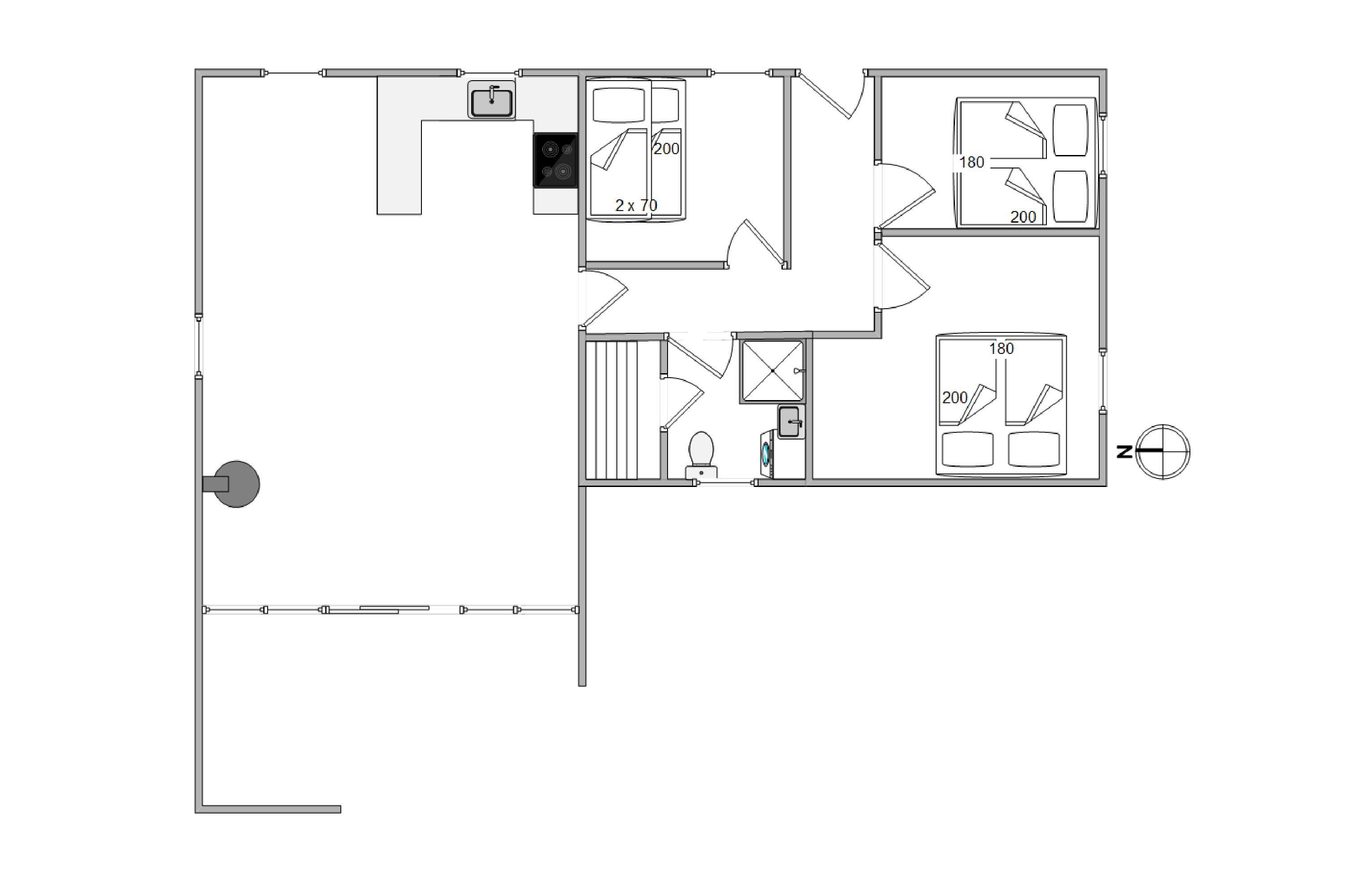 The 79 square metres are divided between the open-plan living and dining area, open-plan kitchen, bathroom, and three bedrooms. A washing machine ensures fresh clothes throughout your stay, while the installed heat pump provides energy-efficient heating.