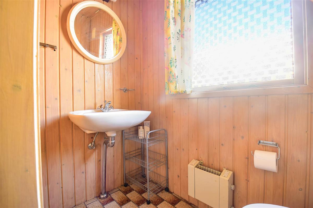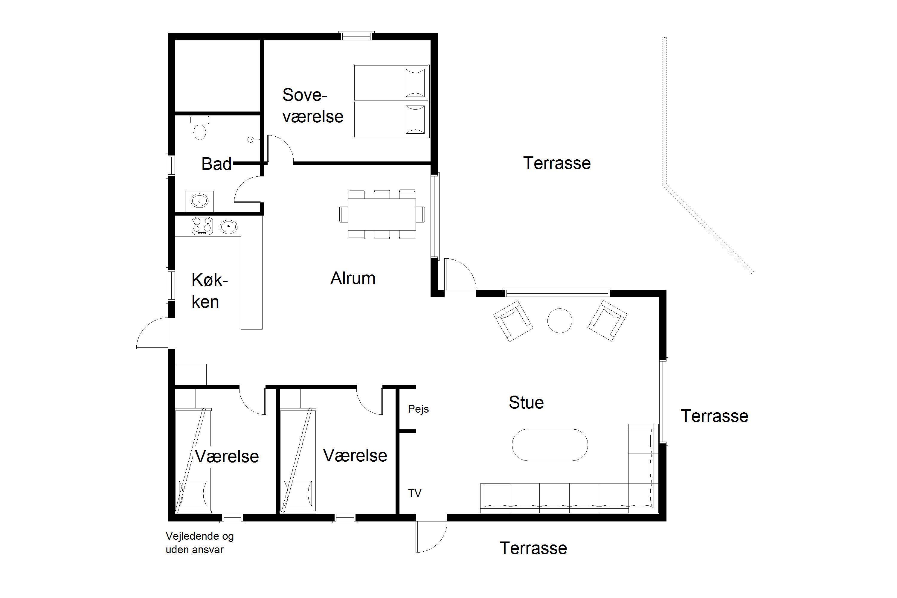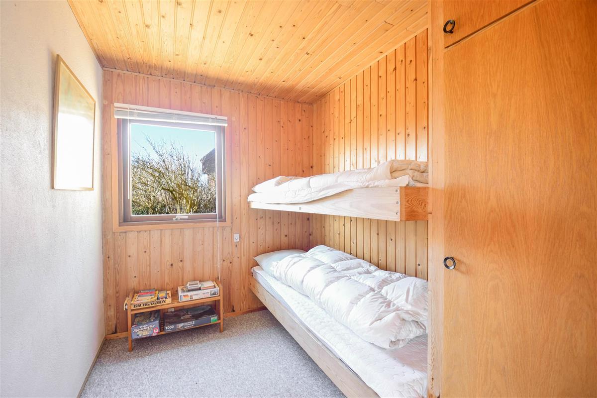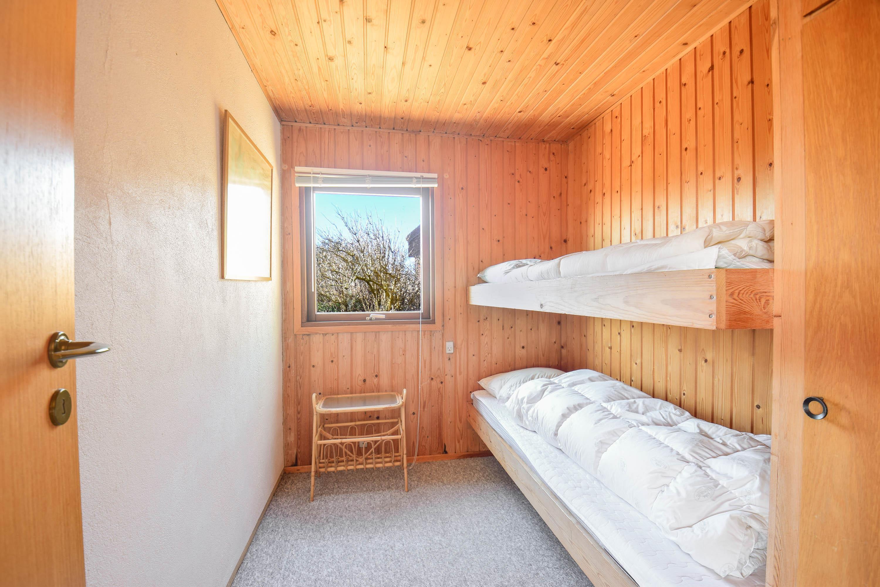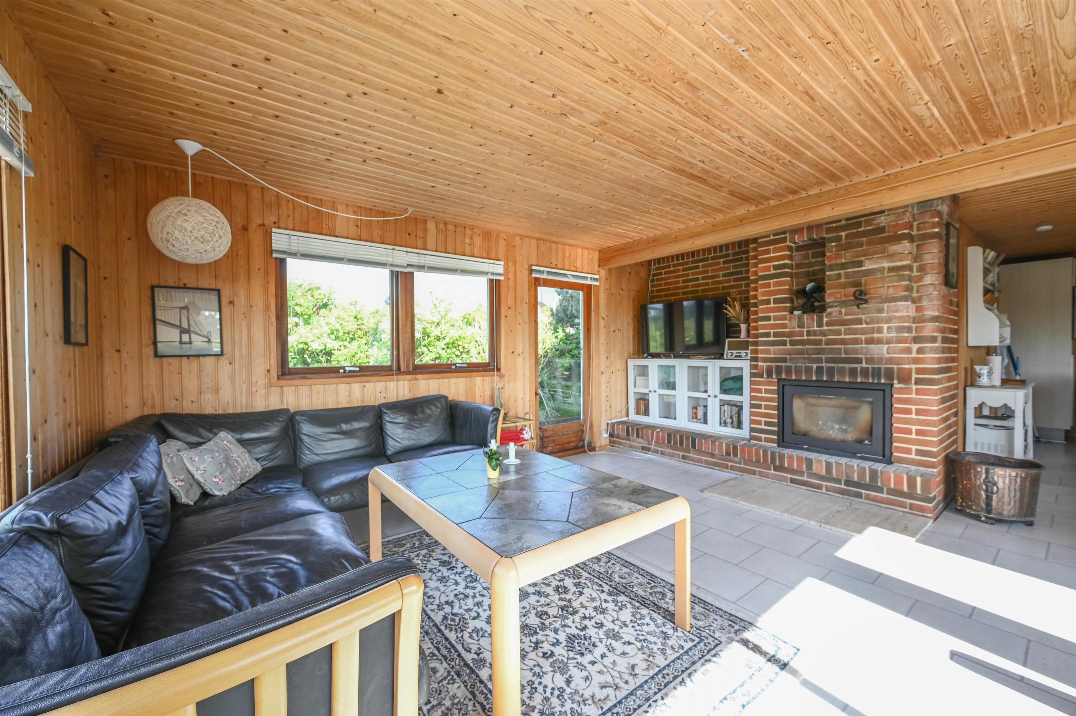 Layout: Large, bright, tiled living room with fireplace, dining area and open kitchen. A total of 3 bedrooms, one with double bed and 2 with bunk beds. Small bathroom with shower niche.