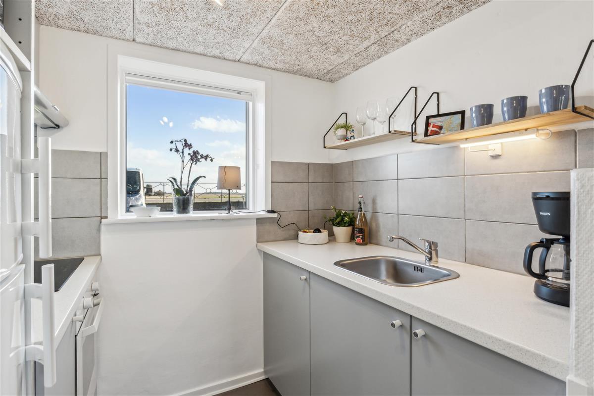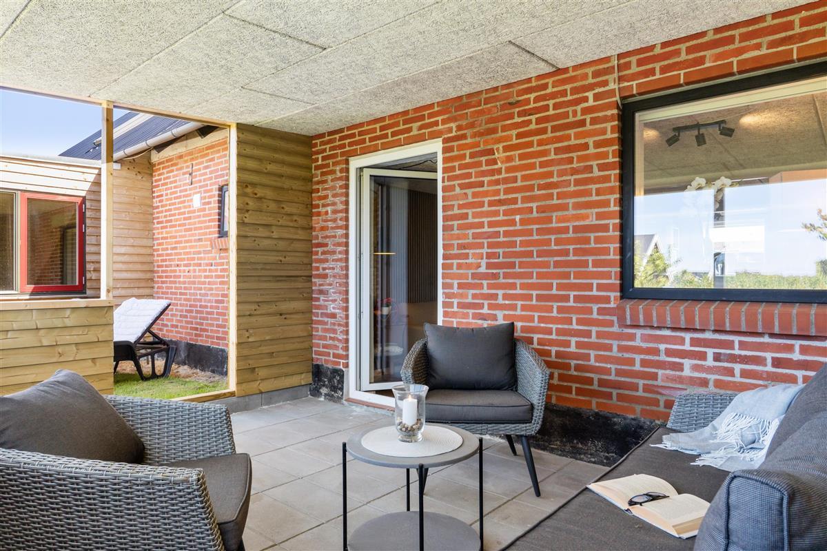 In front of the building, you will find a shared parking area with ample space for your car and a beautiful view of the open landscape towards Ringkøbing Fjord. Behind the building, there are more private outdoor areas with two west-facing terraces, sheltered by fences. Additionally, there is access to a large lawn, which is well-suited for play, ball games, or simply relaxing.