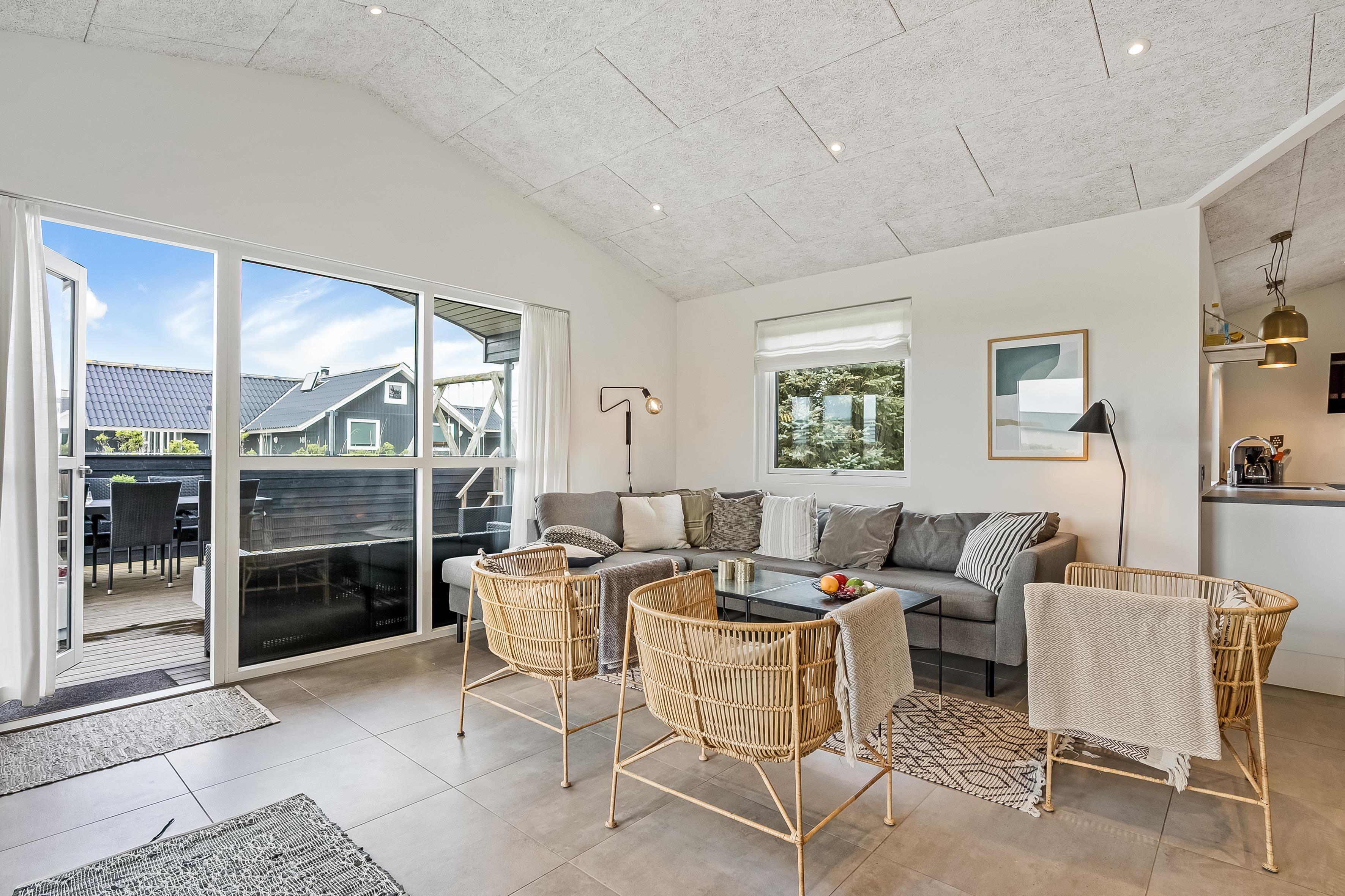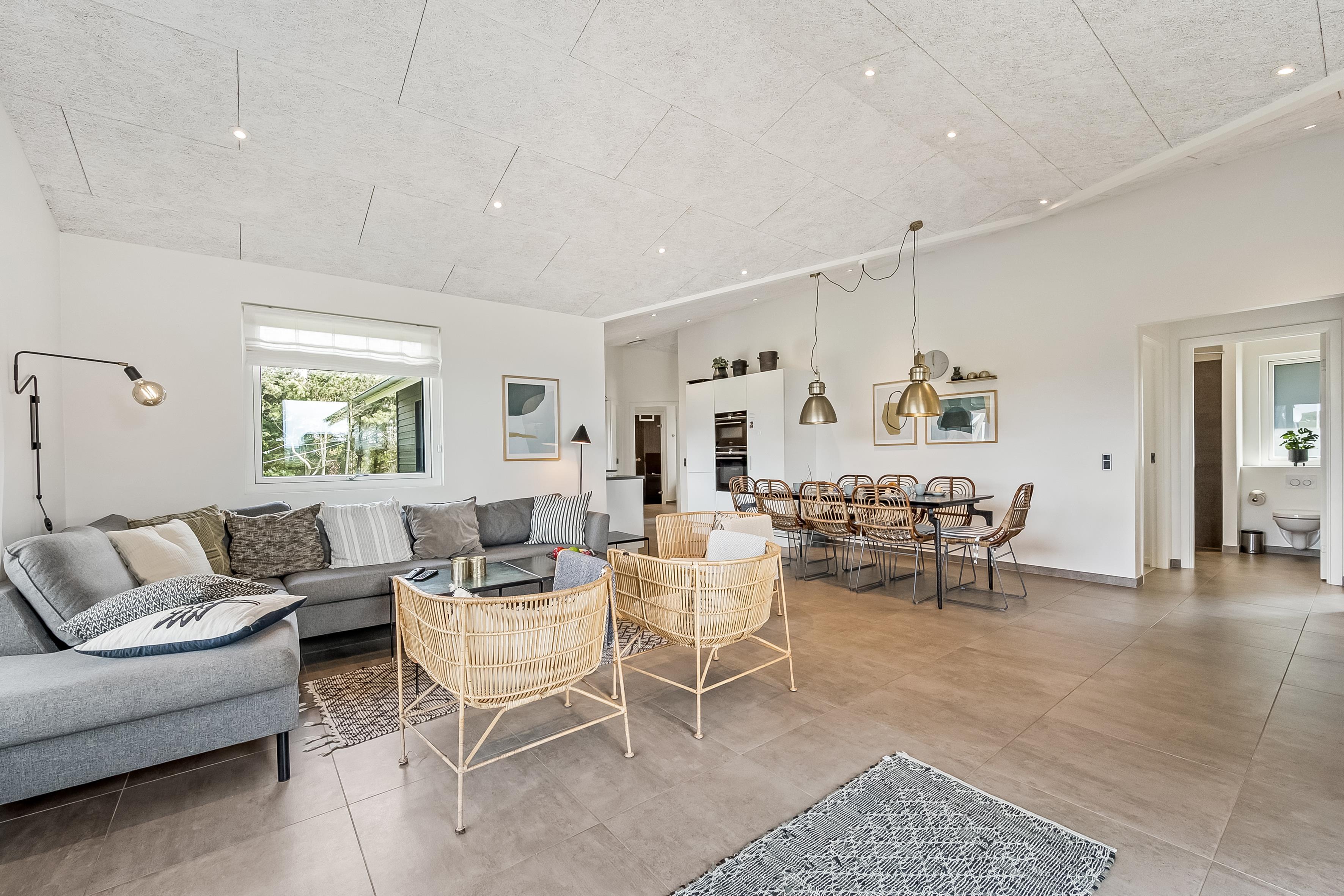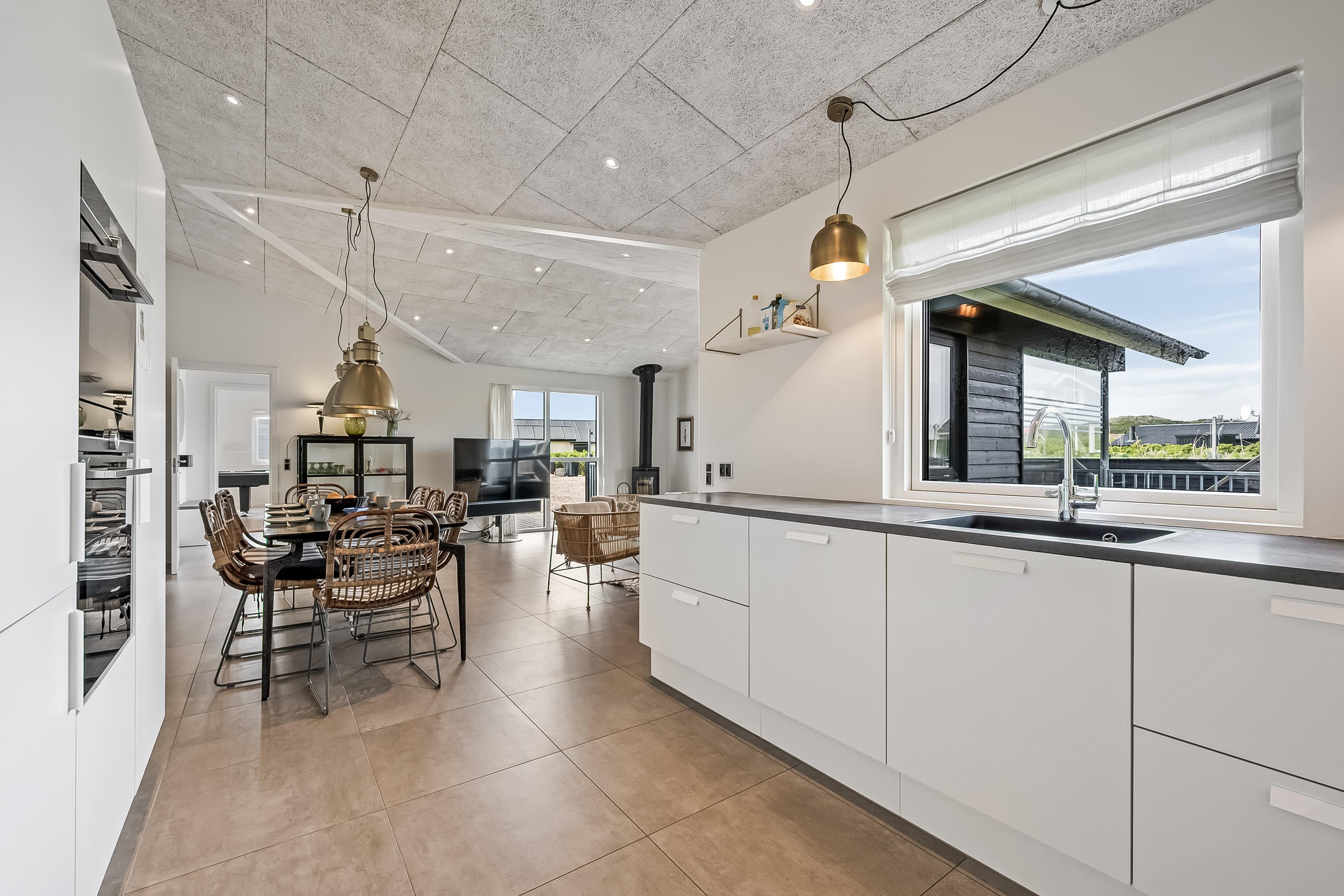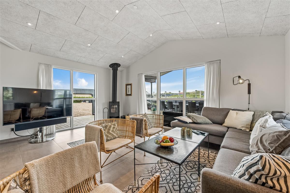 The holiday home accommodates 8 people, and the bright interior and modern furniture contribute to the stylish atmosphere. The large windows invite sunlight and the West Jutland landscape inside, and the classic wood-burning stove ensures a cozy atmosphere all year round.