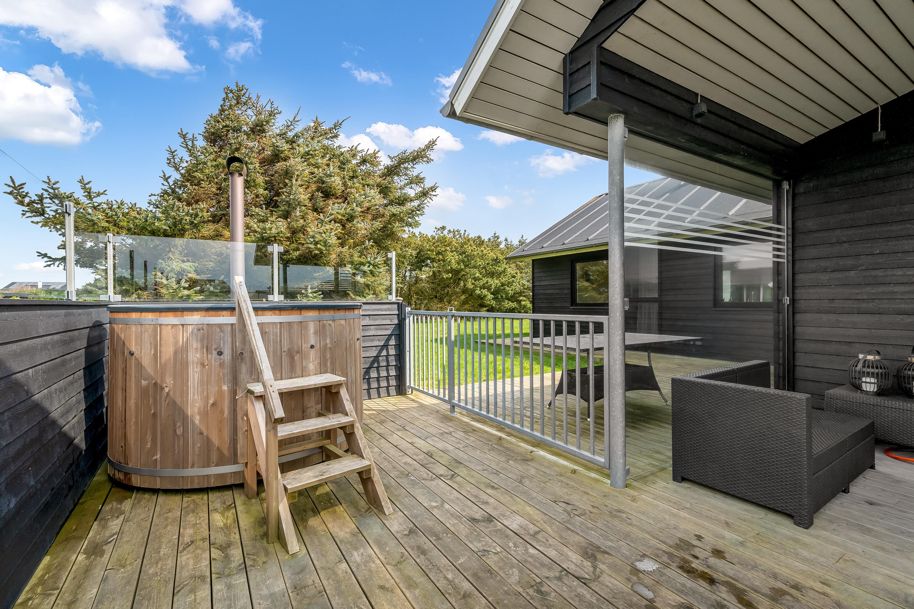 The terrace is also home to another of the holiday home's luxurious highlights – in addition to the indoor wellness oasis with sauna and hot tub, you can also enjoy an outdoor wilderness bath.