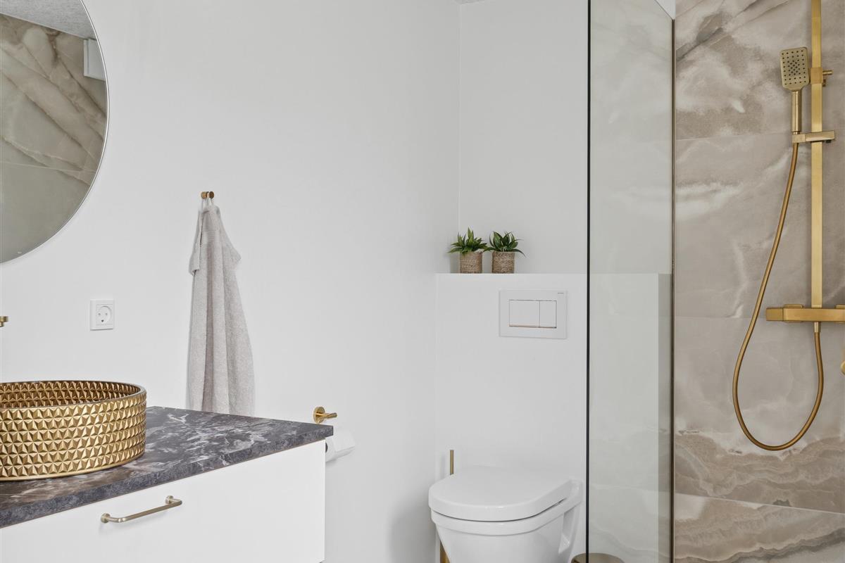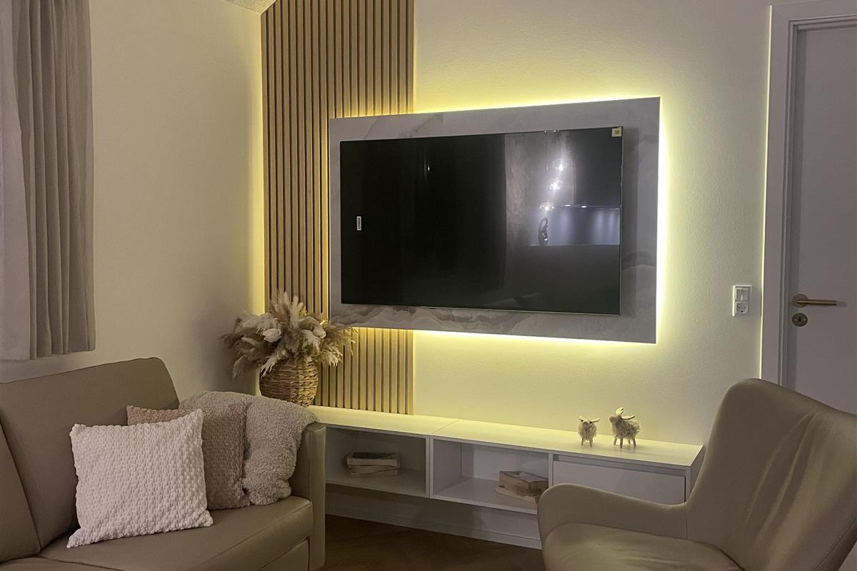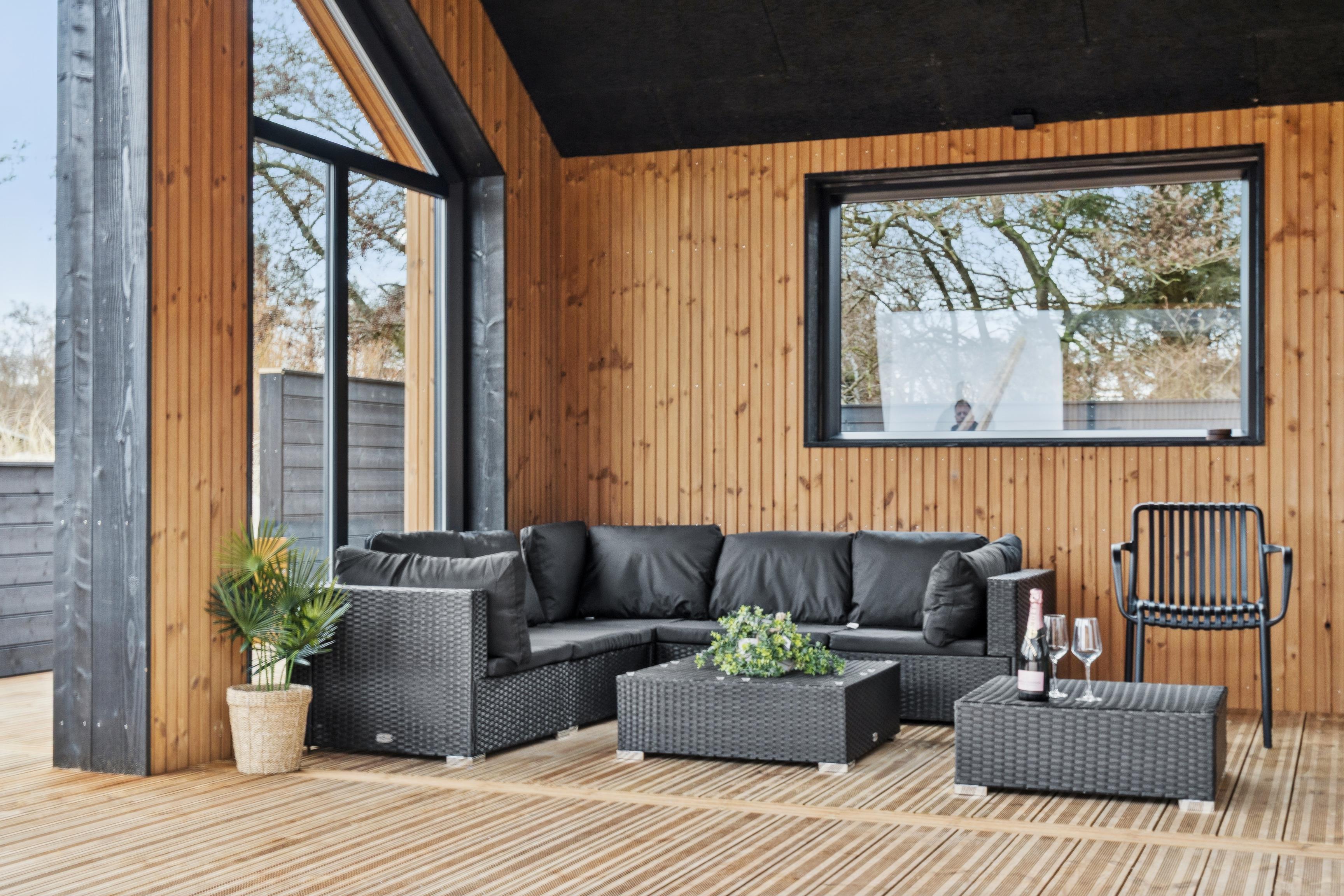 The large, enclosed, and private wooden terrace provides an exclusive outdoor living space and is partially covered. It features lounge areas, sun loungers, a gas grill, and a spacious dining area with seating for everyone, as well as several cozy seating spots throughout. The garden is designed with families in mind and includes a play tower with slide and swing, as well as a trampoline. The house is also dog-friendly, so the whole family can enjoy the holiday together.
