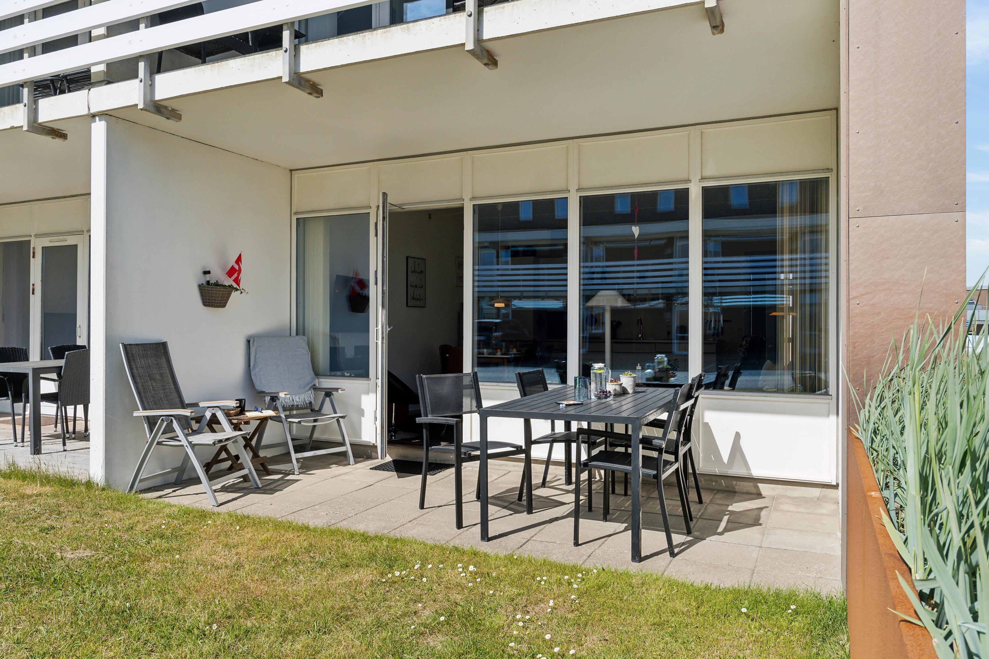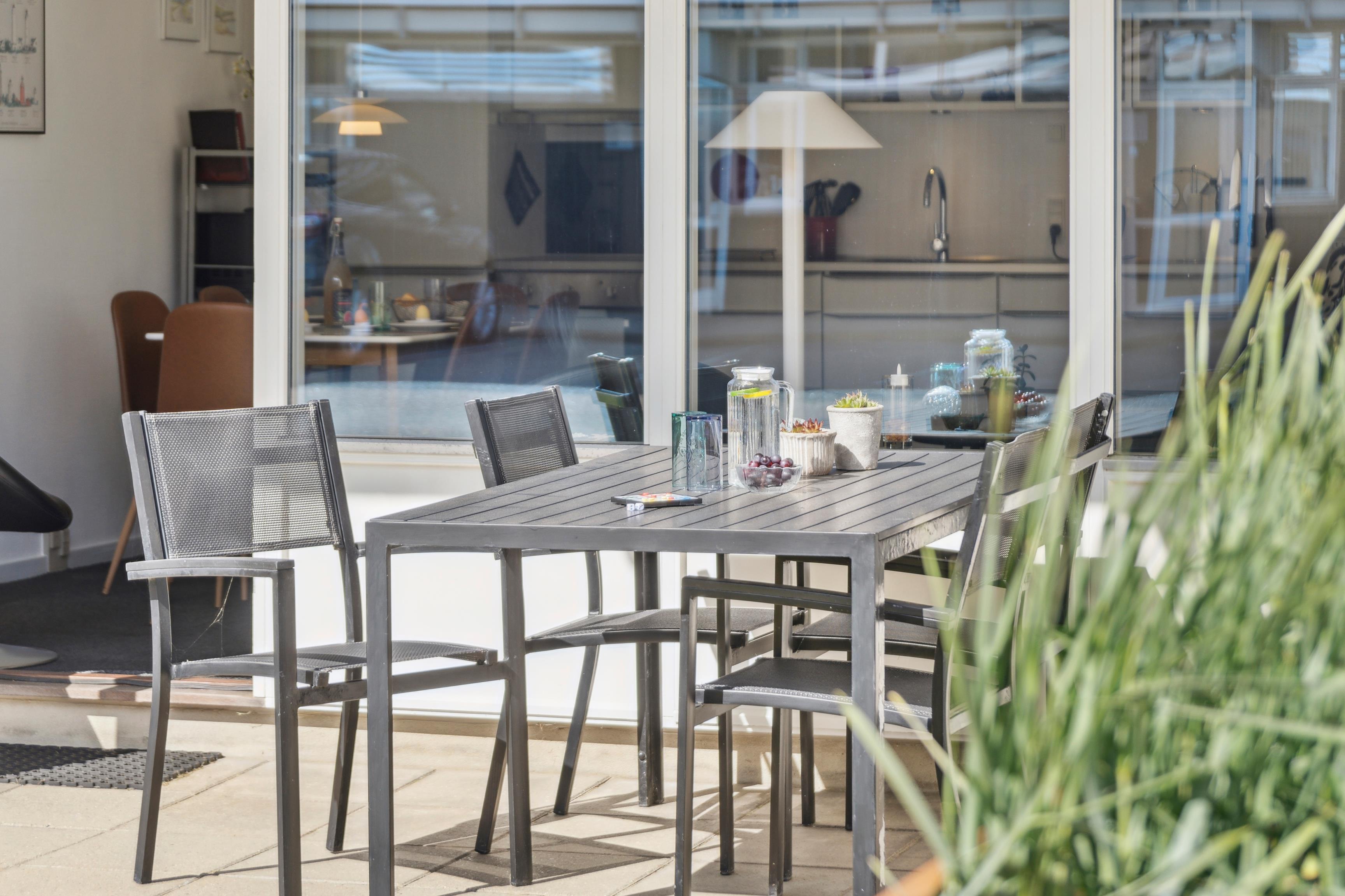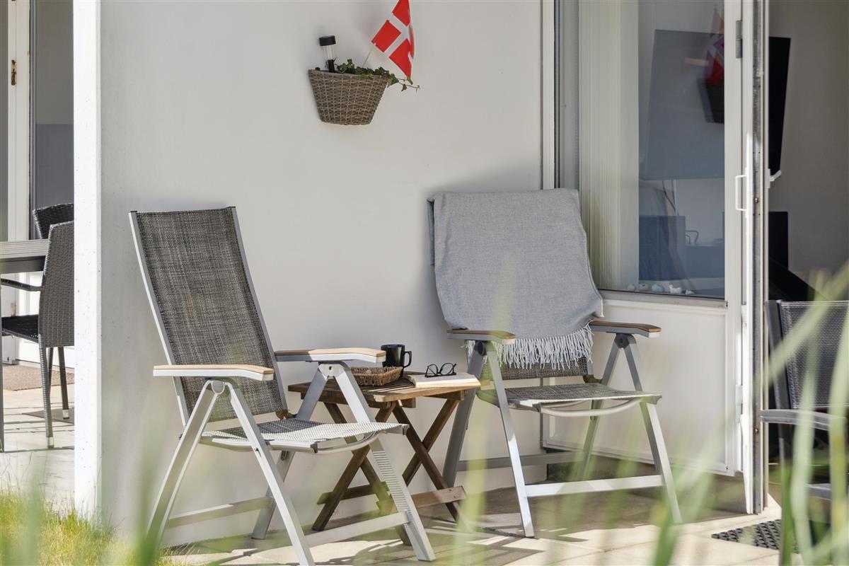 From the living room, you can step out onto the covered terrace, where you can sit in the garden furniture and enjoy holiday moments – perhaps with the sound of the waves as background music.