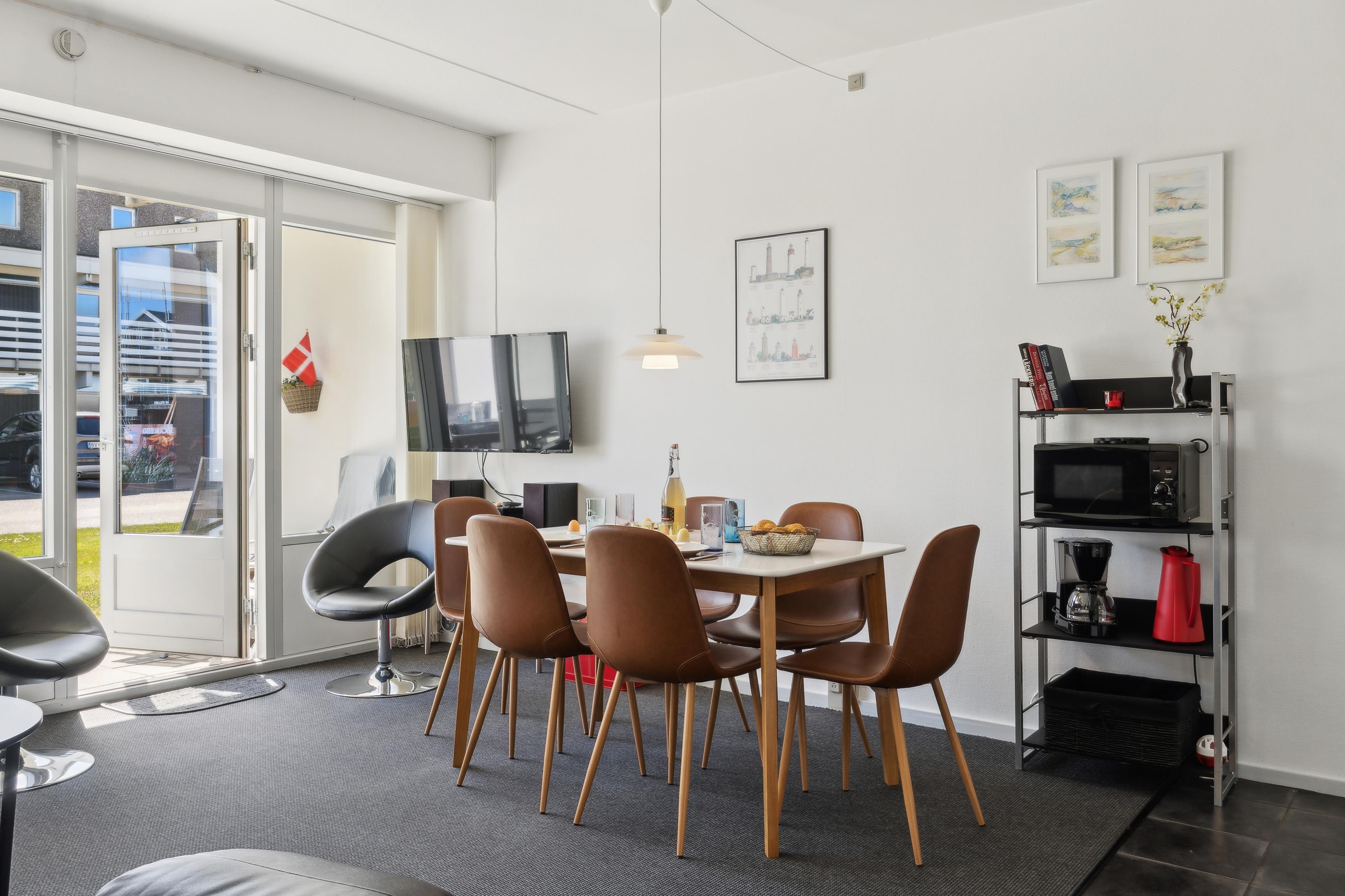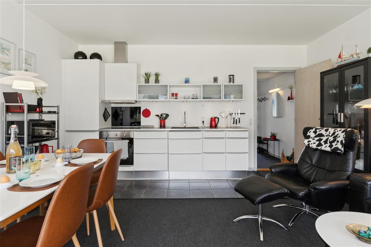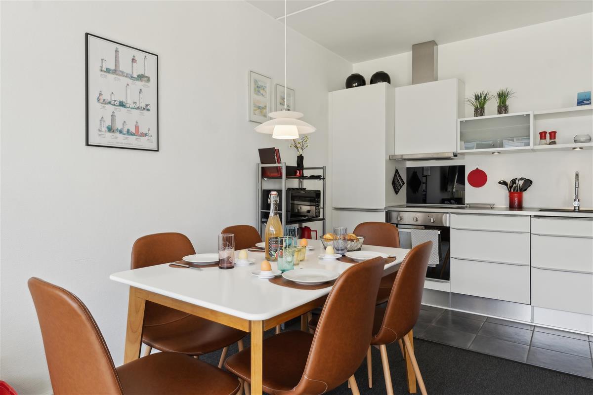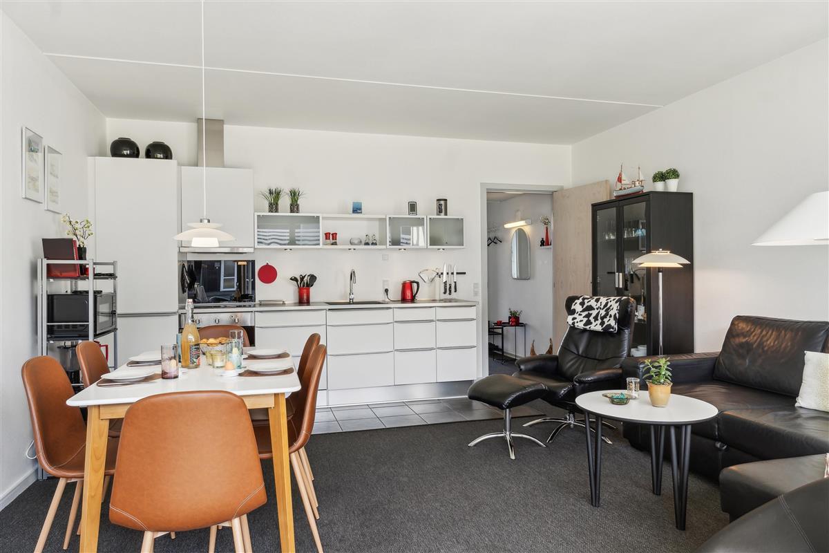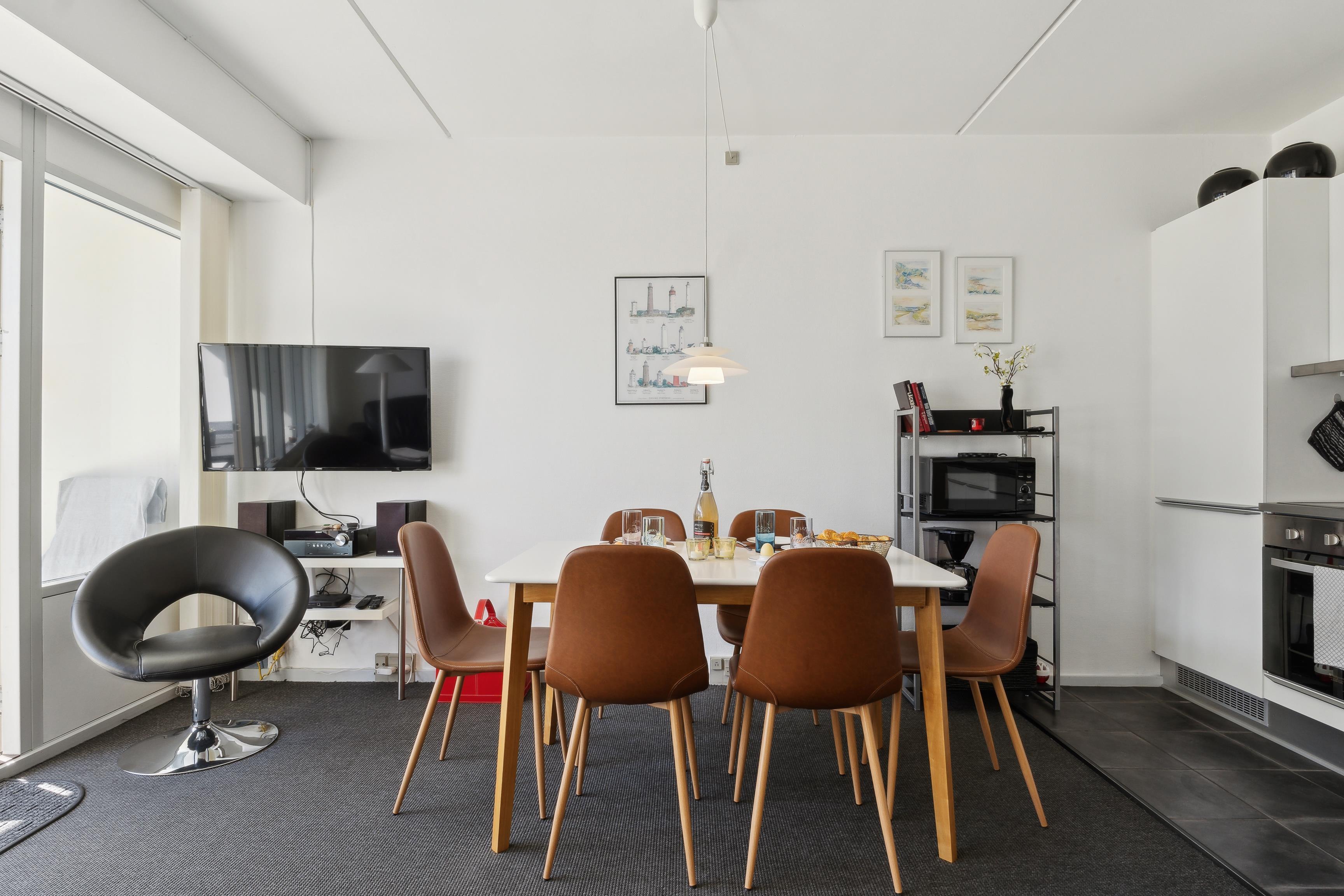 The apartment is 50 square meters, and the living room serves as the heart of your holiday stay. The kitchen, living room, and dining area are all combined, so you have plenty of opportunities to spend time together – whether you're cooking, playing games, or just relaxing. The kitchen is well-equipped, and once the meal is ready, you can be glad that there is a dishwasher to take care of the cleaning.