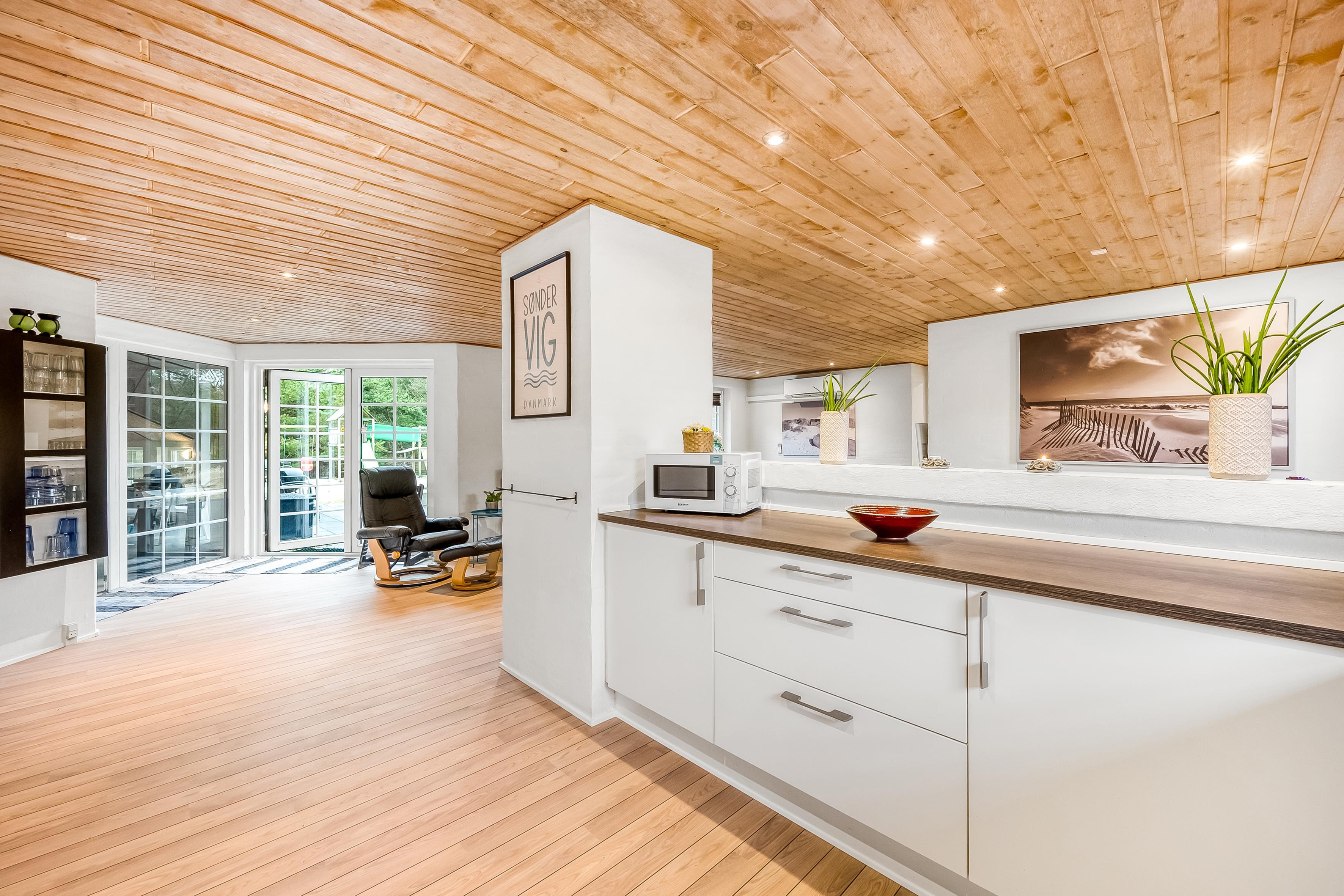 The well-equipped kitchen-dining area is a social focal point where you can prepare delicious meals. The kitchen is equipped with modern amenities, including a dishwasher, oven, 4 ceramic hobs, microwave, and a refrigerator with a 94-liter freezer. The wood-burning stove adds coziness and warmth to the space.