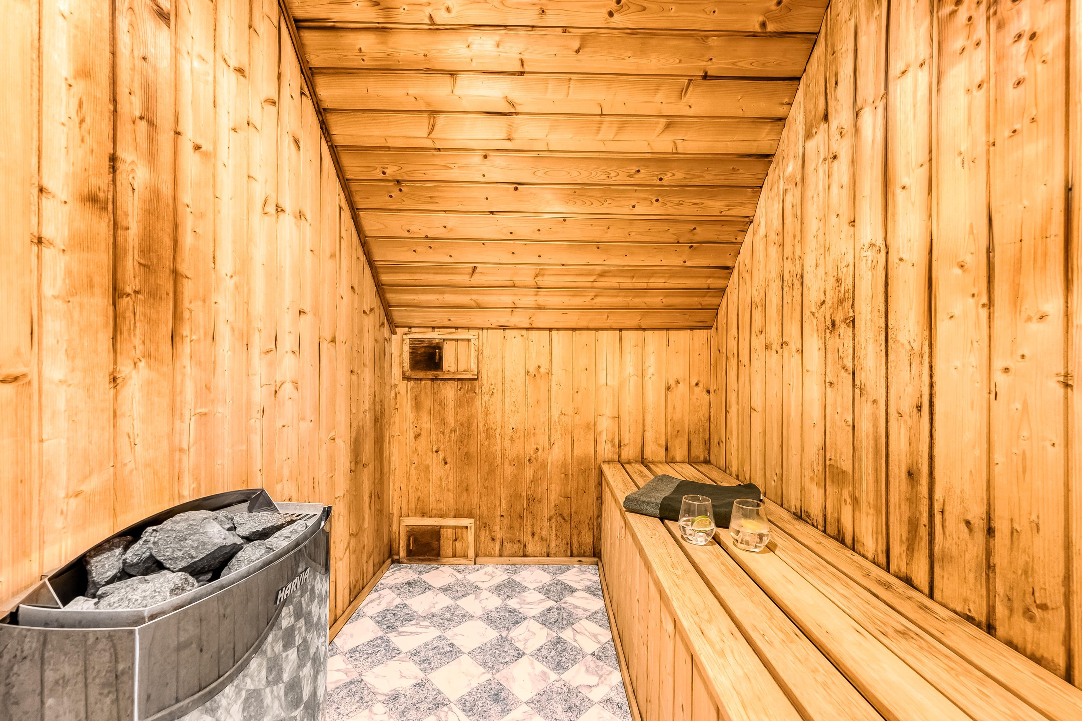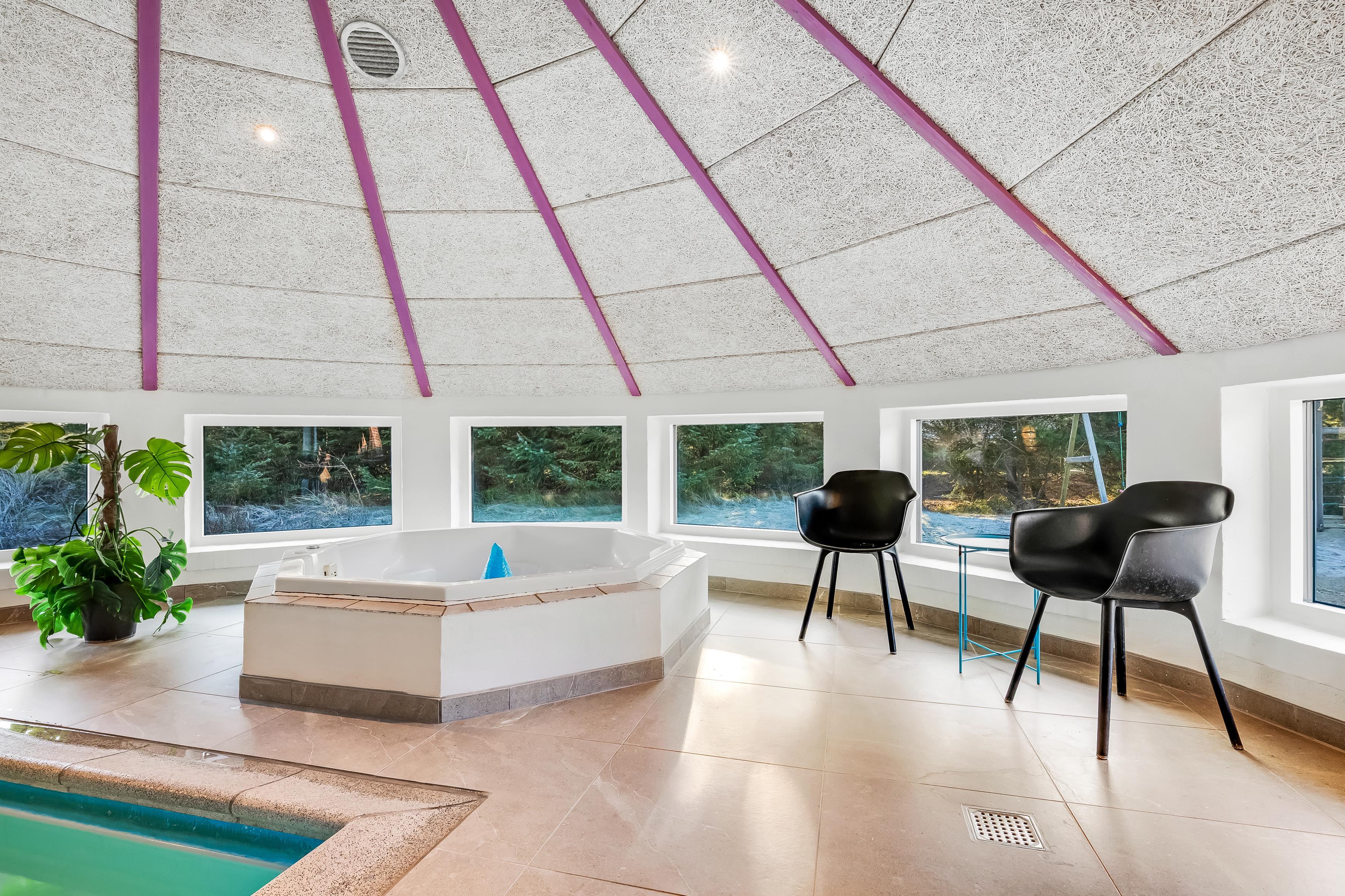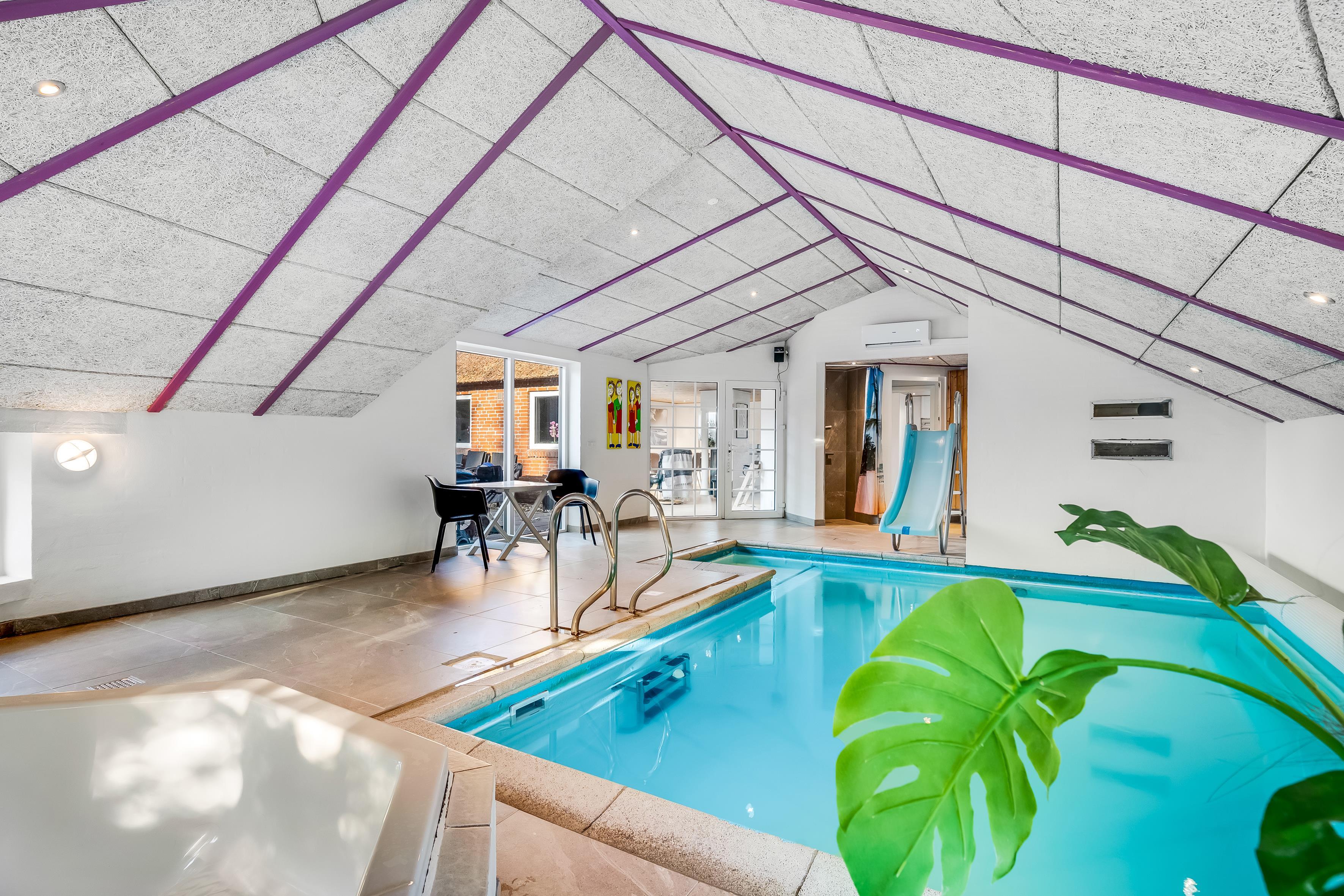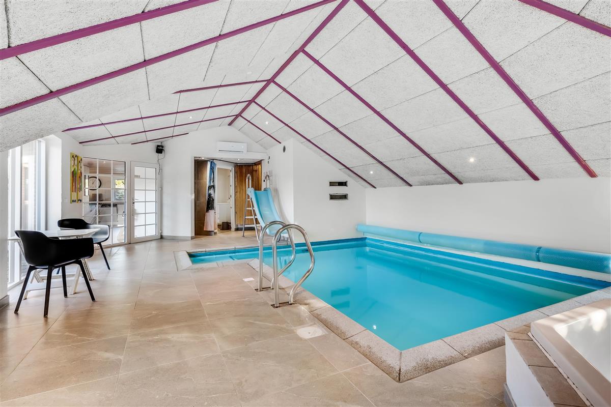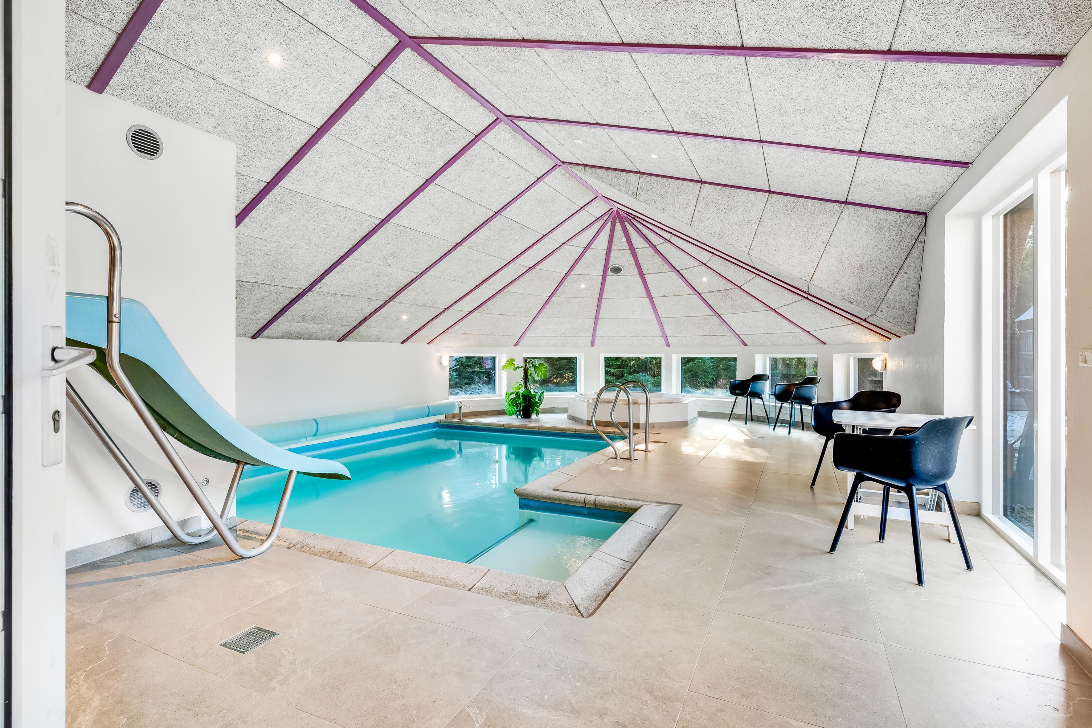Enjoy your private oasis with a large pool area adorned with an impressive curved window, allowing plenty of natural light to flow in. The pool, spanning over 20 square meters, is equipped with a fun water slide that will entertain both children and adults. Relax in the 4-person hot tub or indulge in the sauna after a day of activities.