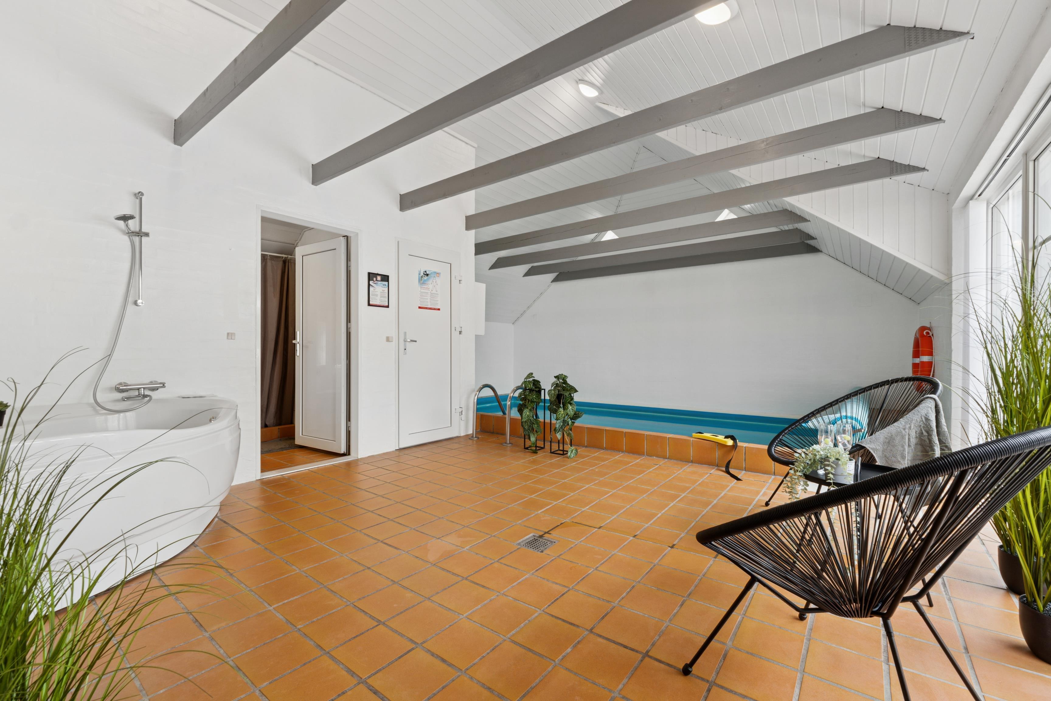 Are you dreaming of a holiday where relaxation and nature go hand in hand? This beautiful pool house at Wolle Friks Vej 33 in Søndervig is designed for you, whether you are traveling as a large family or several couples of friends. Here, you’ll enjoy a unique combination of private wellness and comfort – located on a secluded dune plot only 800 meters from one of Denmark’s most beautiful sandy beaches.