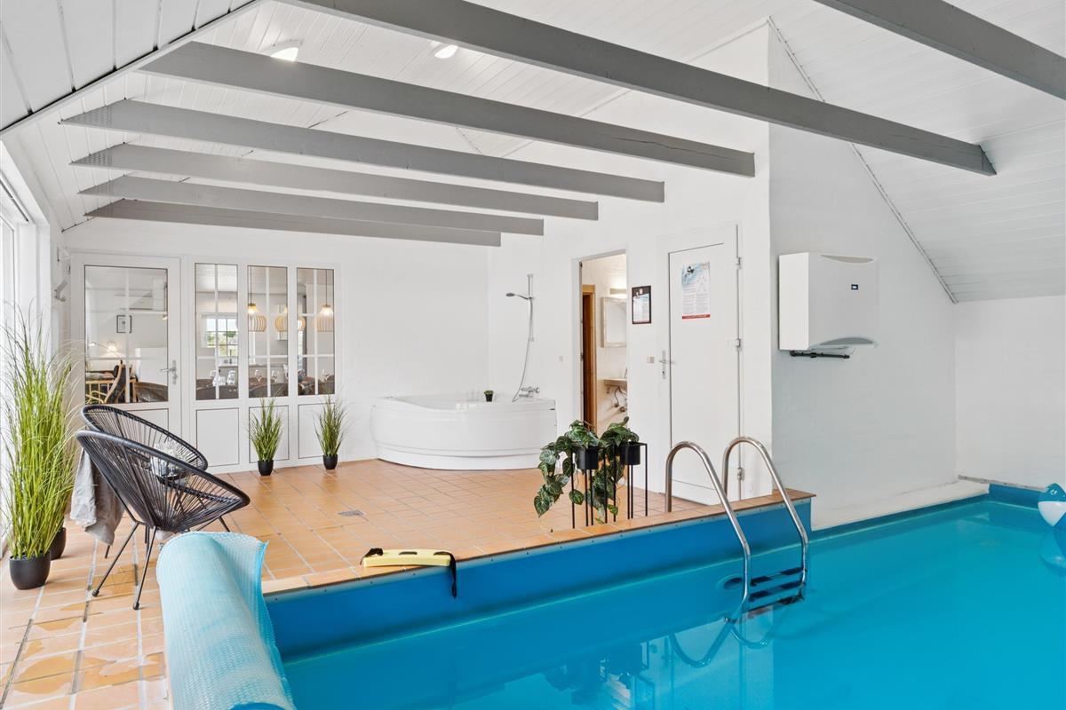 The pool area is an experience in itself and serves as your very own wellness oasis. Here you can take a refreshing swim in the large pool (5.5 x 4.0 x 1.5 meters), which also has a counter-current system for swim training. You can let the bubbles of the spa bath soothe your body or enjoy the warmth of the sauna. Large panoramic windows let in beautiful light and provide views of the terrace and surrounding nature.