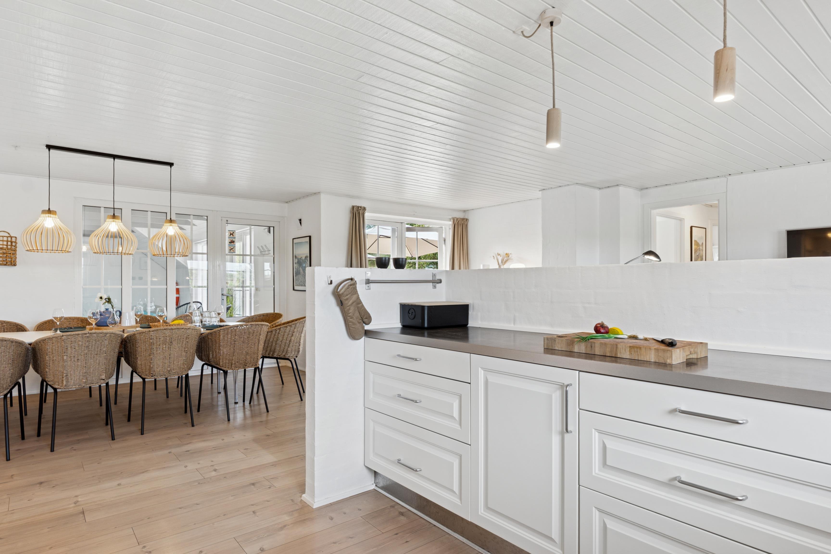 The holiday home is furnished with a focus on both togetherness and comfort. At the heart of the house, you’ll find a spacious living room in open connection with the kitchen, offering plenty of room for socializing, cozy dinners, and relaxation by the wood-burning stove. The living room is equipped with a flat-screen TV, satellite, and Playstation, and large windows provide direct access to the terrace and pool area. The kitchen is modern and functional with everything you need – including a dishwasher, microwave, and large freezer – making holiday meals easy to prepare.