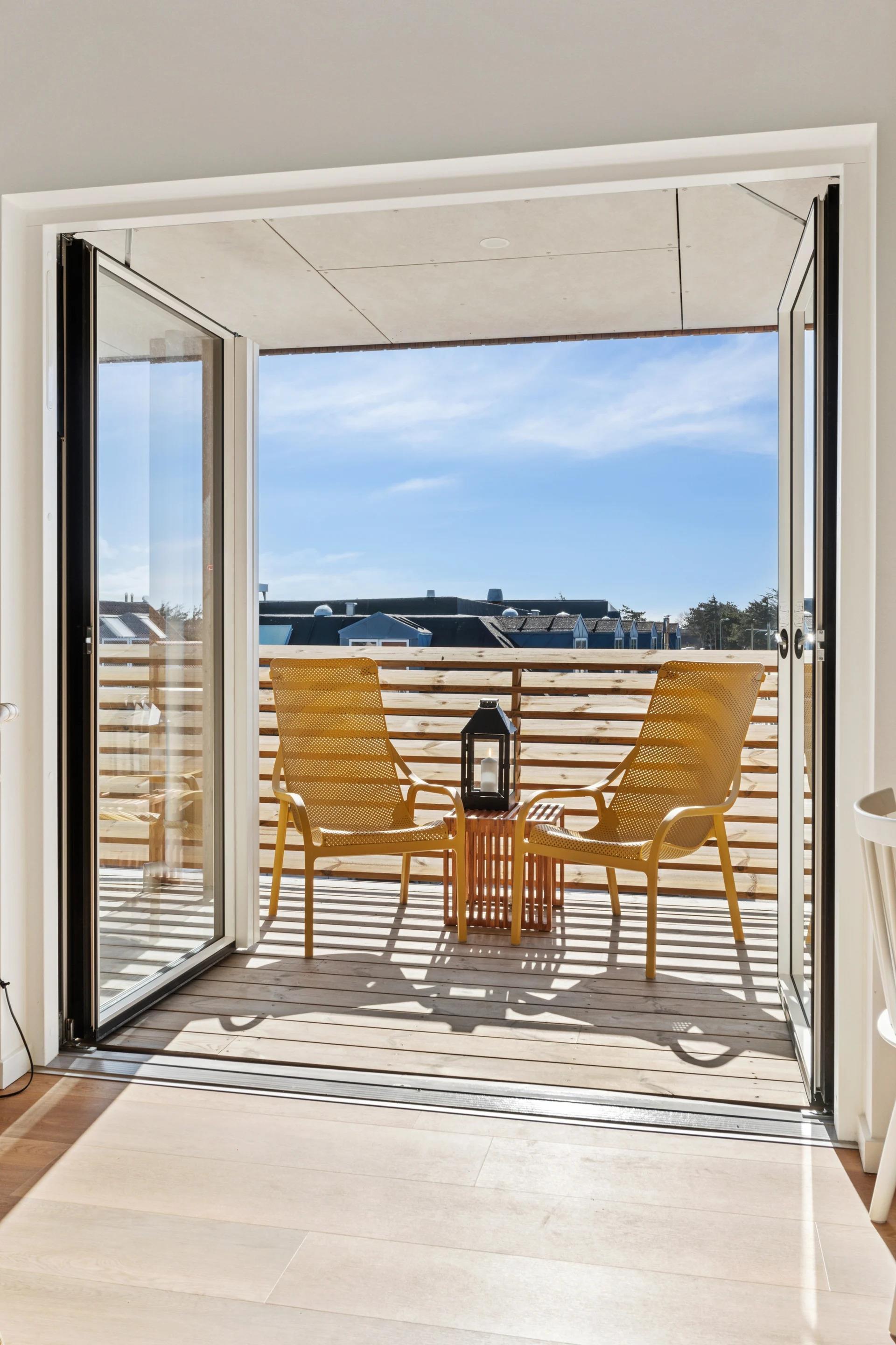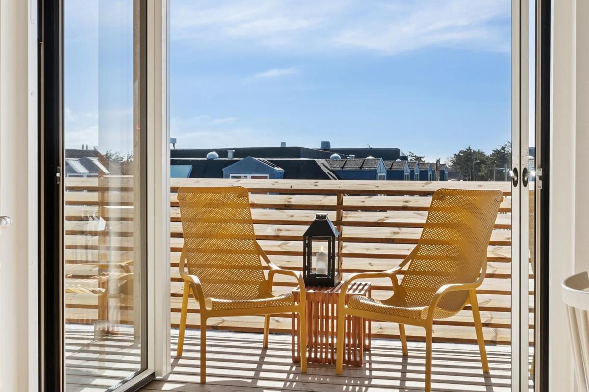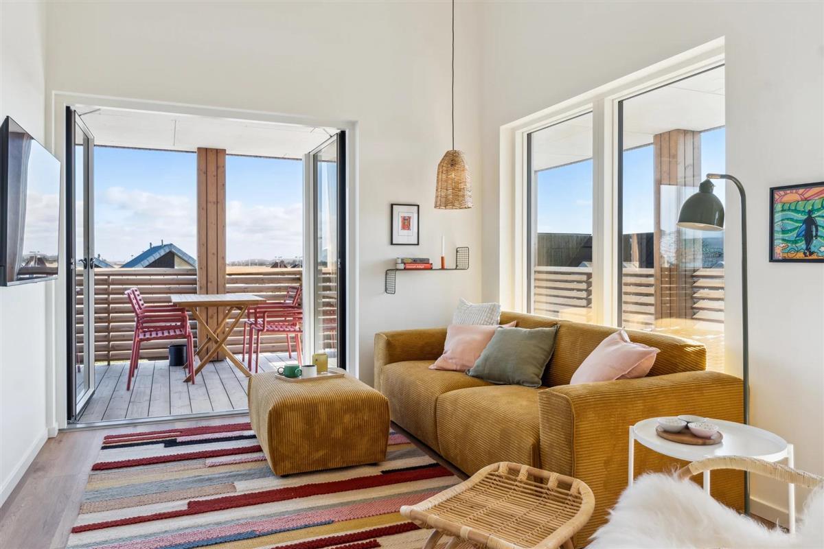 The apartment is on the first floor and offers bright and inviting high-quality furnishings. It consists of two bedrooms with comfortable beds, a modern bathroom with underfloor heating and an open-plan, fully equipped kitchen with dishwasher. The kitchen flows seamlessly into the living room, where you will find a smart TV with streaming services and free Wi-Fi – perfect for cosy evenings at home. From the living room, you have direct access to a sunny balcony with garden furniture, where you can enjoy both your morning coffee and the evening sun. From the 35 m² balcony, 18 m² of which is covered, you have a beautiful view over Ringkøbing Fjord.
