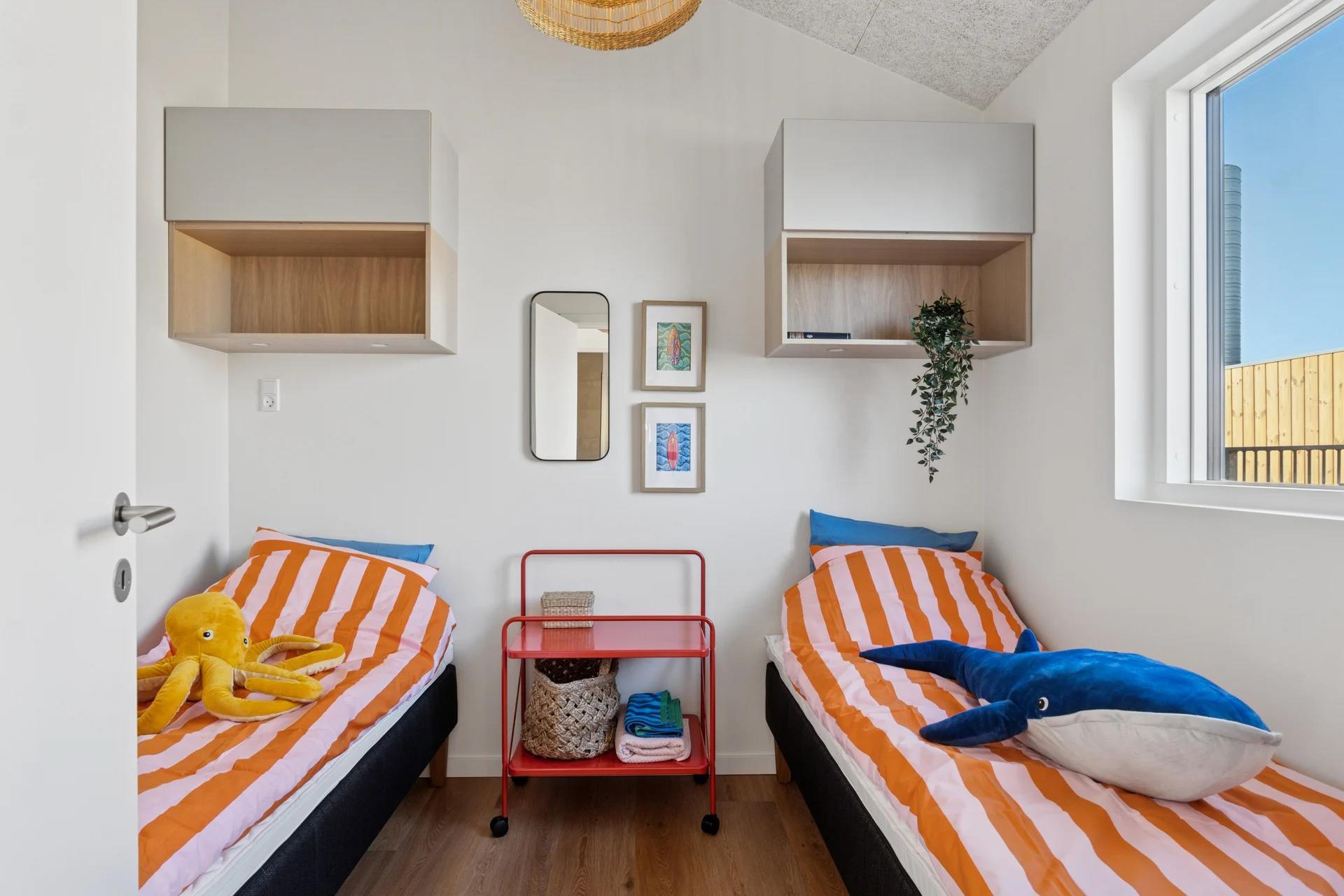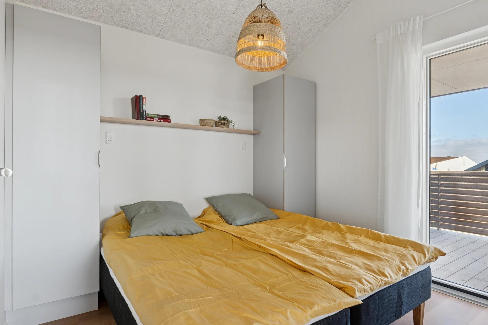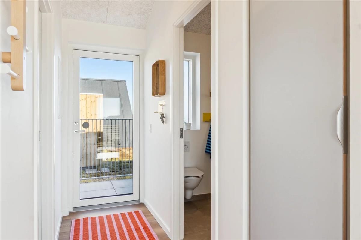 The apartment is on the first floor and offers bright and inviting high-quality furnishings. It consists of two bedrooms with comfortable beds, a modern bathroom with underfloor heating and an open-plan, fully equipped kitchen with dishwasher. The kitchen flows seamlessly into the living room, where you will find a smart TV with streaming services and free Wi-Fi – perfect for cosy evenings at home. From the living room, you have direct access to a sunny balcony with garden furniture, where you can enjoy both your morning coffee and the evening sun. From the 35 m² balcony, 18 m² of which is covered, you have a beautiful view over Ringkøbing Fjord.