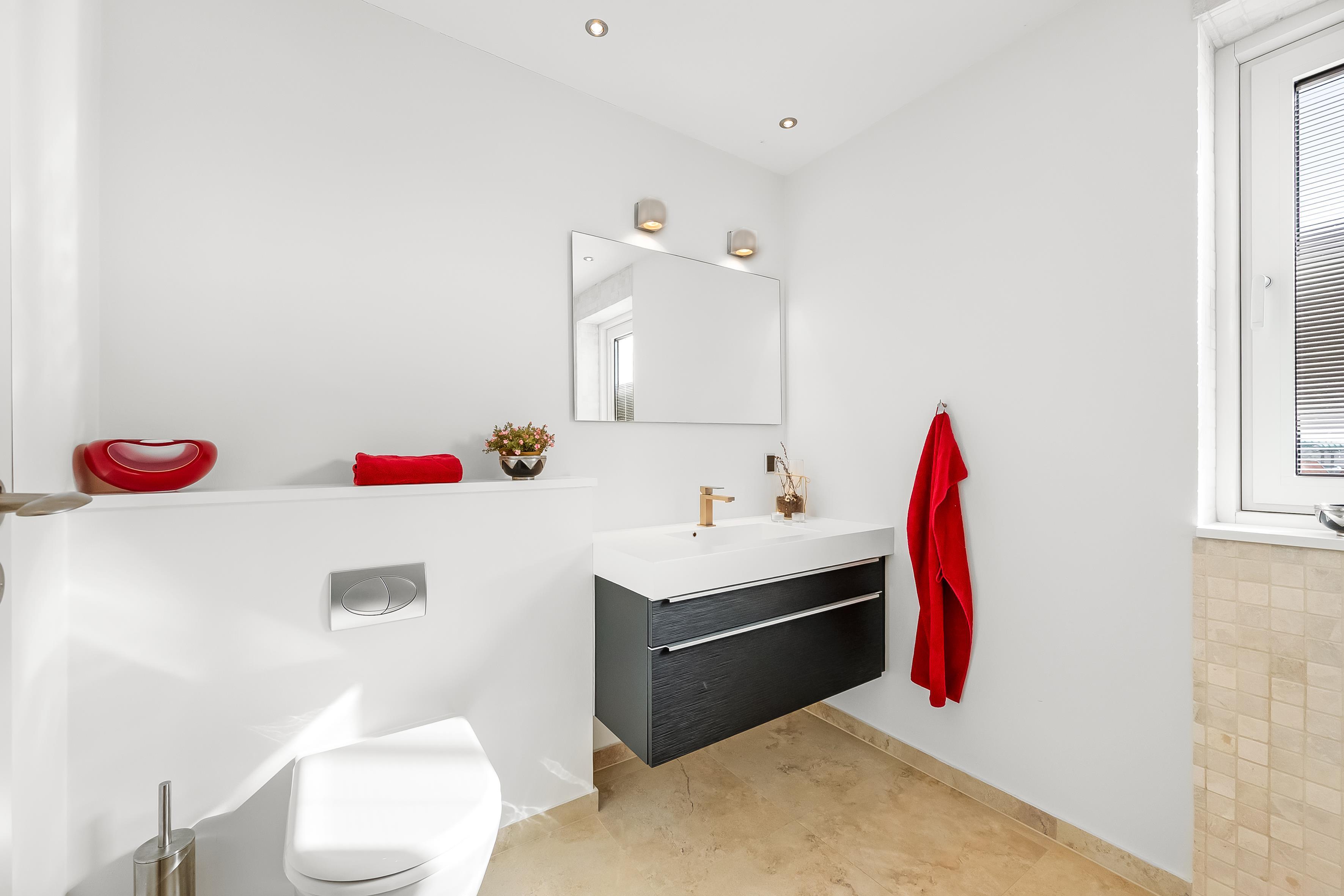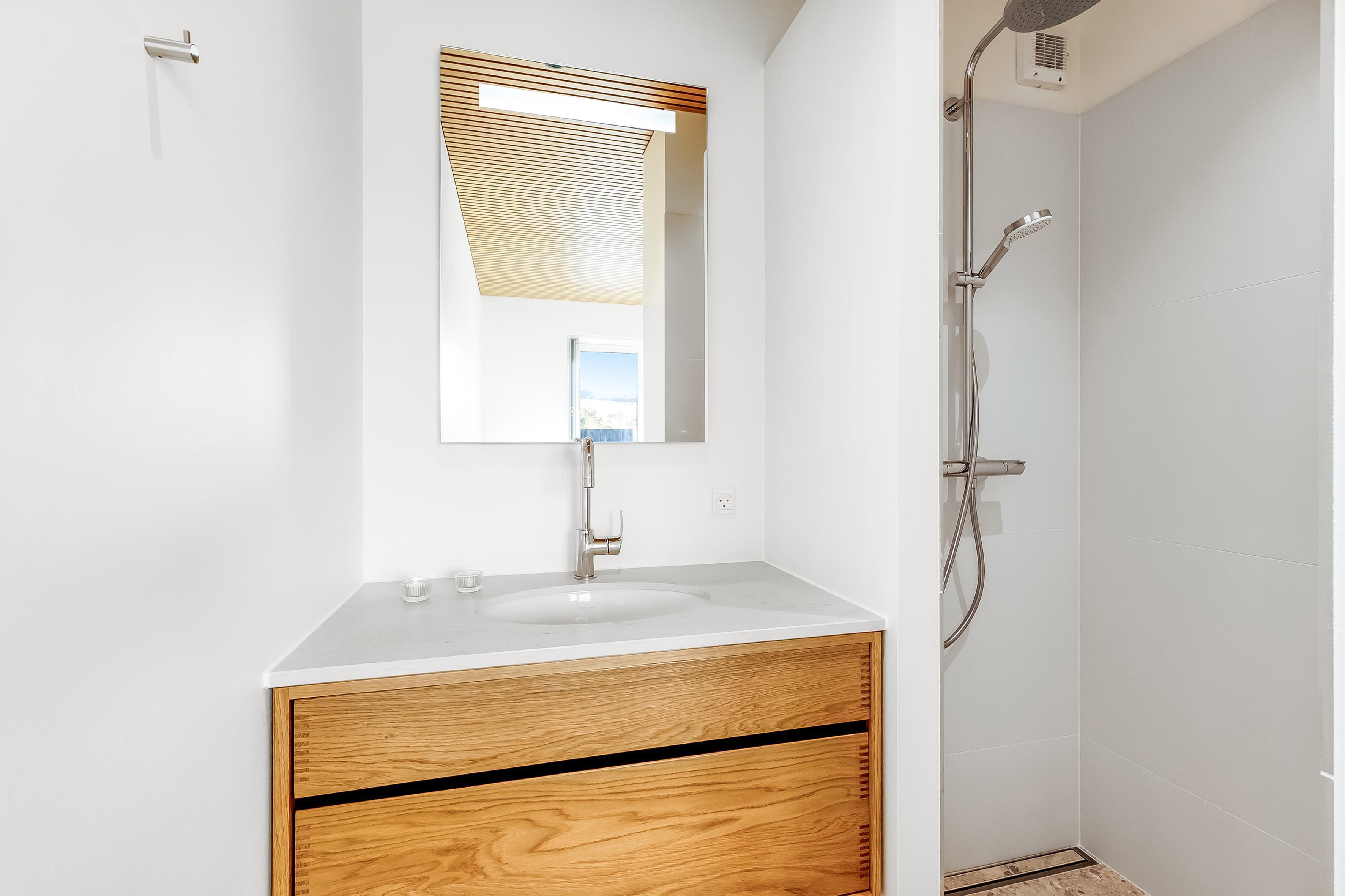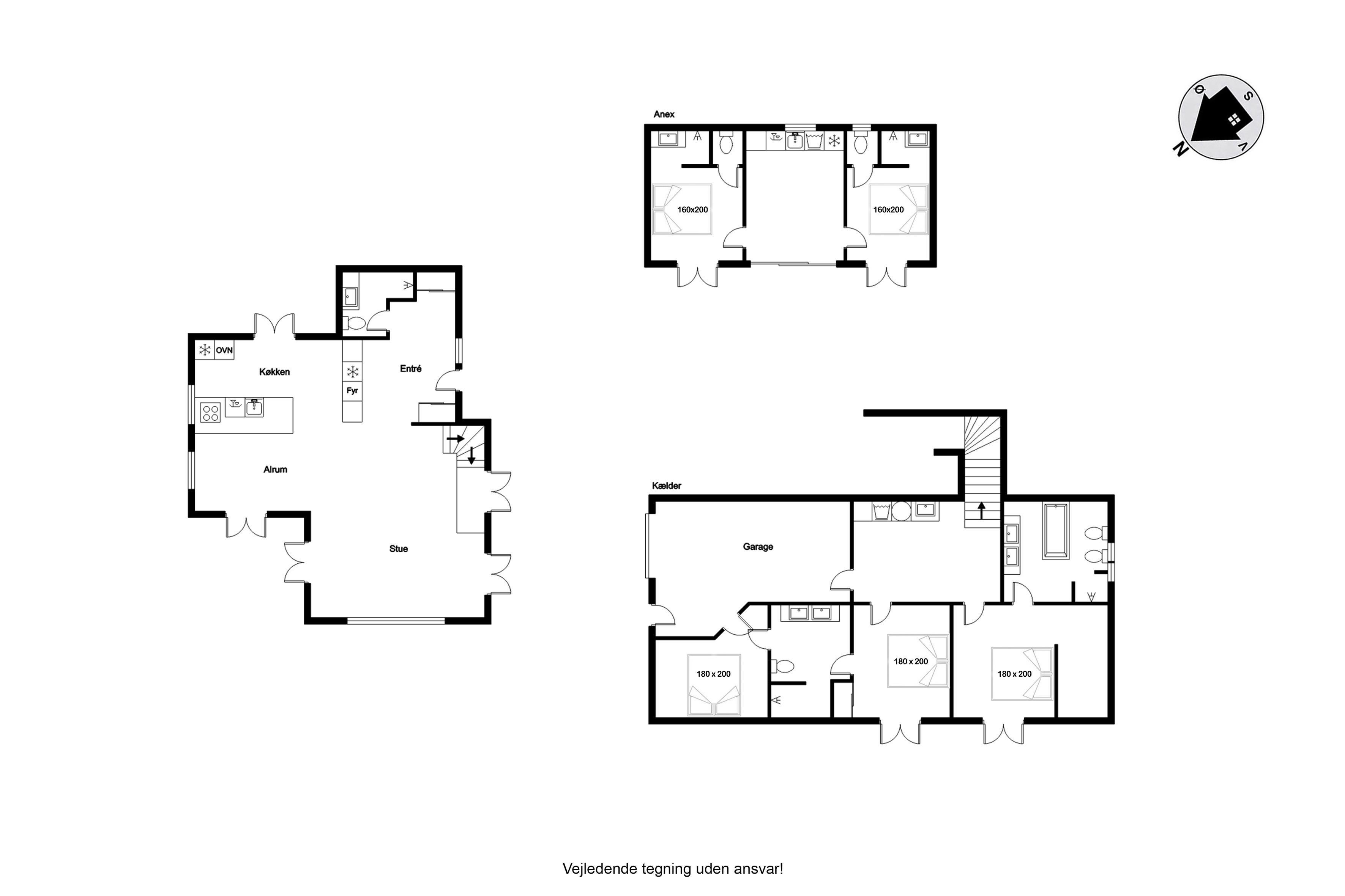 This spacious holiday home spans 240 m² and offers three luxurious bedrooms in the main house, all furnished with comfortable double beds. One bedroom has an en-suite bathroom with a shower and bathtub, as well as a walk-in wardrobe, while the other two share a large bathroom with a shower. The entire house features underfloor heating, powered by an energy-efficient heat pump, ensuring optimal comfort year-round. The separate guest house contains two additional bedrooms, each with its own toilet and shower. A shared living area includes a kitchenette with a refrigerator, wine cooler, and dishwasher; however, cooking is not permitted in this kitchenette.