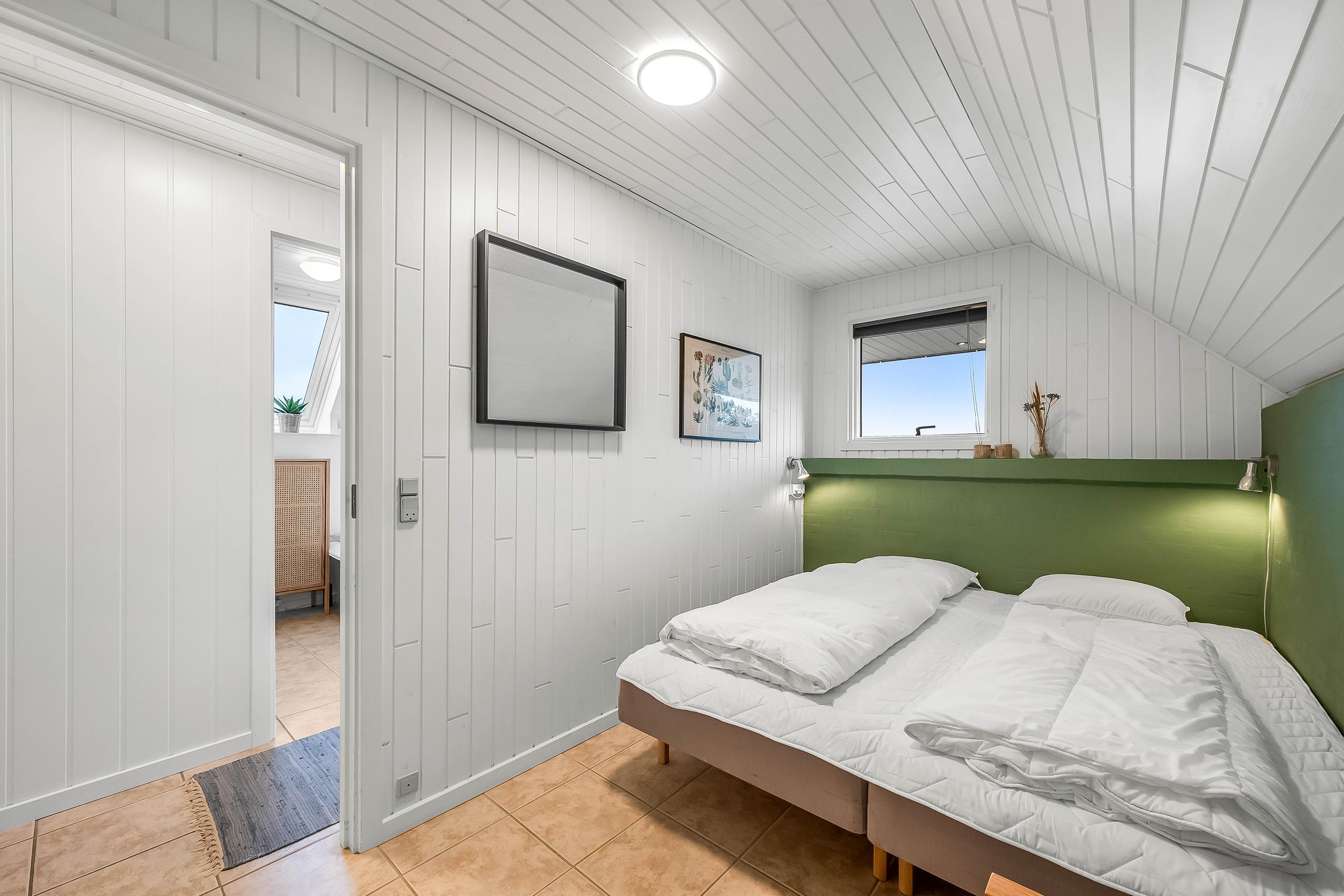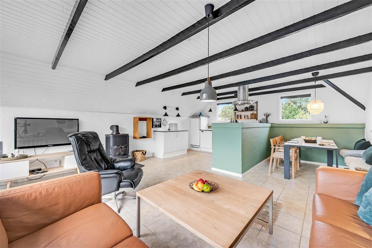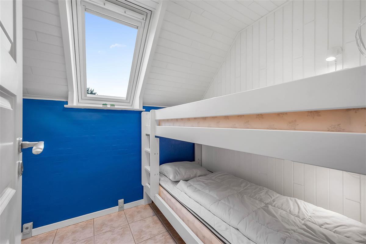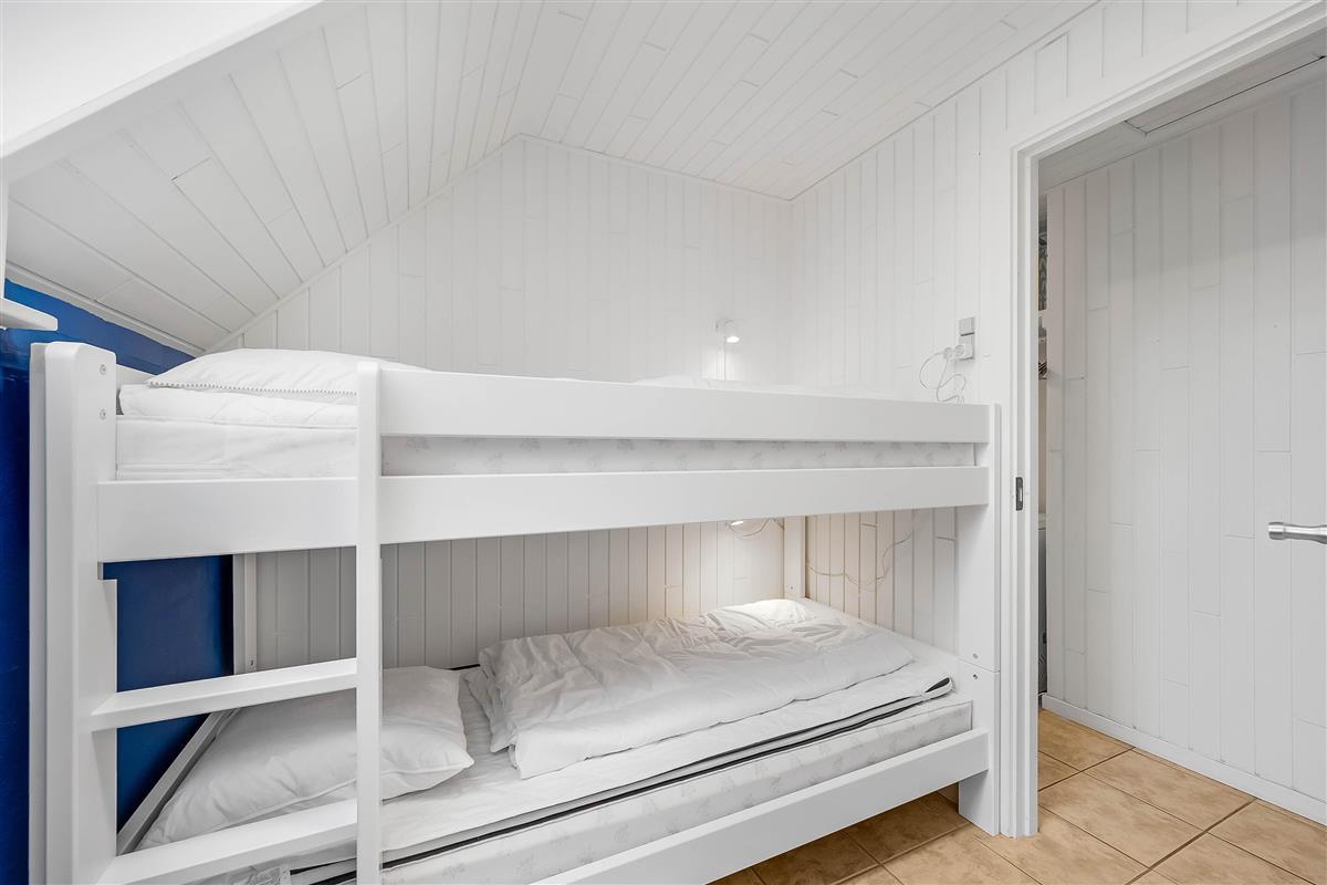 The heart of the house is the combined living/dining room with kitchen and large windows, creating a bright and airy atmosphere. The kitchen is equipped with a stove, dishwasher and a 100-litre refrigerator with a small freezer compartment. There is one bedroom with a double bed, one with two single beds and one with a bunk bed.