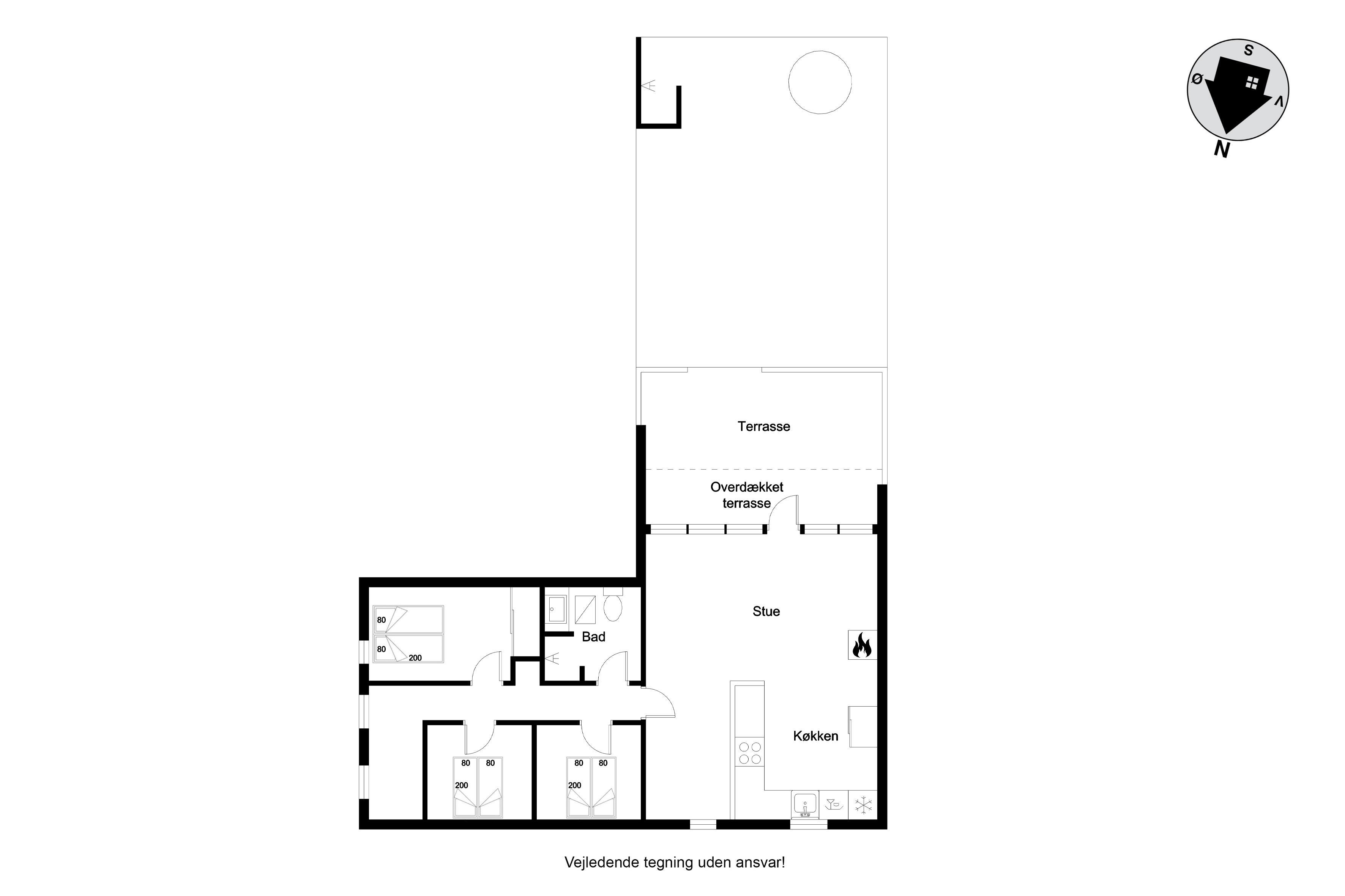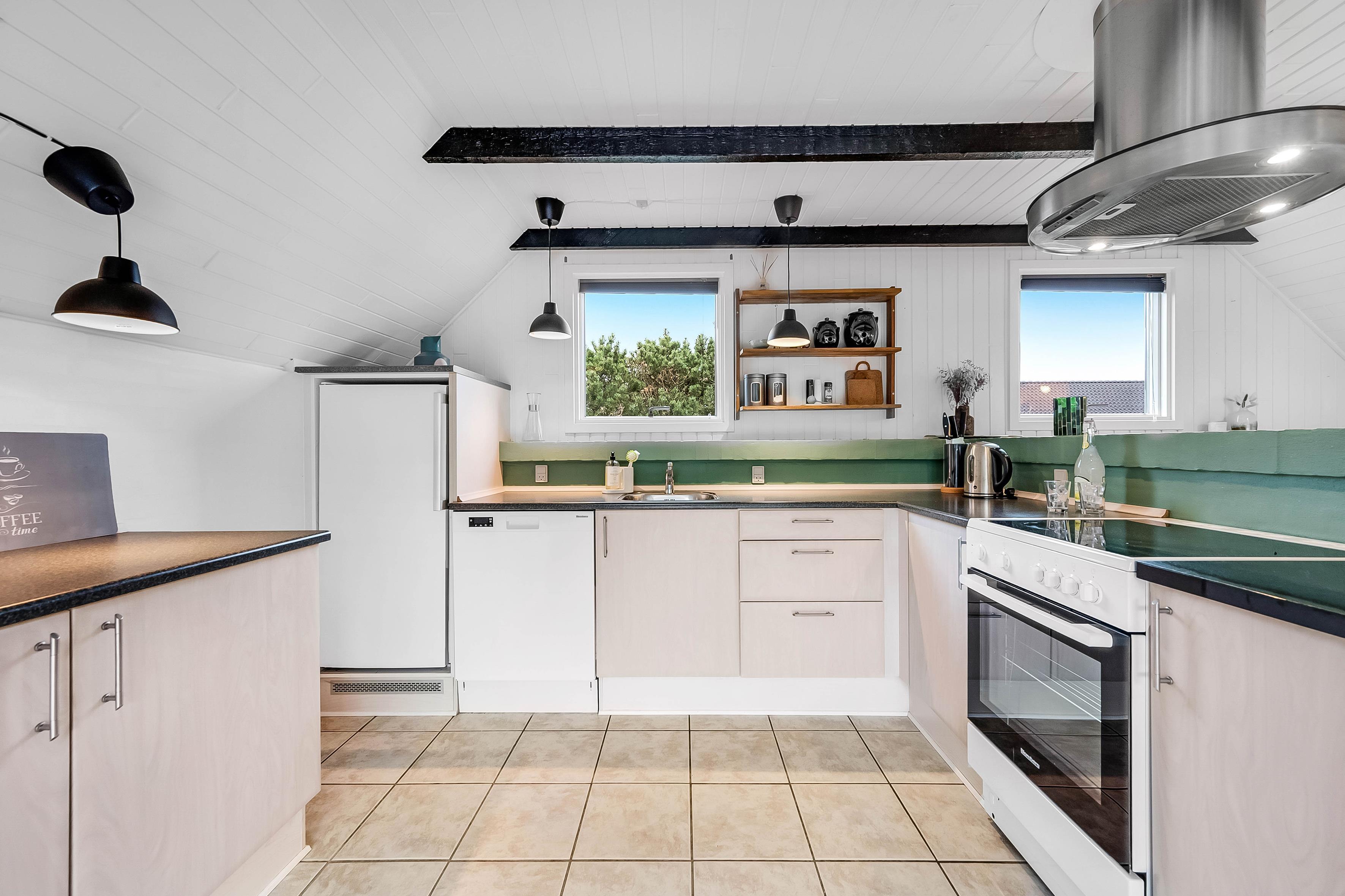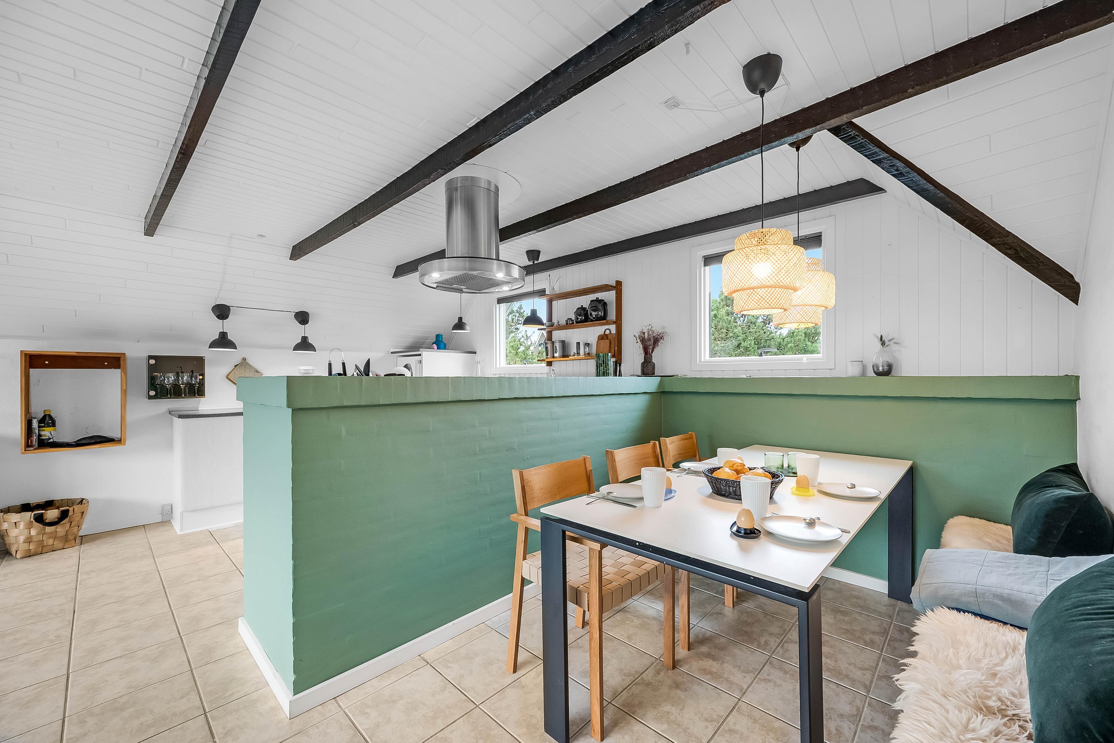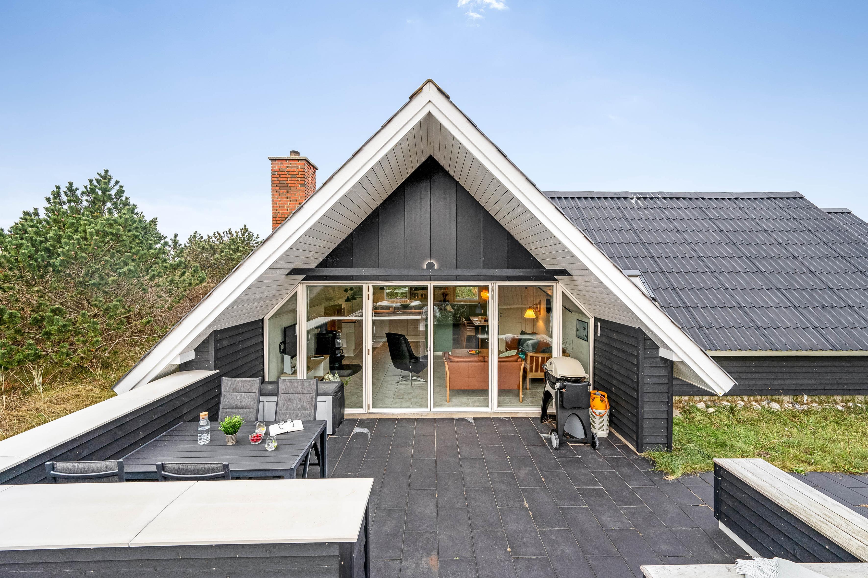 The heart of the house is the combined living/dining room with kitchen and large windows, creating a bright and airy atmosphere. The kitchen is equipped with a stove, dishwasher and a 100-litre refrigerator with a small freezer compartment. There is one bedroom with a double bed, one with two single beds and one with a bunk bed.