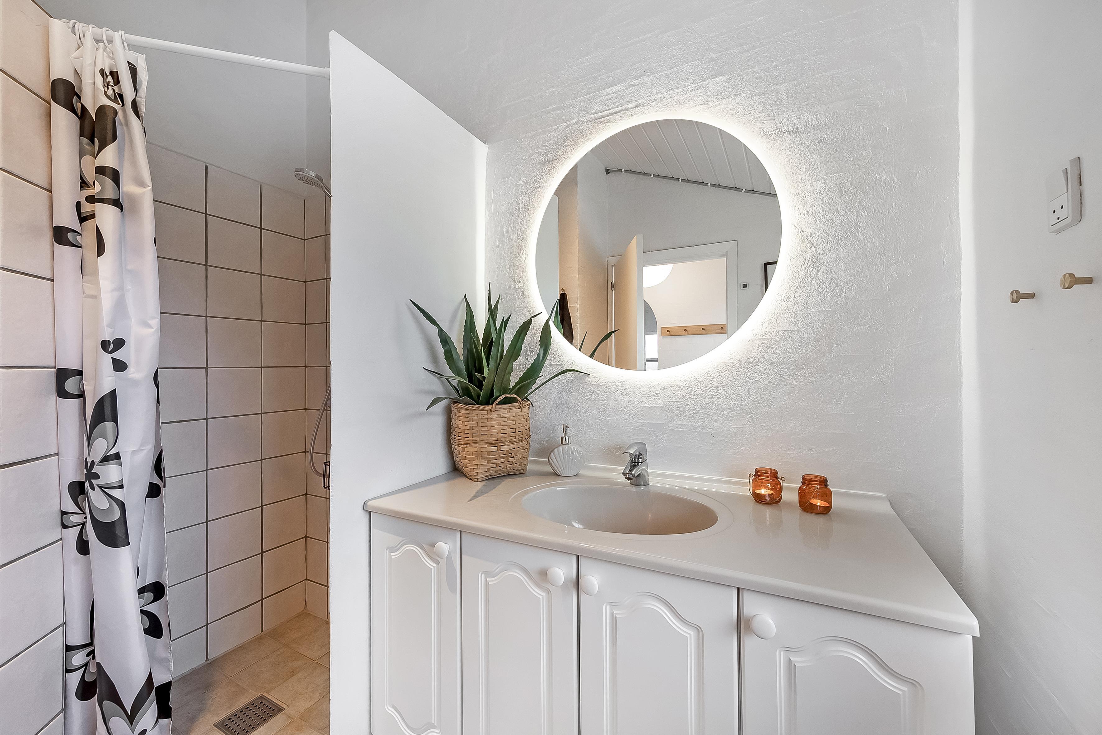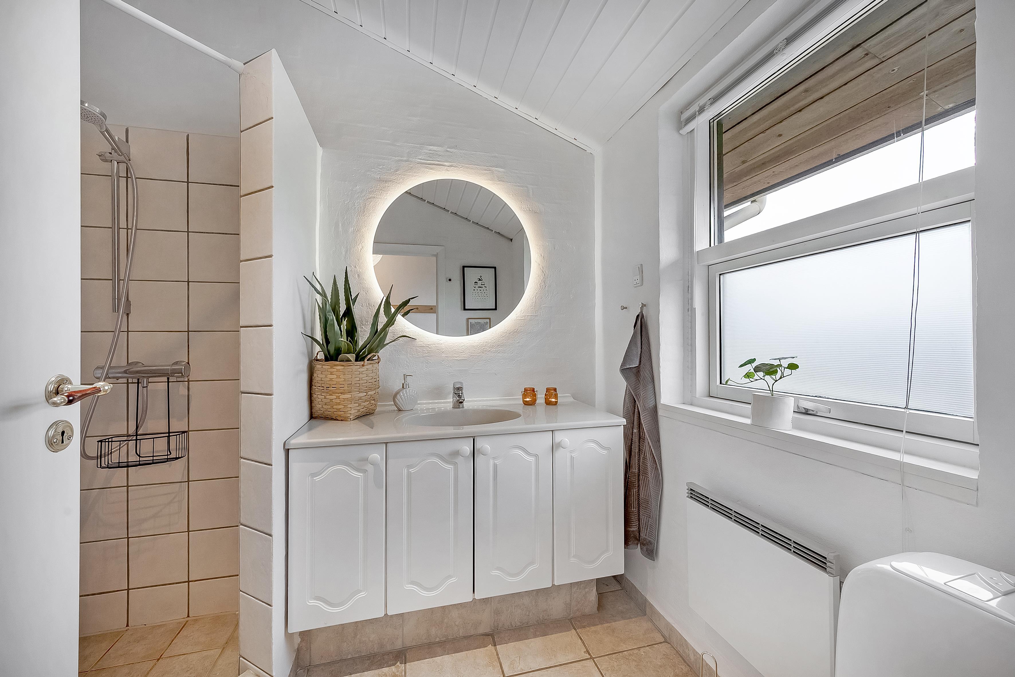 The modern bathroom is equipped with both toilet, shower and underfloor heating, ensuring a comfortable experience, even on cold days.